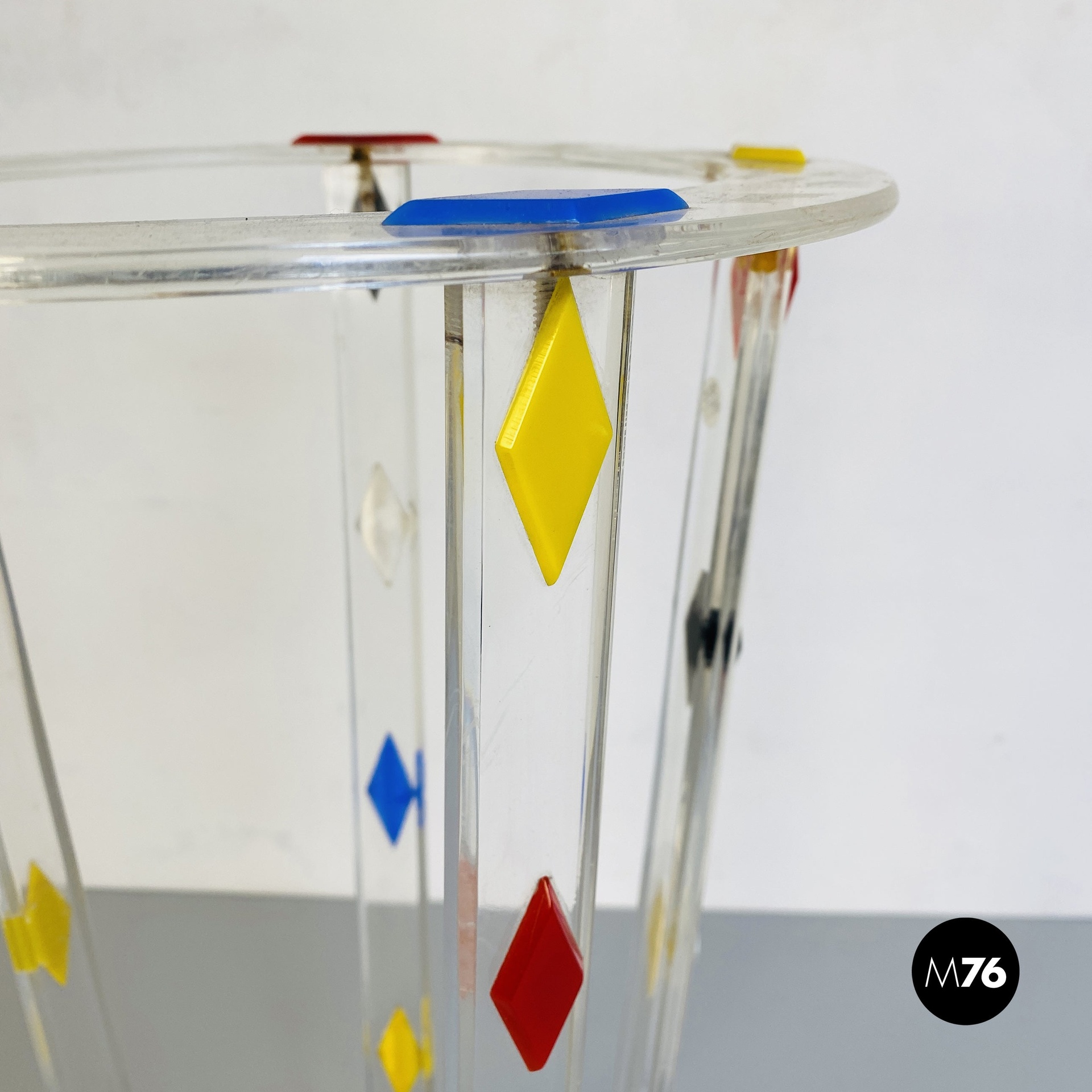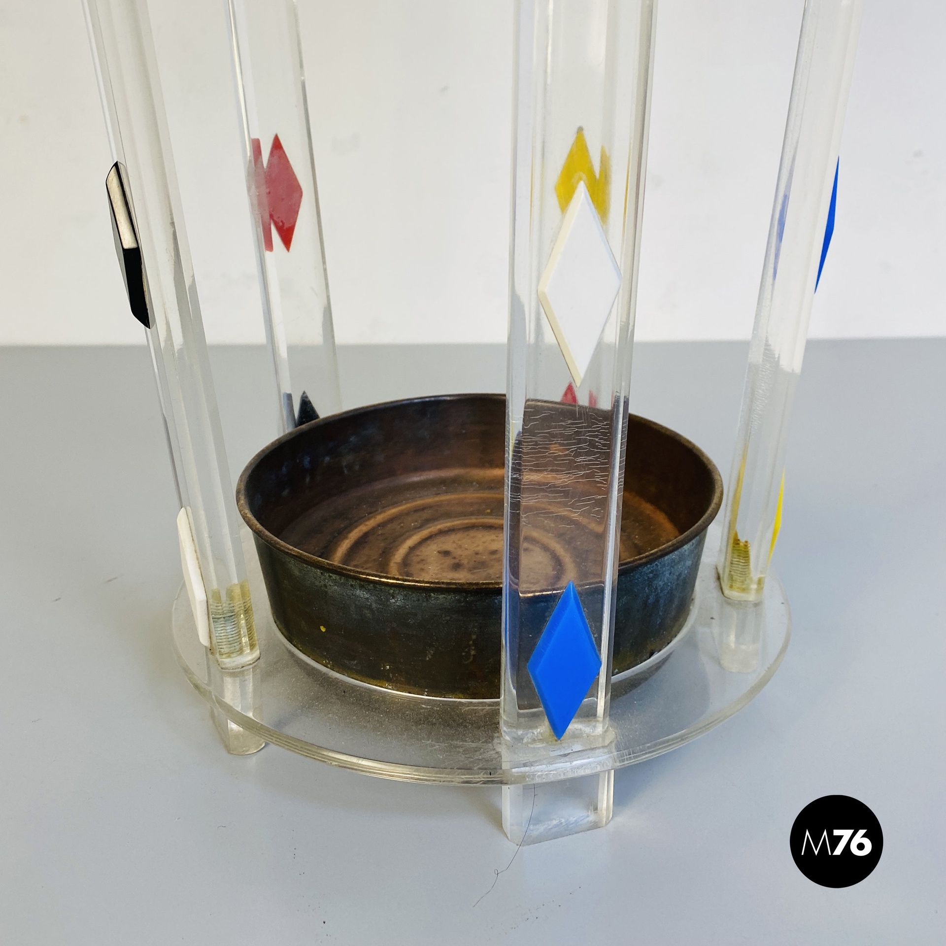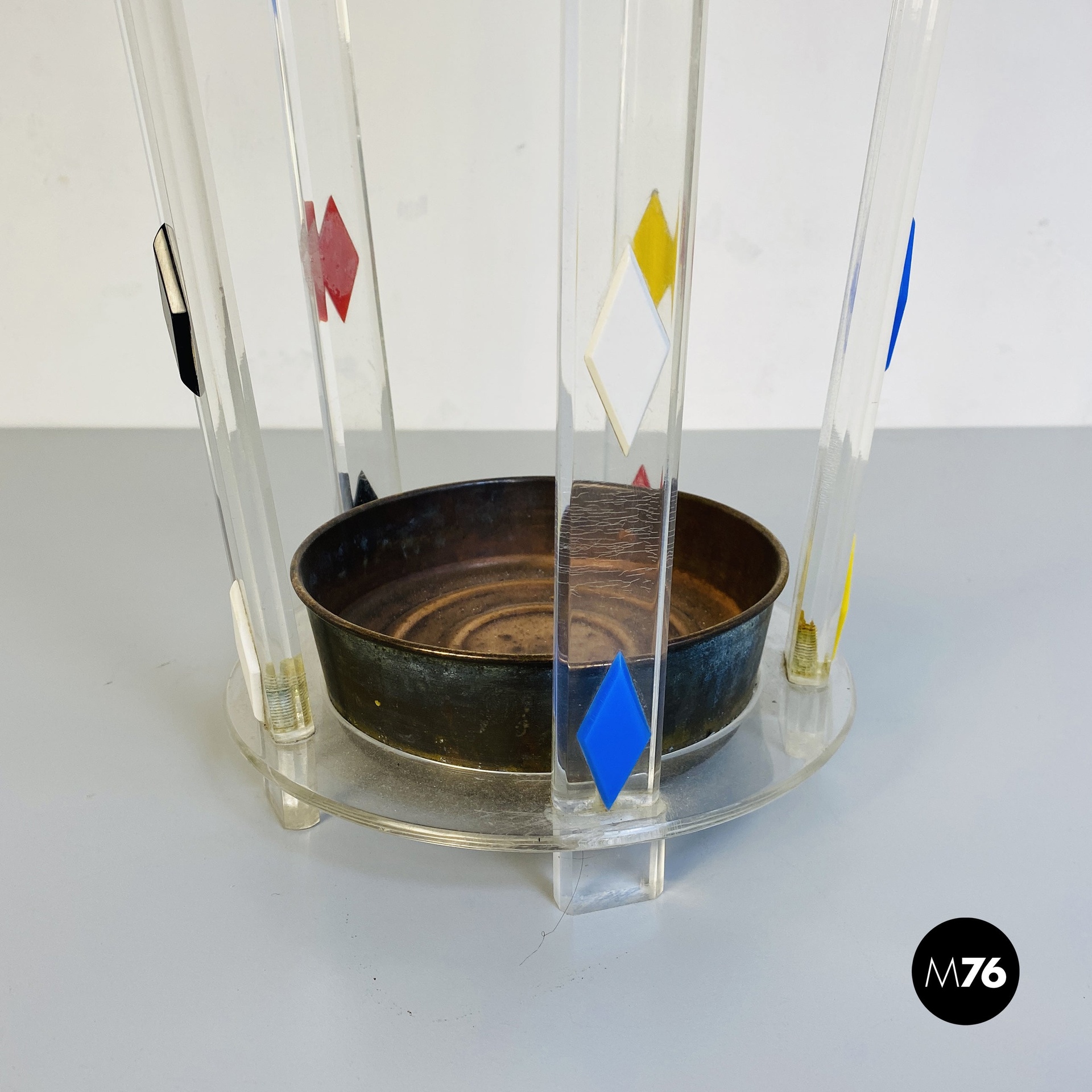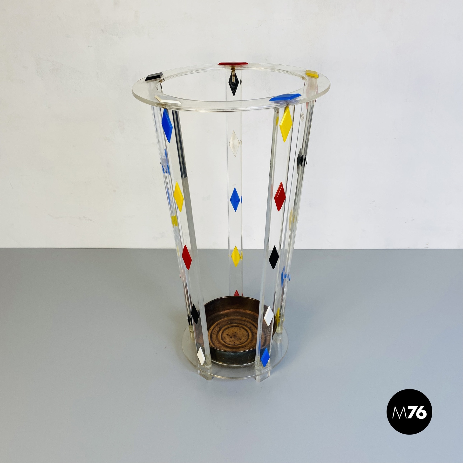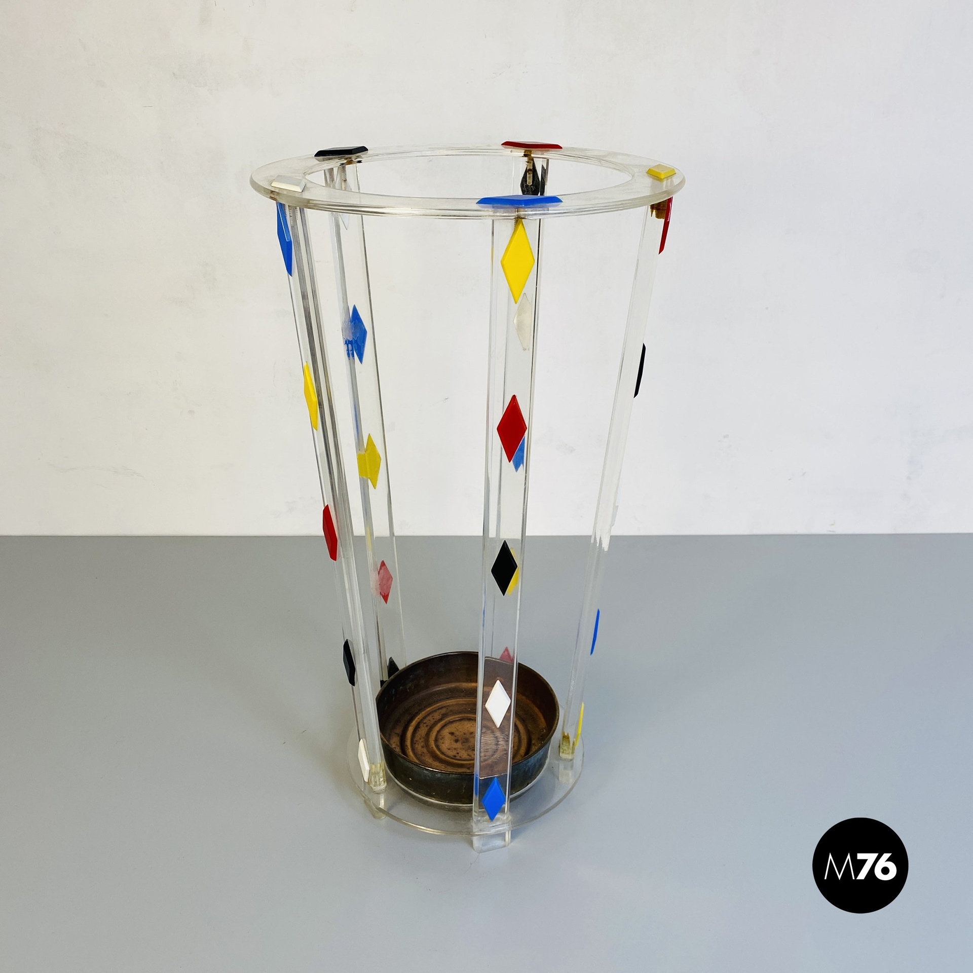 Portaombrelli in plexiglass trasparente con rombi colorati in plexiglass applicati, presente alla base una ciotola in bronzo.