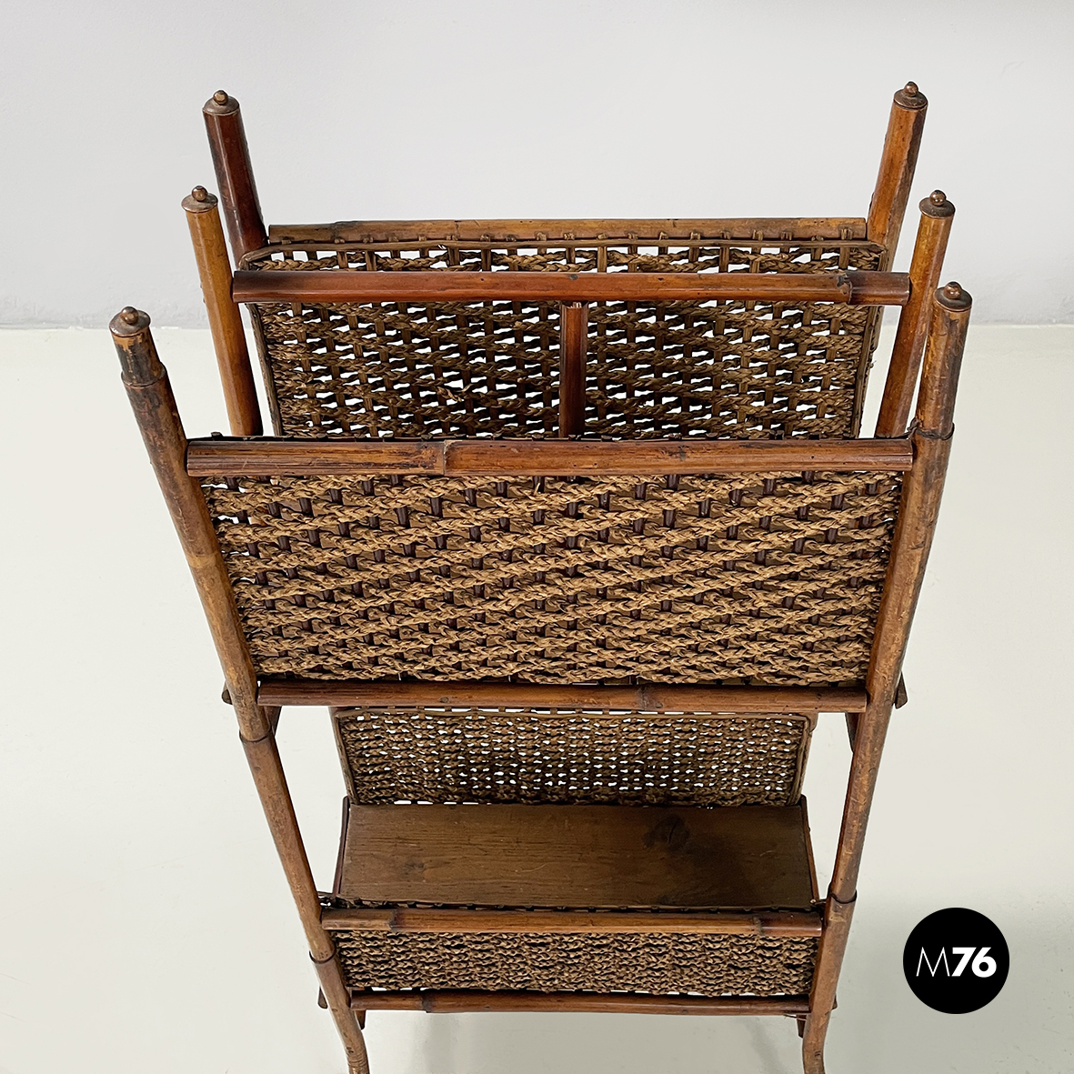 Portariviste da terra con doppio ripiano rettangolare, interamente in rattan. Su due lati di ogni ripiano presenta rattan intrecciato. Dettagli sferici nella parte superiore della struttura. Zampe a sezione tonda.