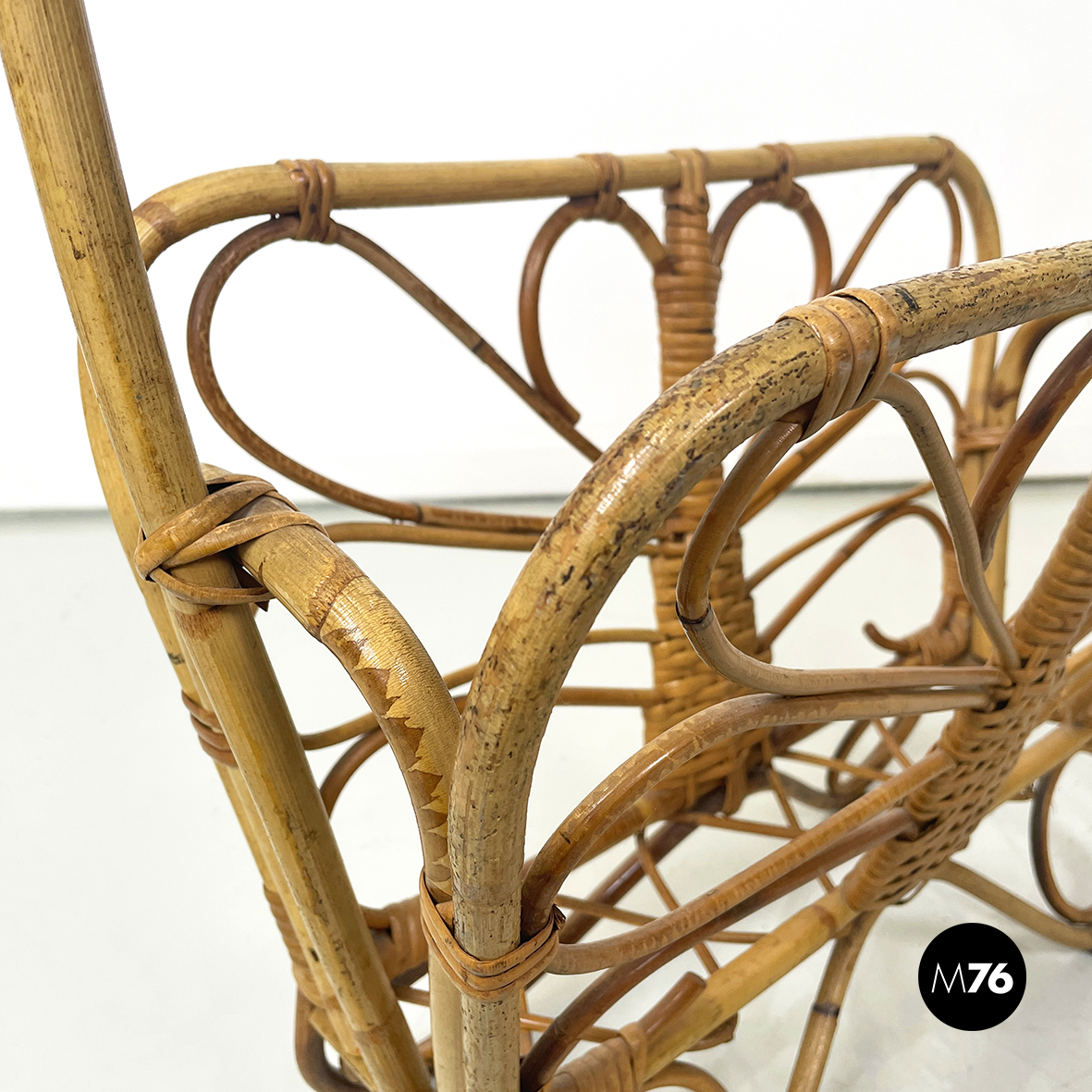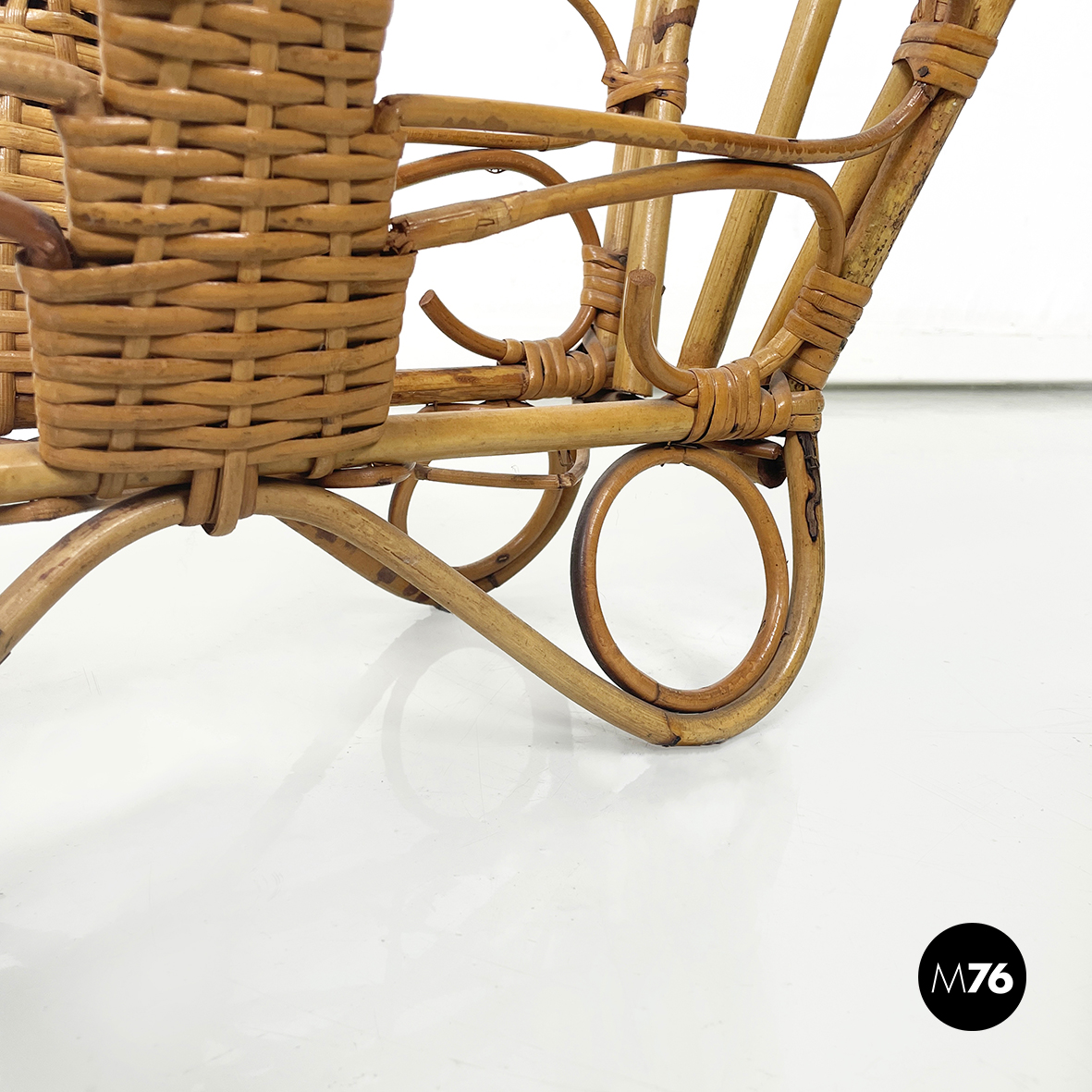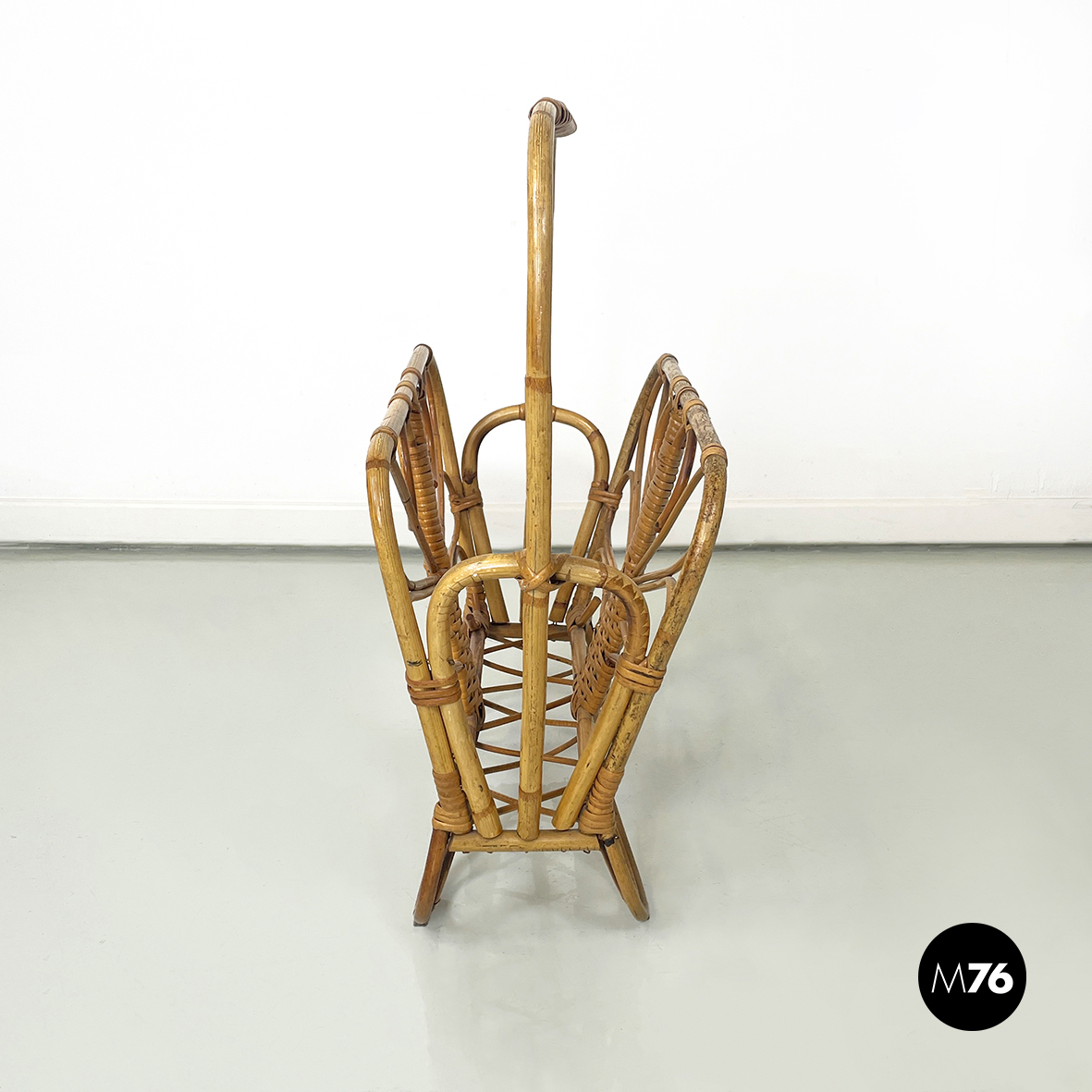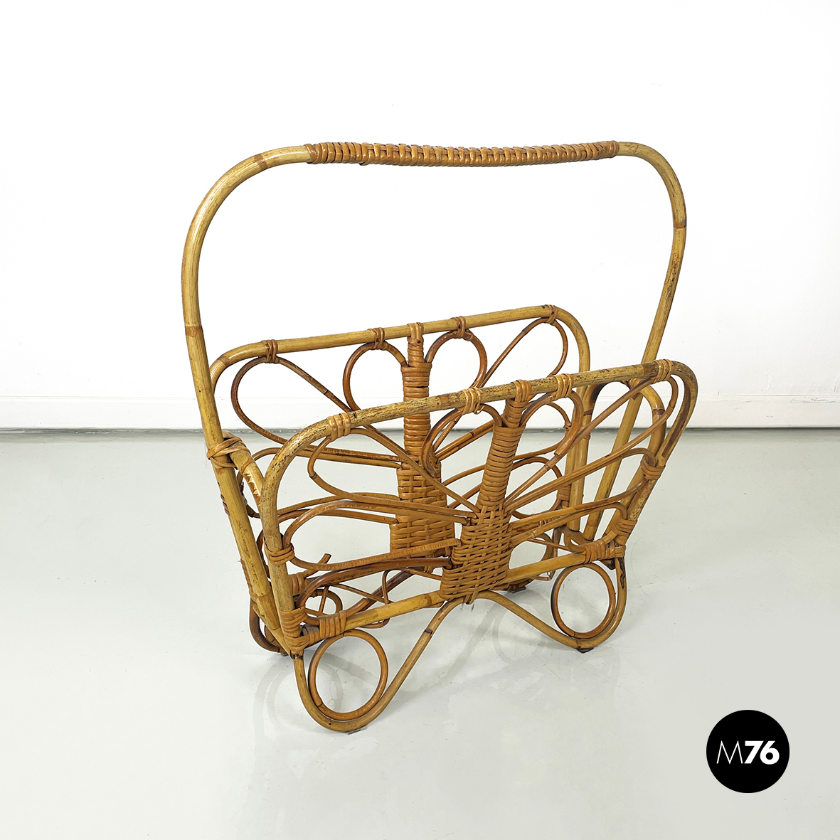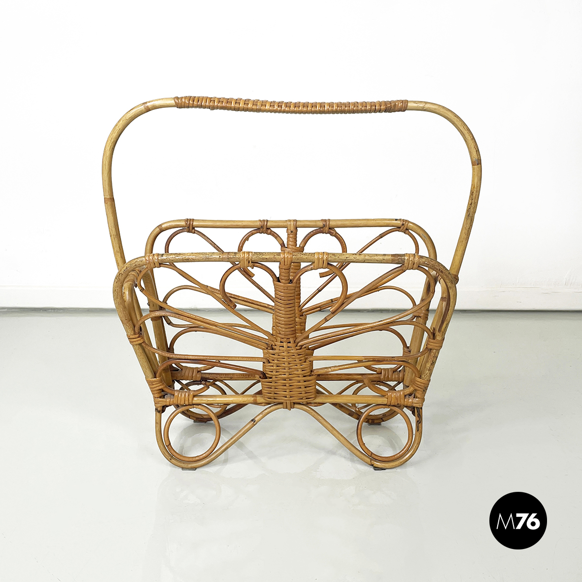 Portariviste interamente in rattan curvato e finemente intrecciato. La sezione dedicata alle riviste è a forma di V e presenta su entrambi i lati un design tondeggiante. Nella parte superiore è presente un manico. Piedini a cerchio.