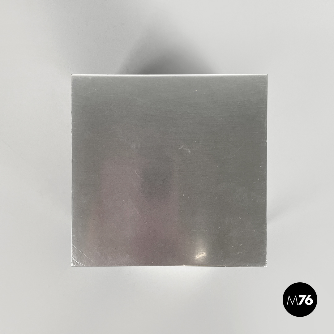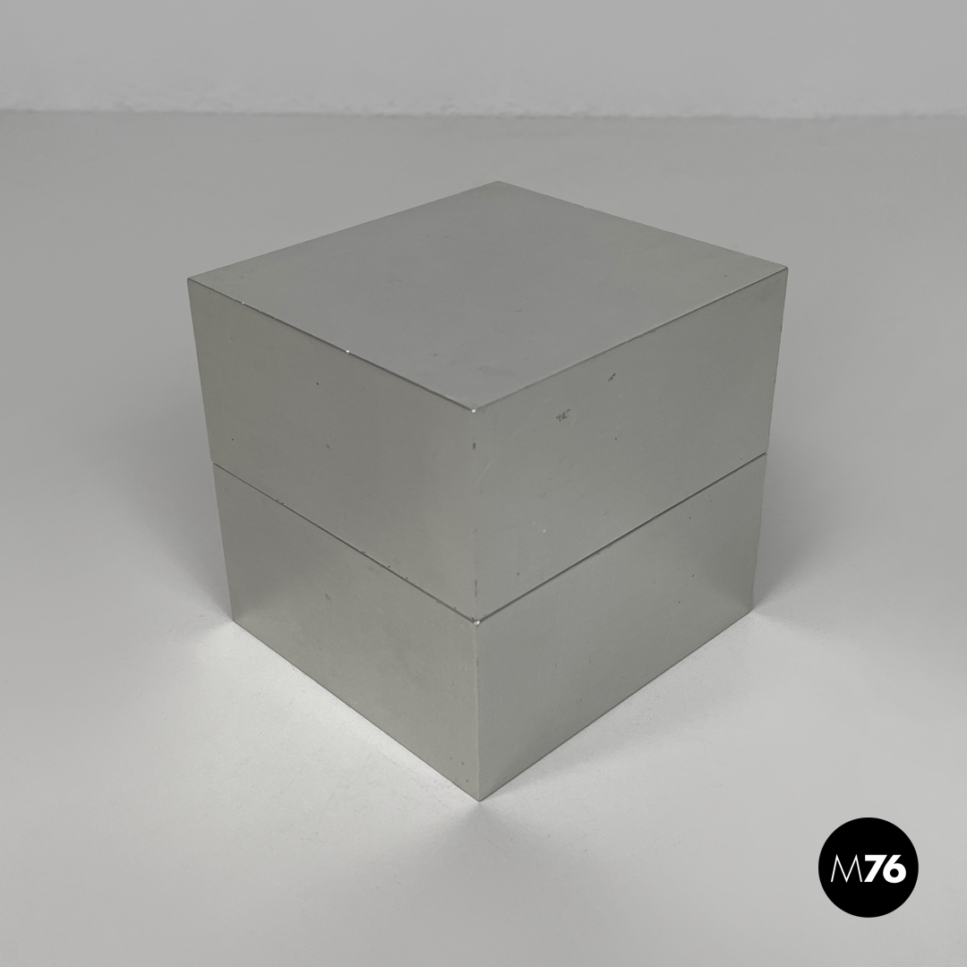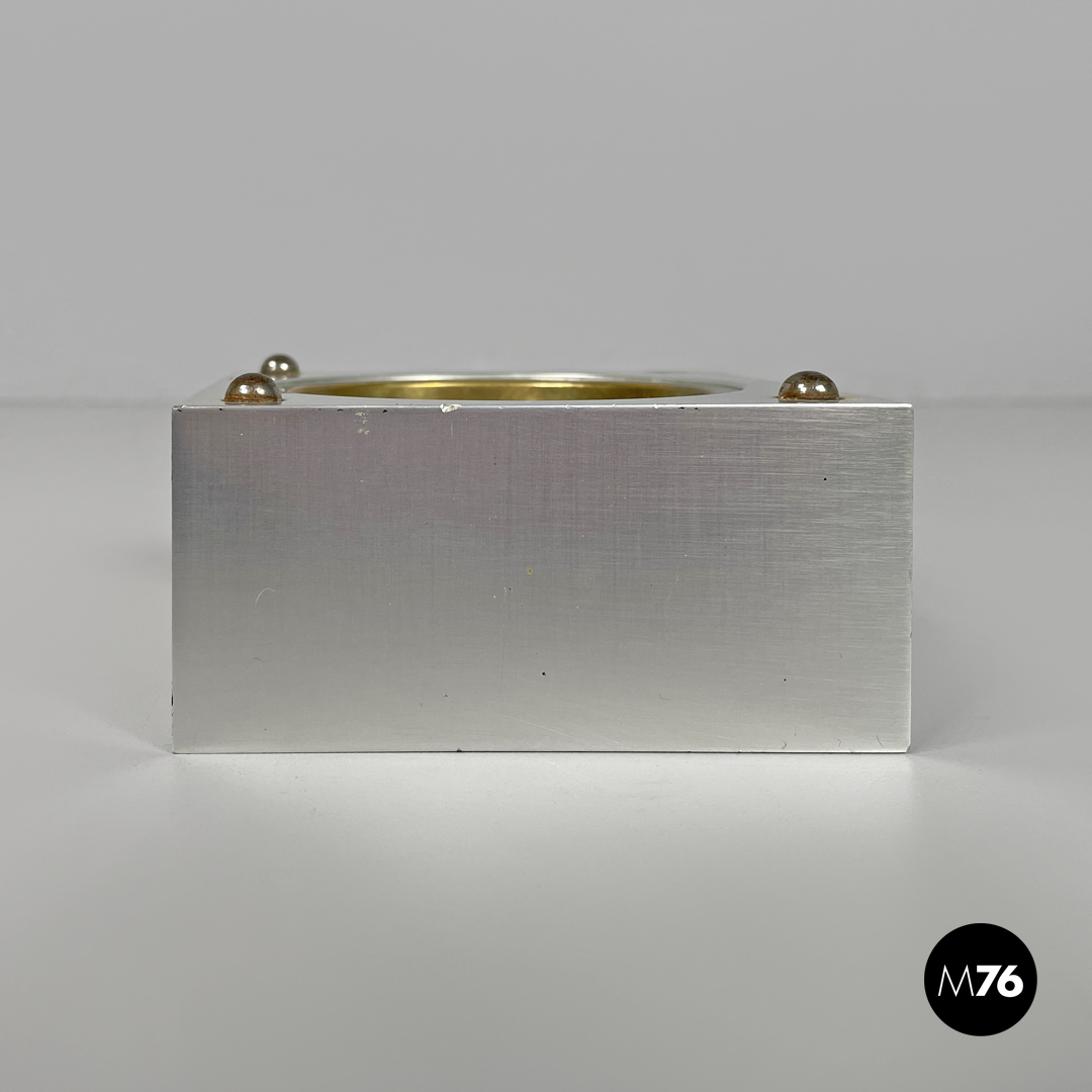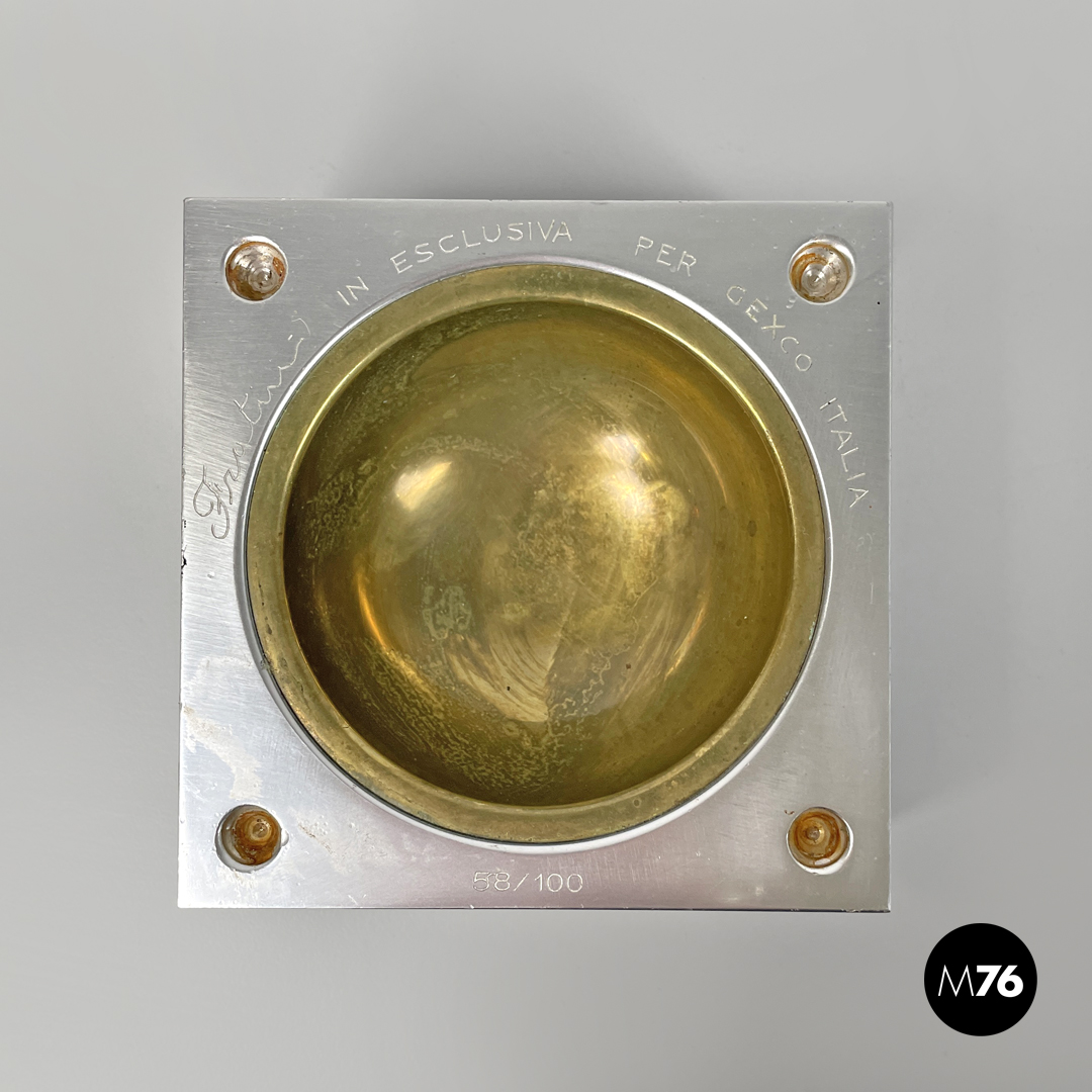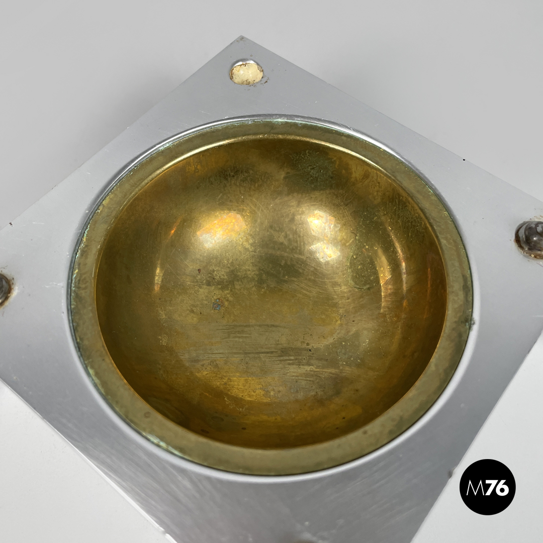 Posacenere da tavolo a base quadrata in alluminio. La struttura cubica è composta da due parti, ciascuna con una rientranza concava semicircolare in ottone. Sugli angoli delle due parti sono presenti rispettivamente quattro semisfere e quattro fori per incastrarle.