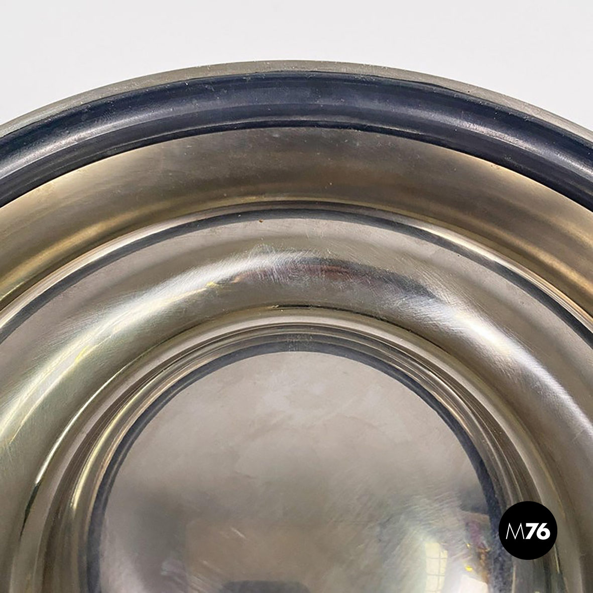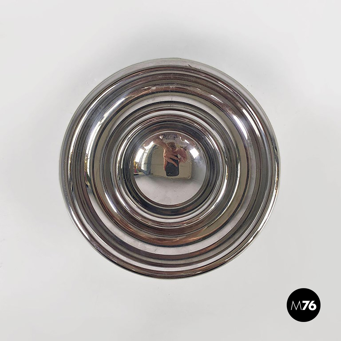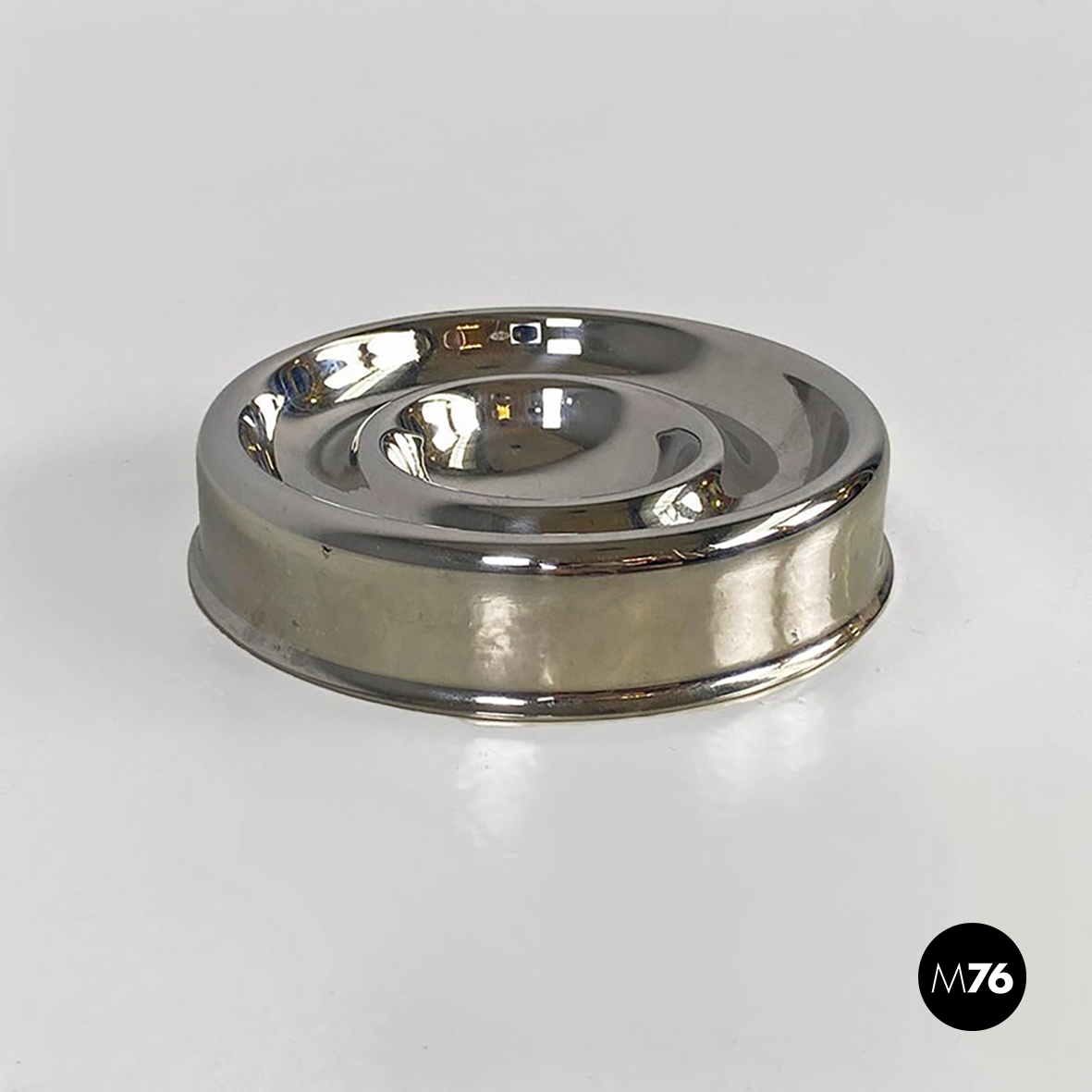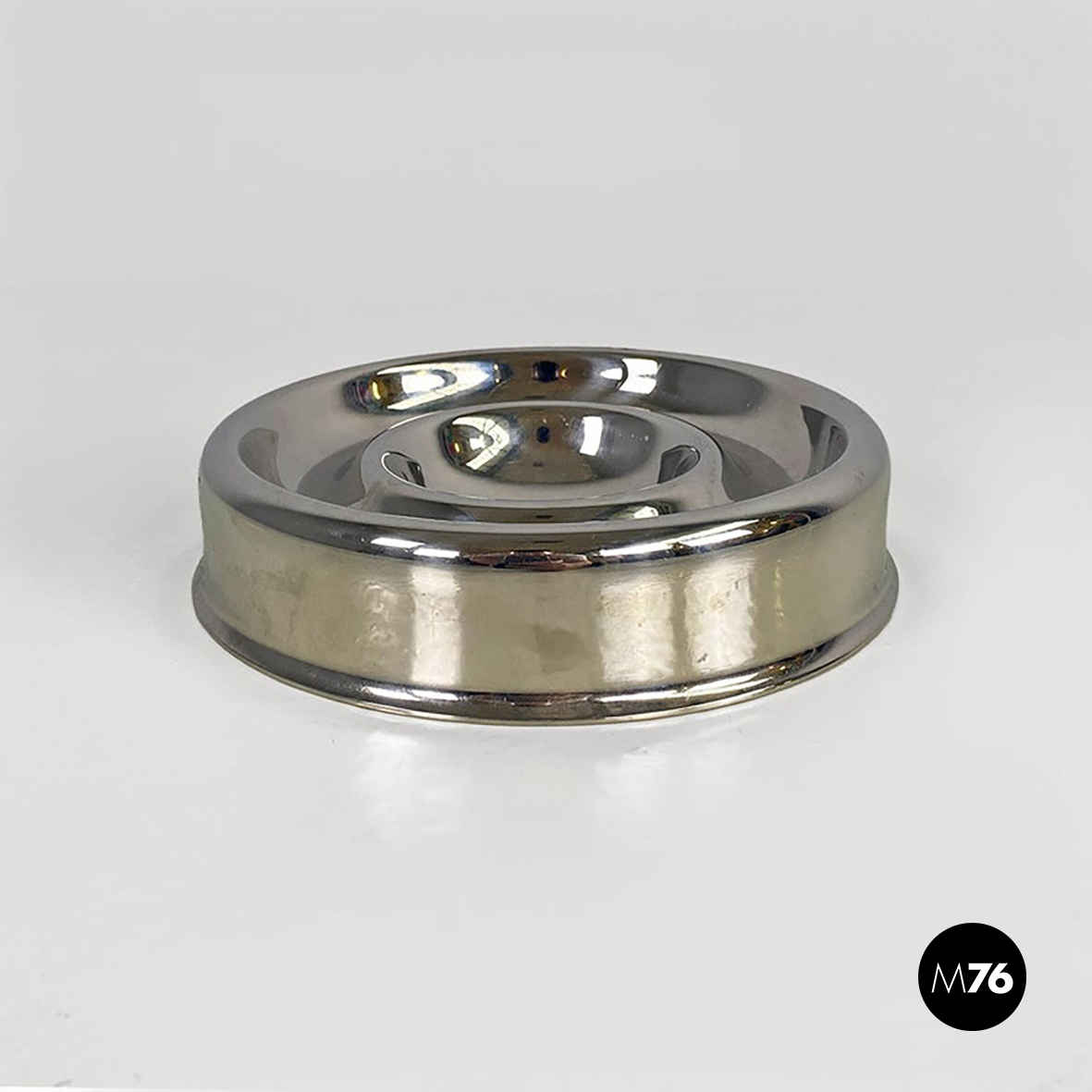 Posacenere da tavolo modello Guadalupa di forma tonda, interamente realizzato in acciaio inox cromato, con inserto in gomma alla base della caratteristica sagoma curva visibile sia dalla parte superiore che inferiore dell’oggetto.