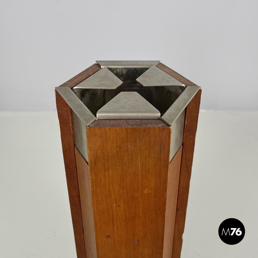 Posacenere da terra modello Ariete 1401 a base esagonale. La struttura principale è in legno, con sei facce verticali, di cui tre più esterne. La parte superiore è in metallo, ed è estraibile. La base presenta è in metallo.