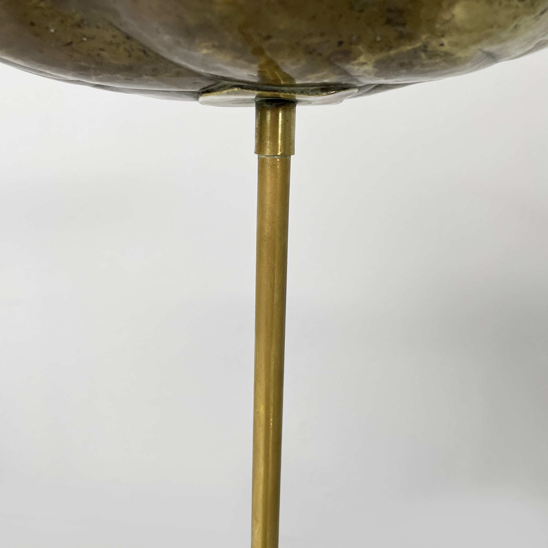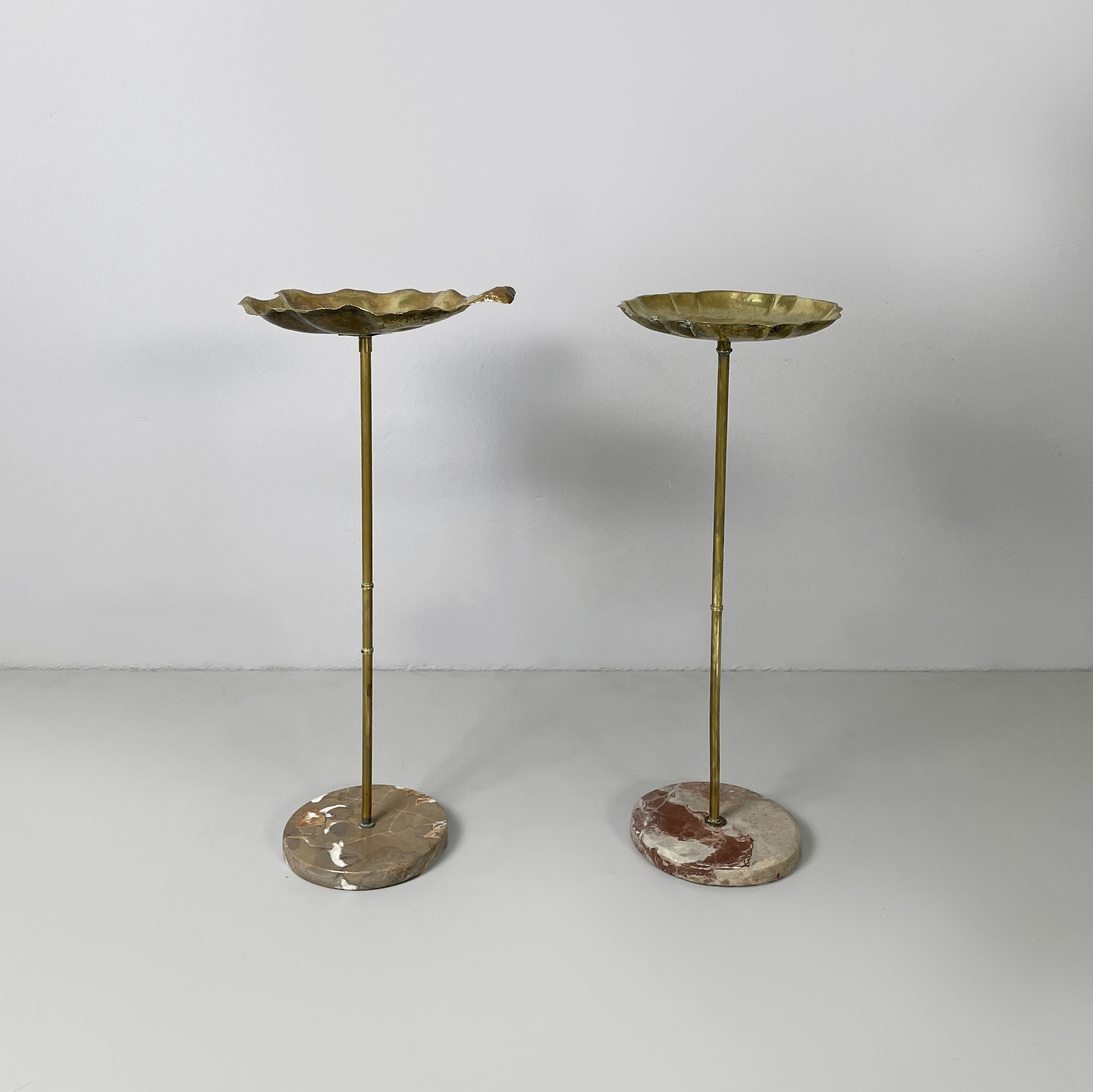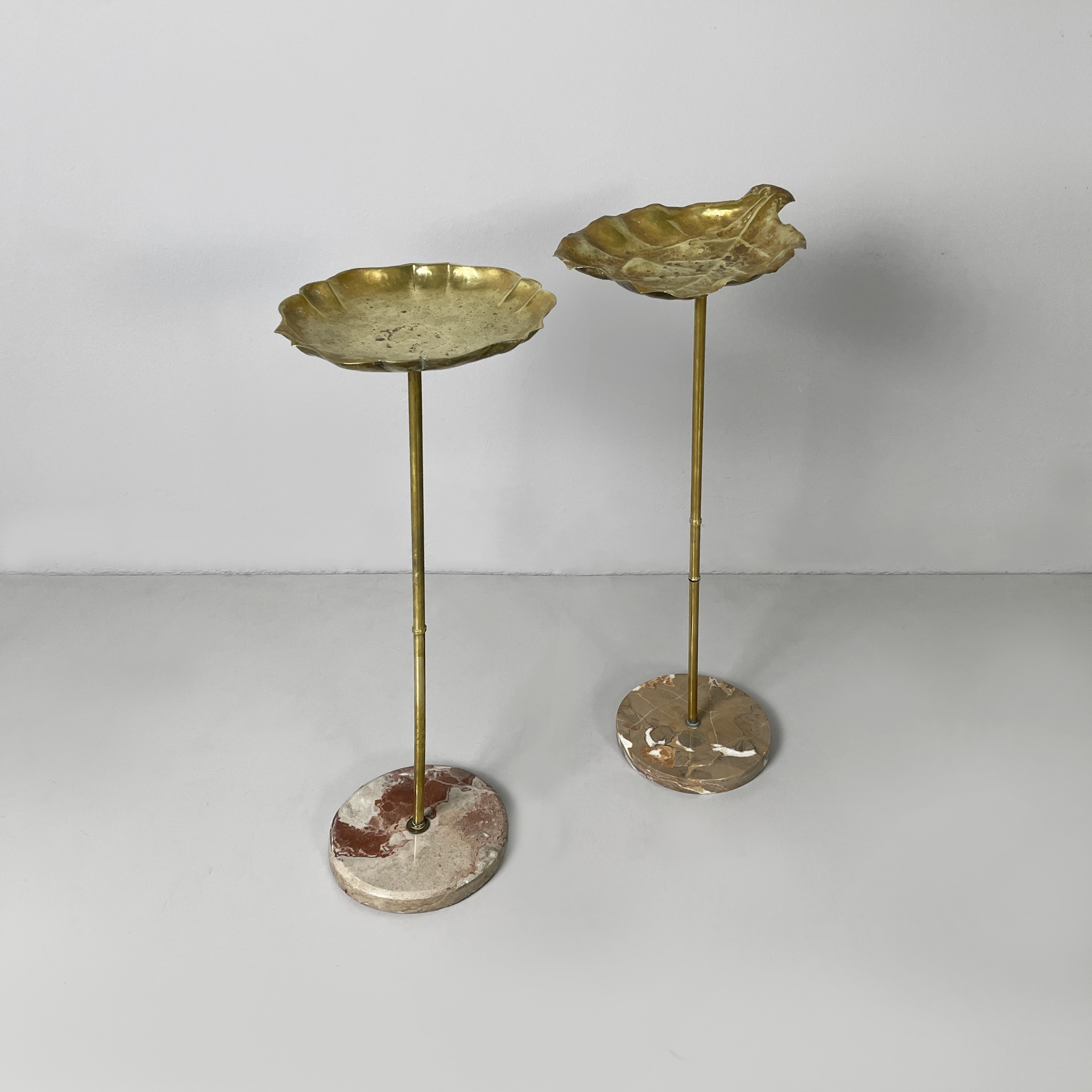 Coppia di posaceneri da terra in ottone e marmo. I piatti in ottone presentano forme differenti: un posacenere è a forma di foglia mentre l’altro presenta una forma geometrica. La struttura di entrambi è uno stelo a sezione tonda in ottone. Base tonda in marmo.