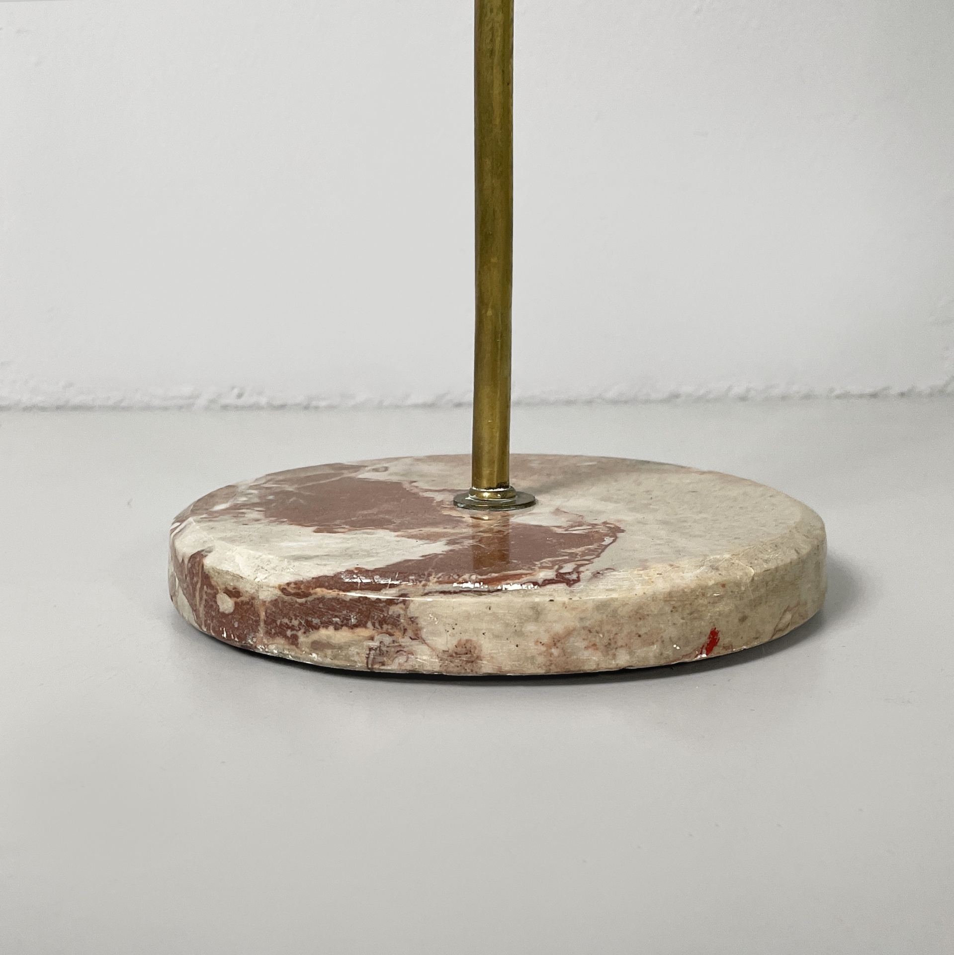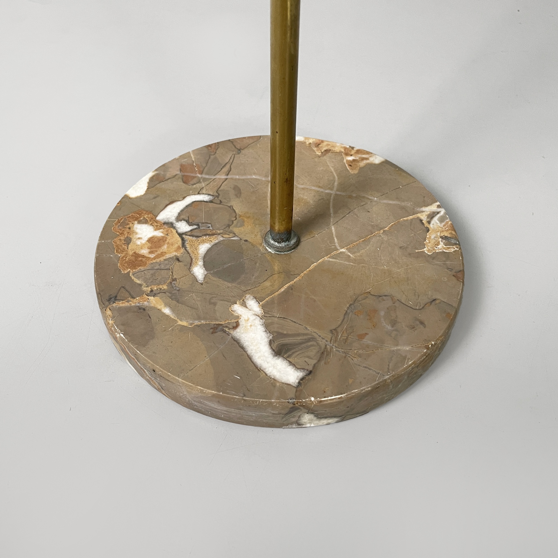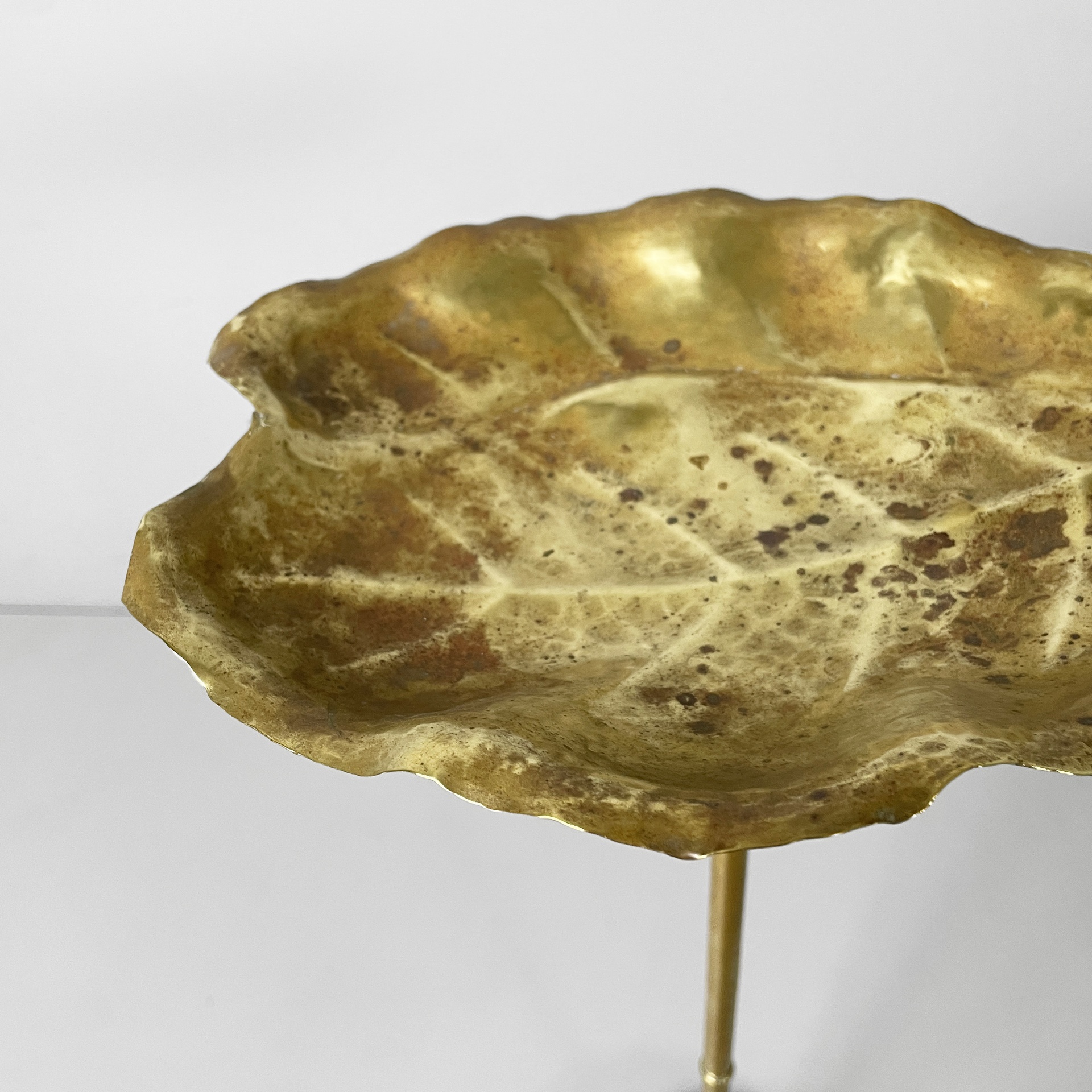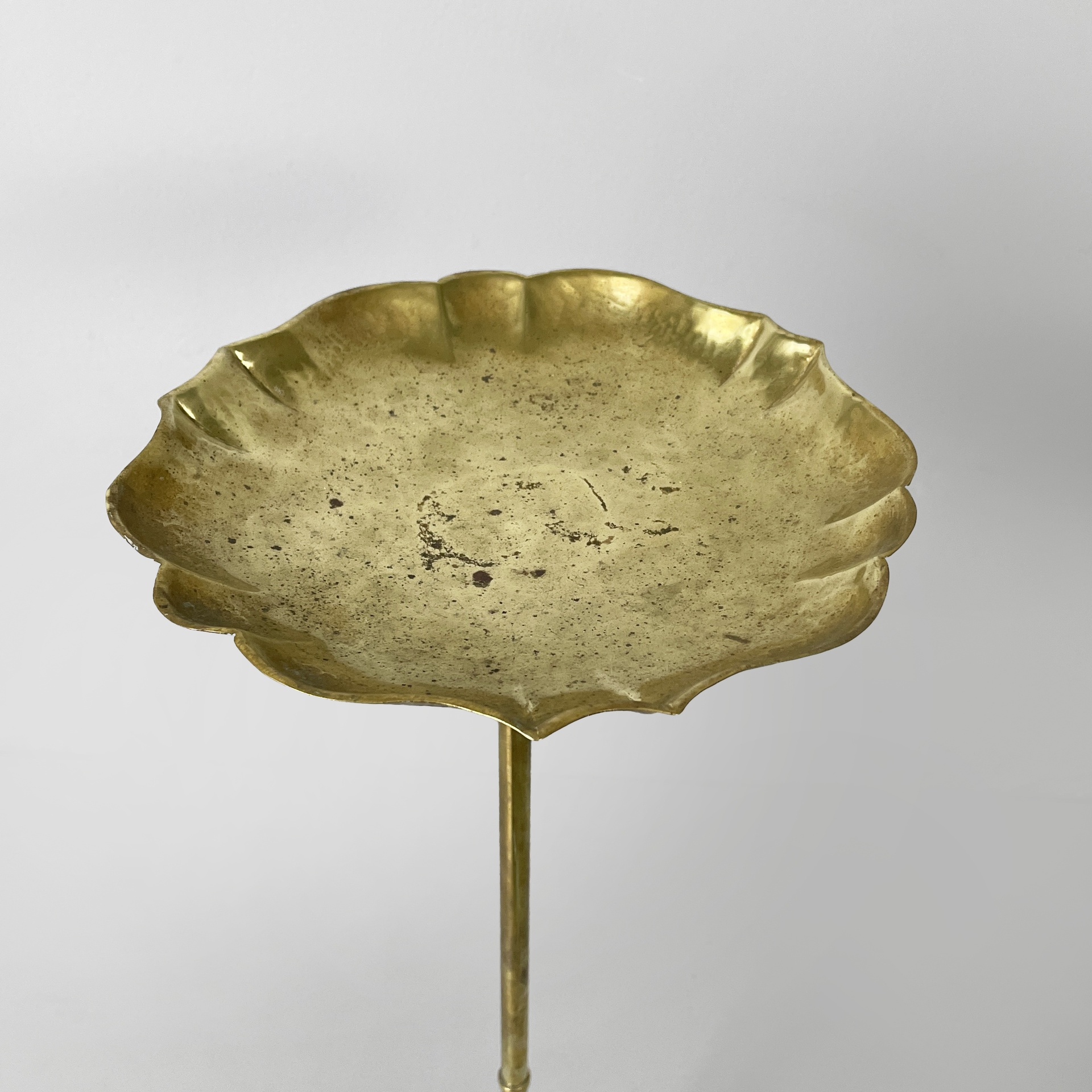 Coppia di posaceneri da terra in ottone e marmo. I piatti in ottone presentano forme differenti: un posacenere è a forma di foglia mentre l’altro presenta una forma geometrica. La struttura di entrambi è uno stelo a sezione tonda in ottone. Base tonda in marmo.