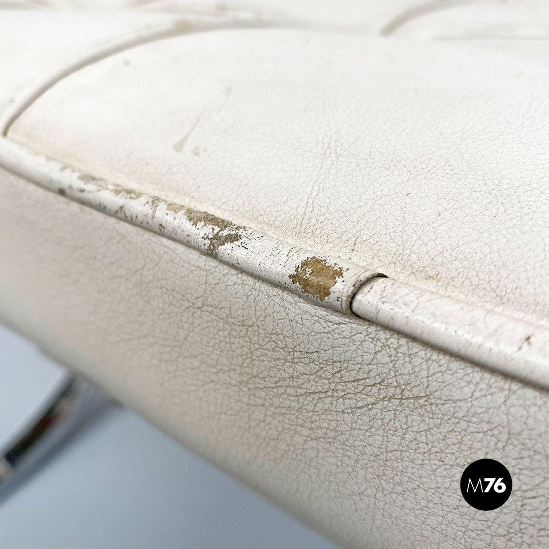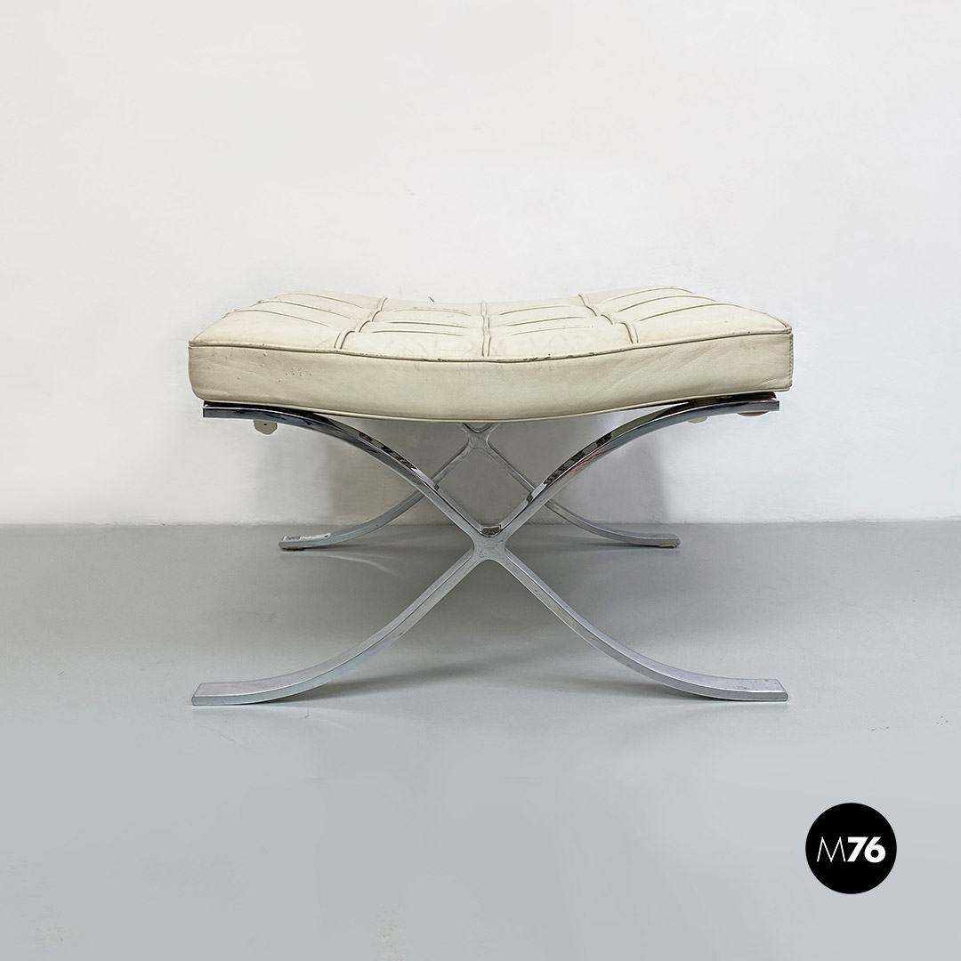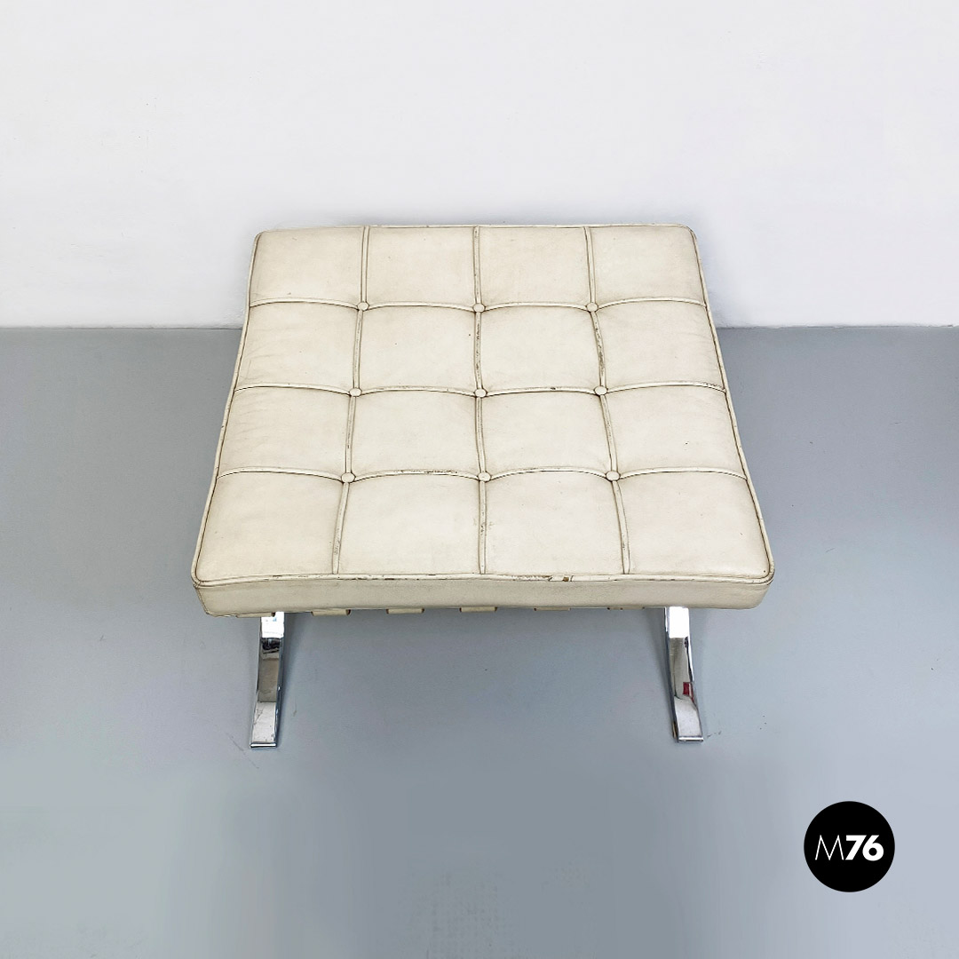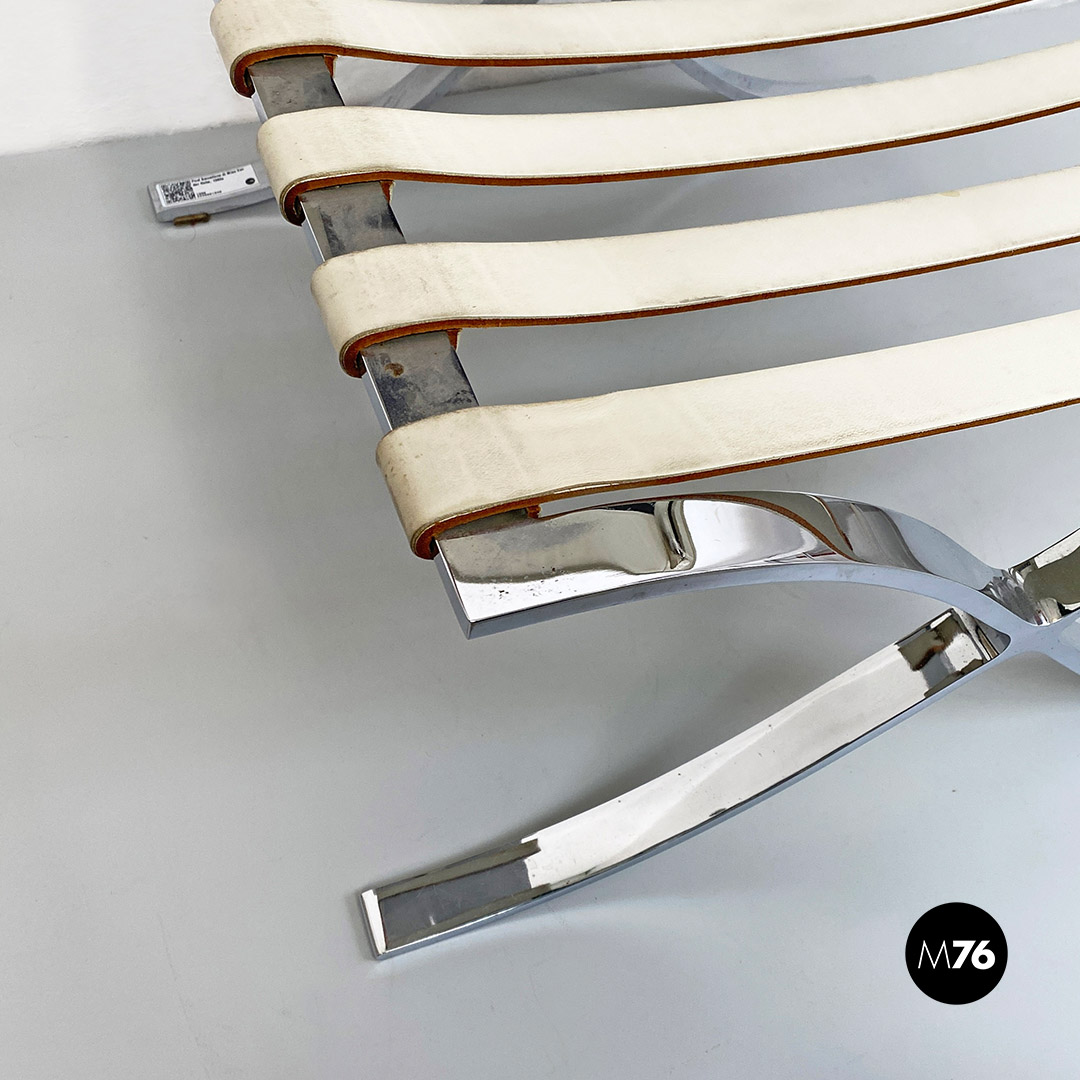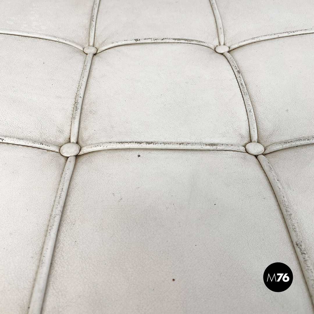 Pouf o poggiapiedi modello Barcelona con seduta in schiuma poliuretanica rivestita in pelle bianca, struttura in acciaio inossidabile lucido e cinghie elastiche rivestite in pelle.