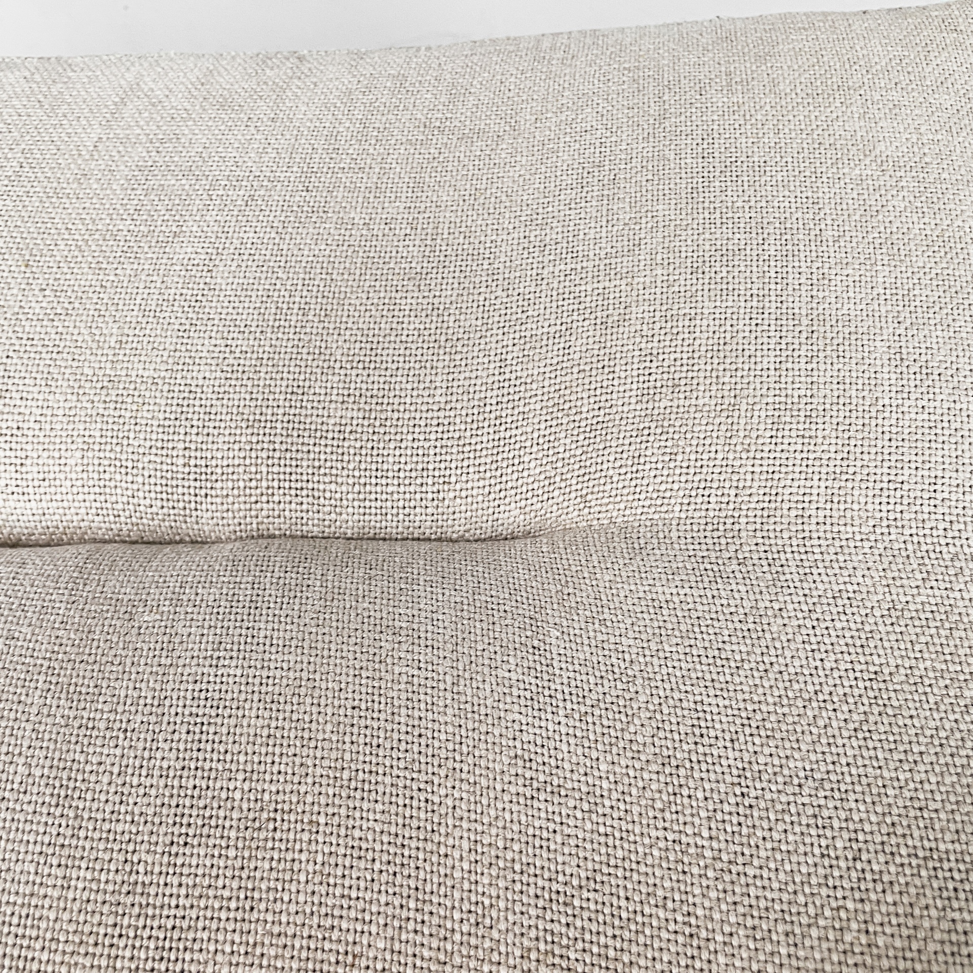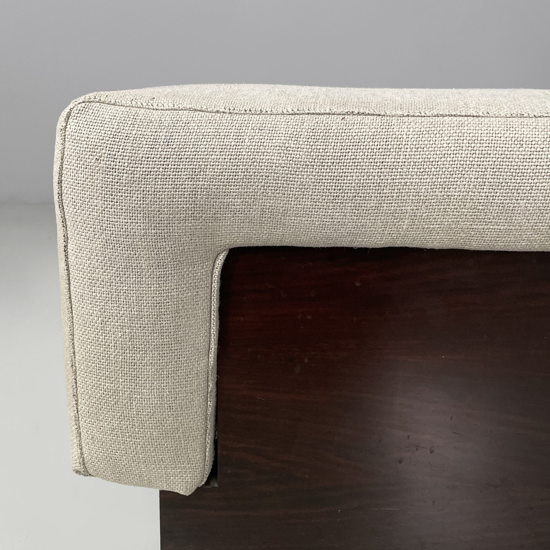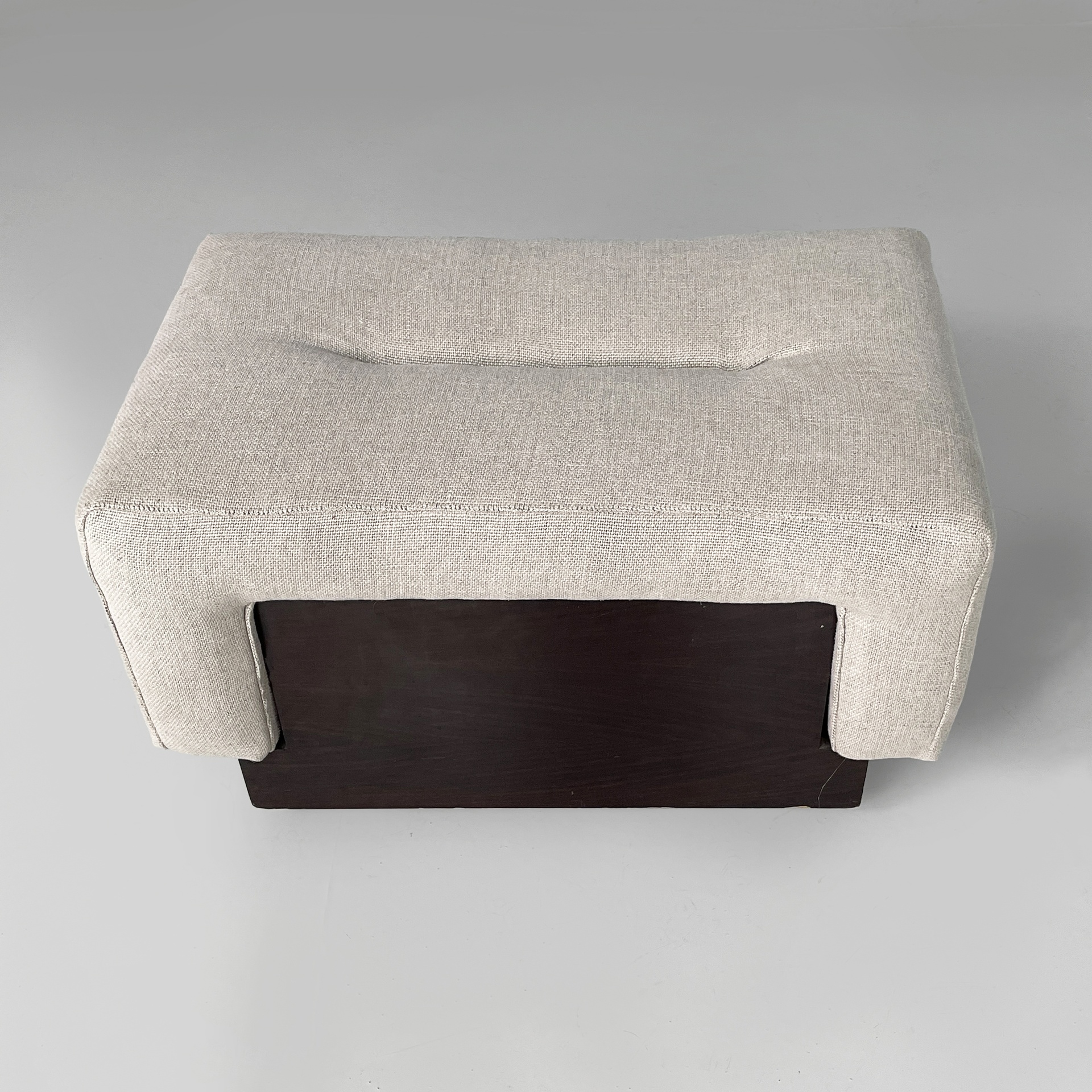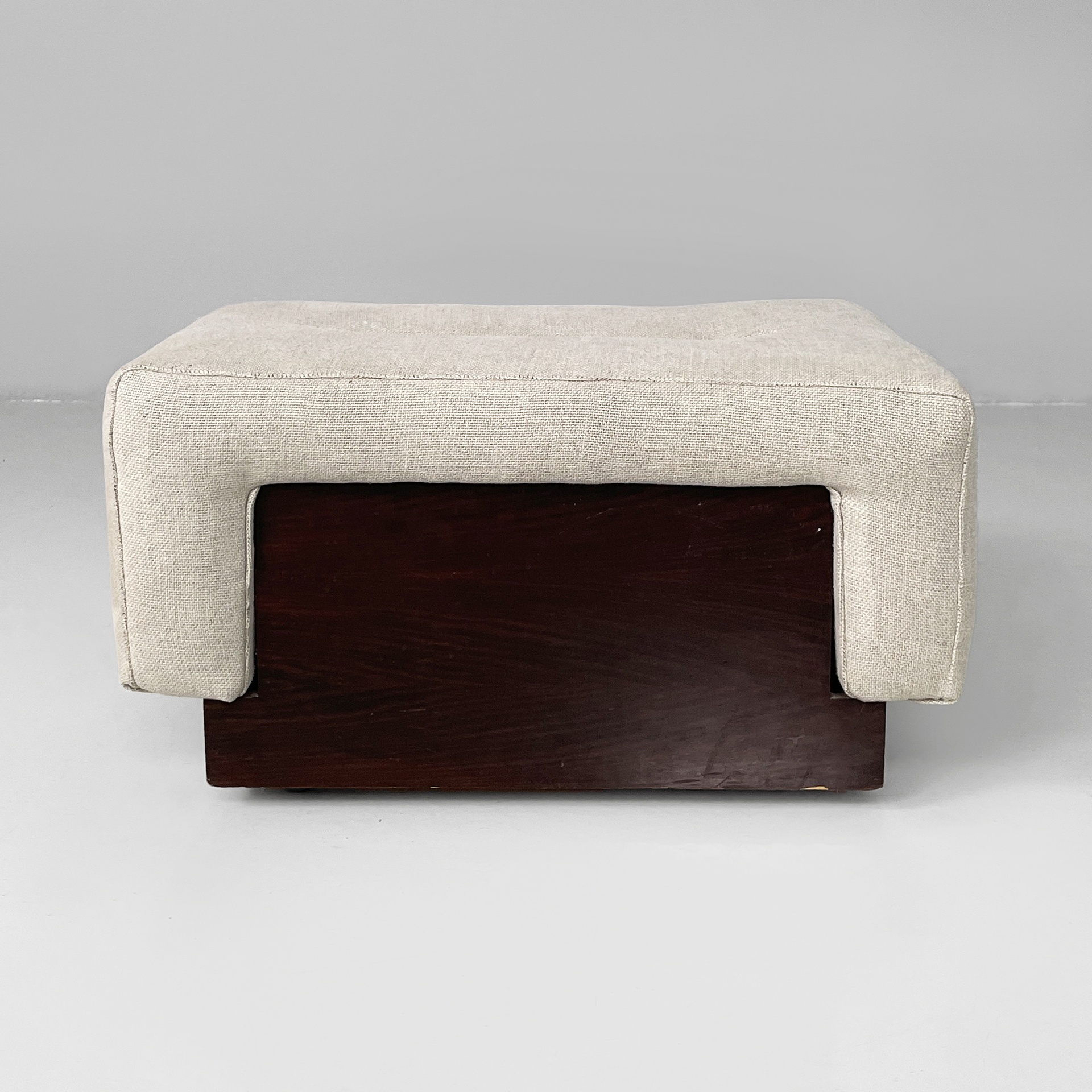 Pouf con seduta rettangolare imbottita e rivestita in tessuto beige. La struttura è in legno. Ruote alla base.