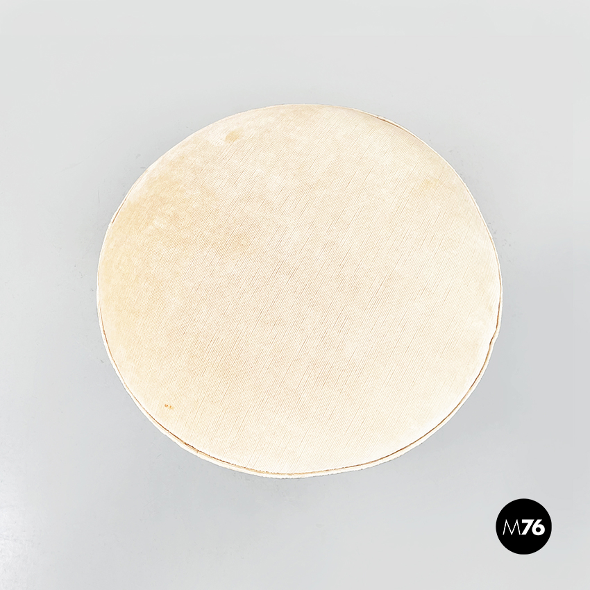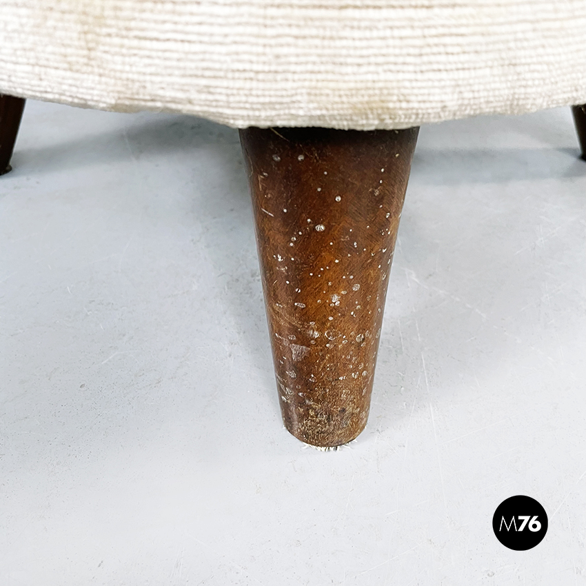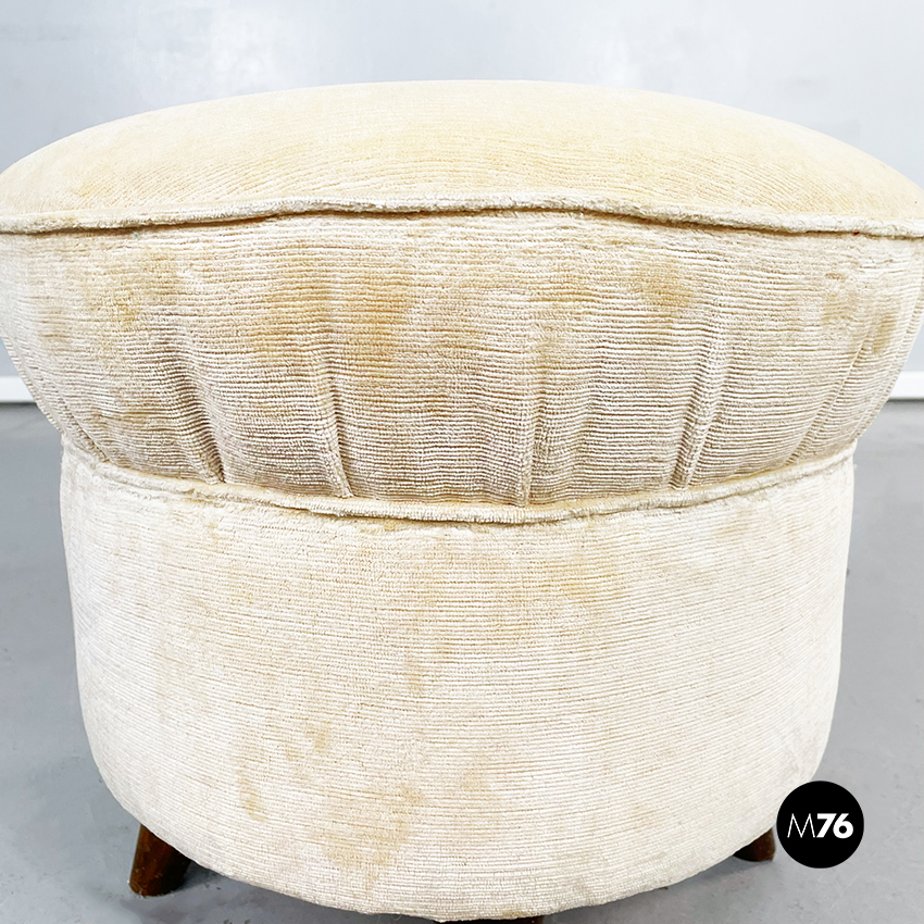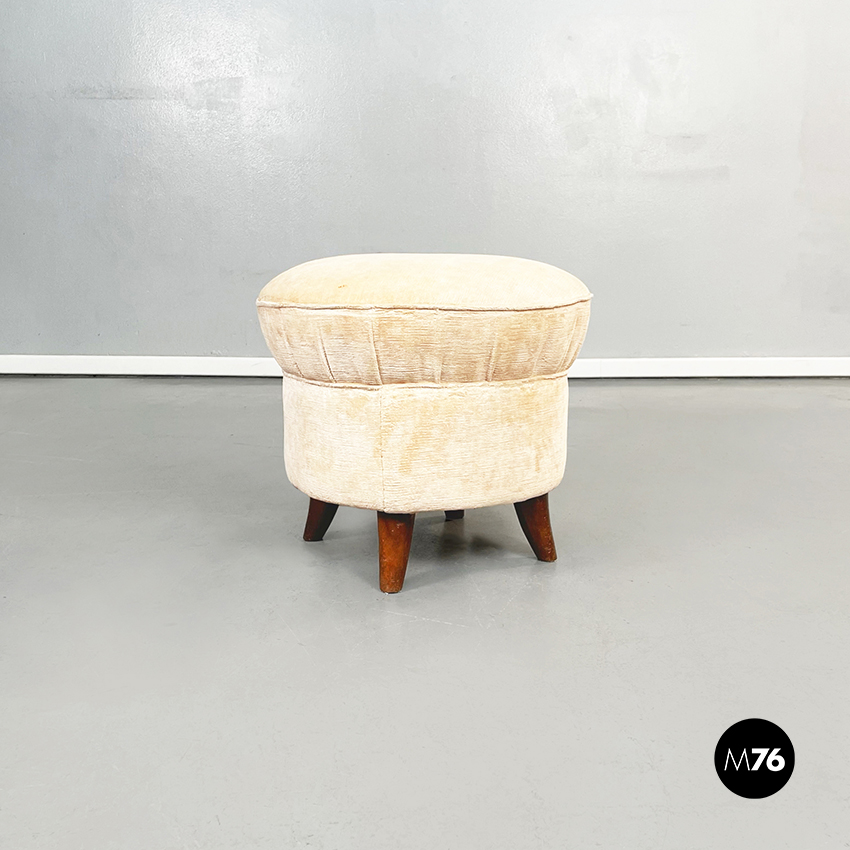 Pouf in tessuto beige e struttura in legno. Il pouf è di forma cilindrica, con una leggera bombatura verso la parte alta. Tutti e tre sono rifiniti e presentano piedini conici in legno a vista. Utilizzabili anche come poggiapiedi.