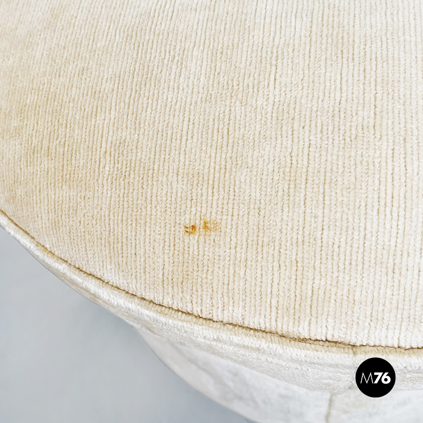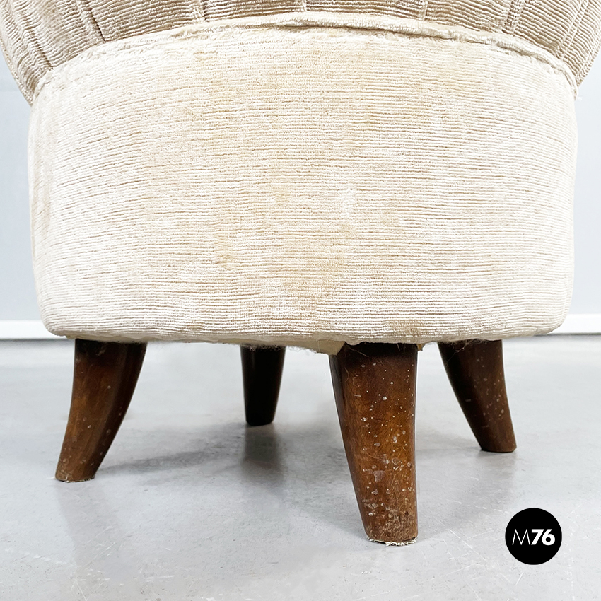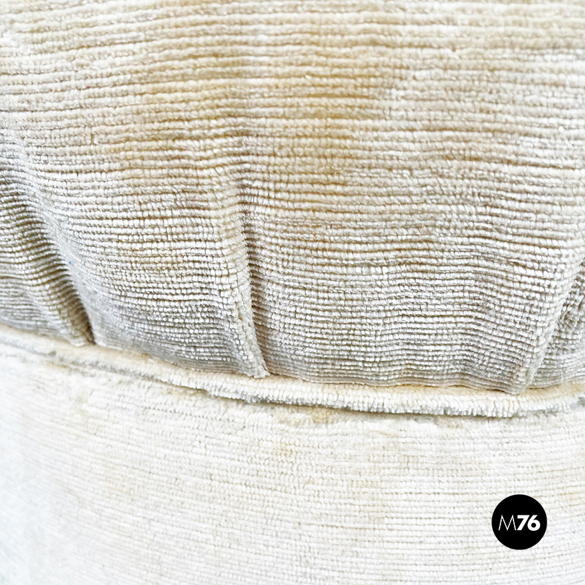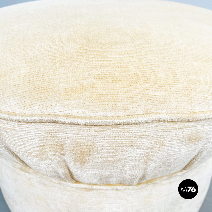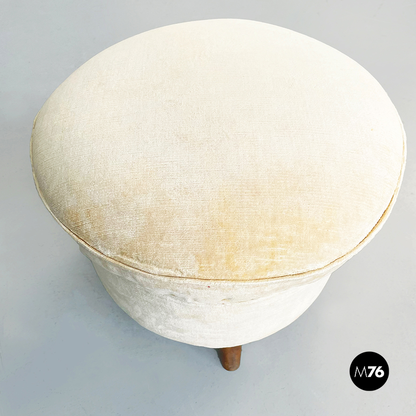 Pouf in tessuto beige e struttura in legno. Il pouf è di forma cilindrica, con una leggera bombatura verso la parte alta. Tutti e tre sono rifiniti e presentano piedini conici in legno a vista. Utilizzabili anche come poggiapiedi.