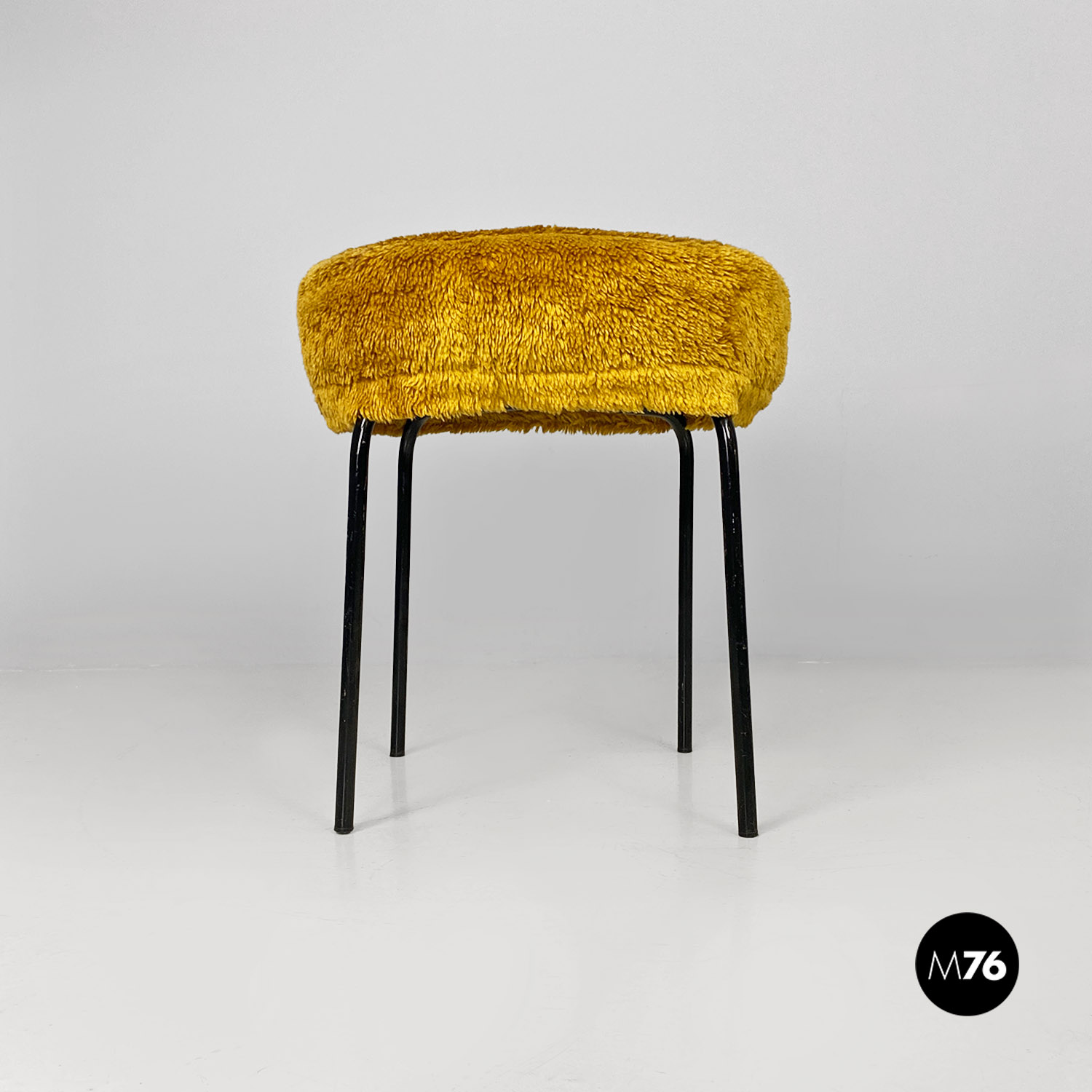 Pouf o sgabello con seduta imbottita con il suo tessuto a pelo lungo di colore giallo scuro, originale e con zampe in tondino di metallo nero. Utilizzabile anche come poggiapiedi.