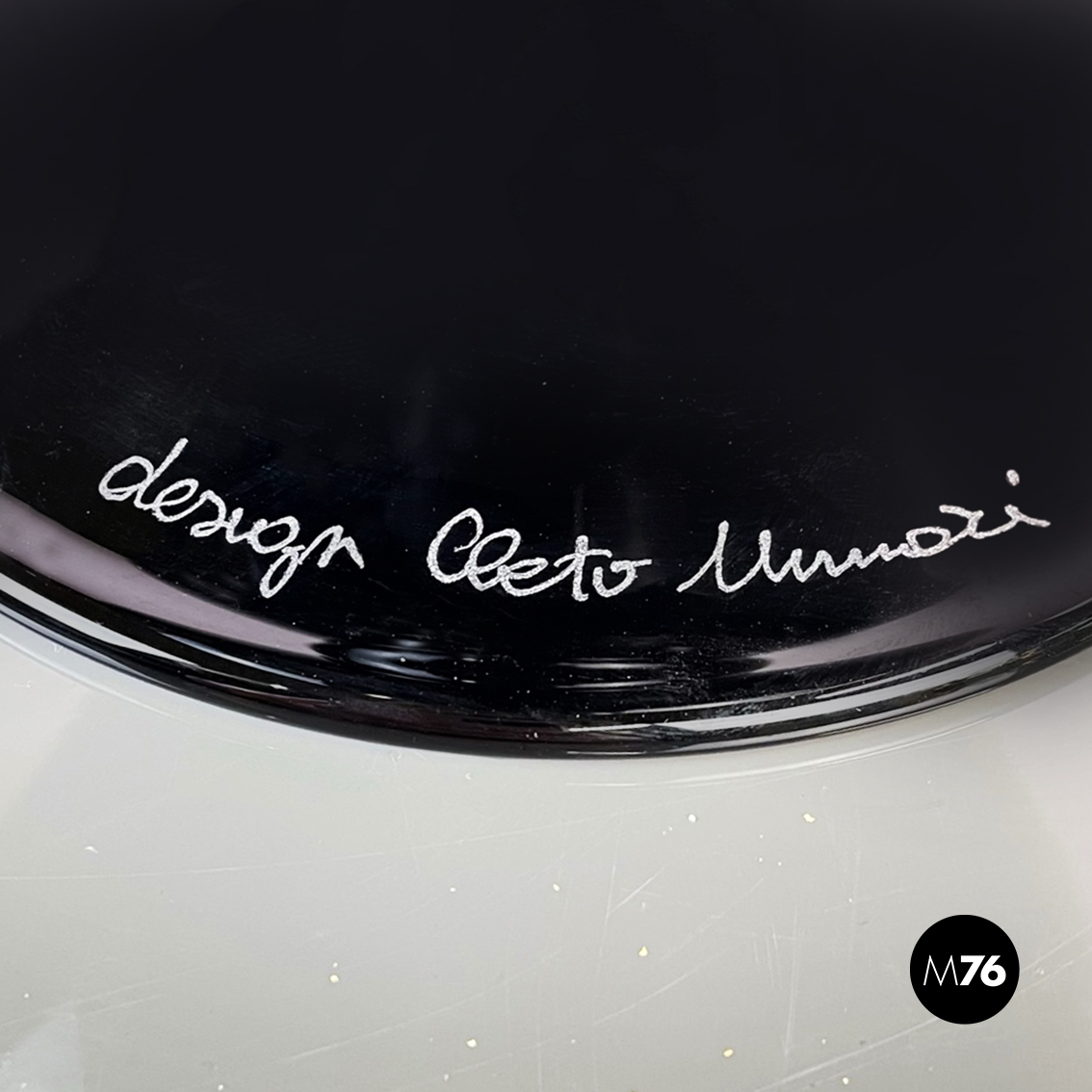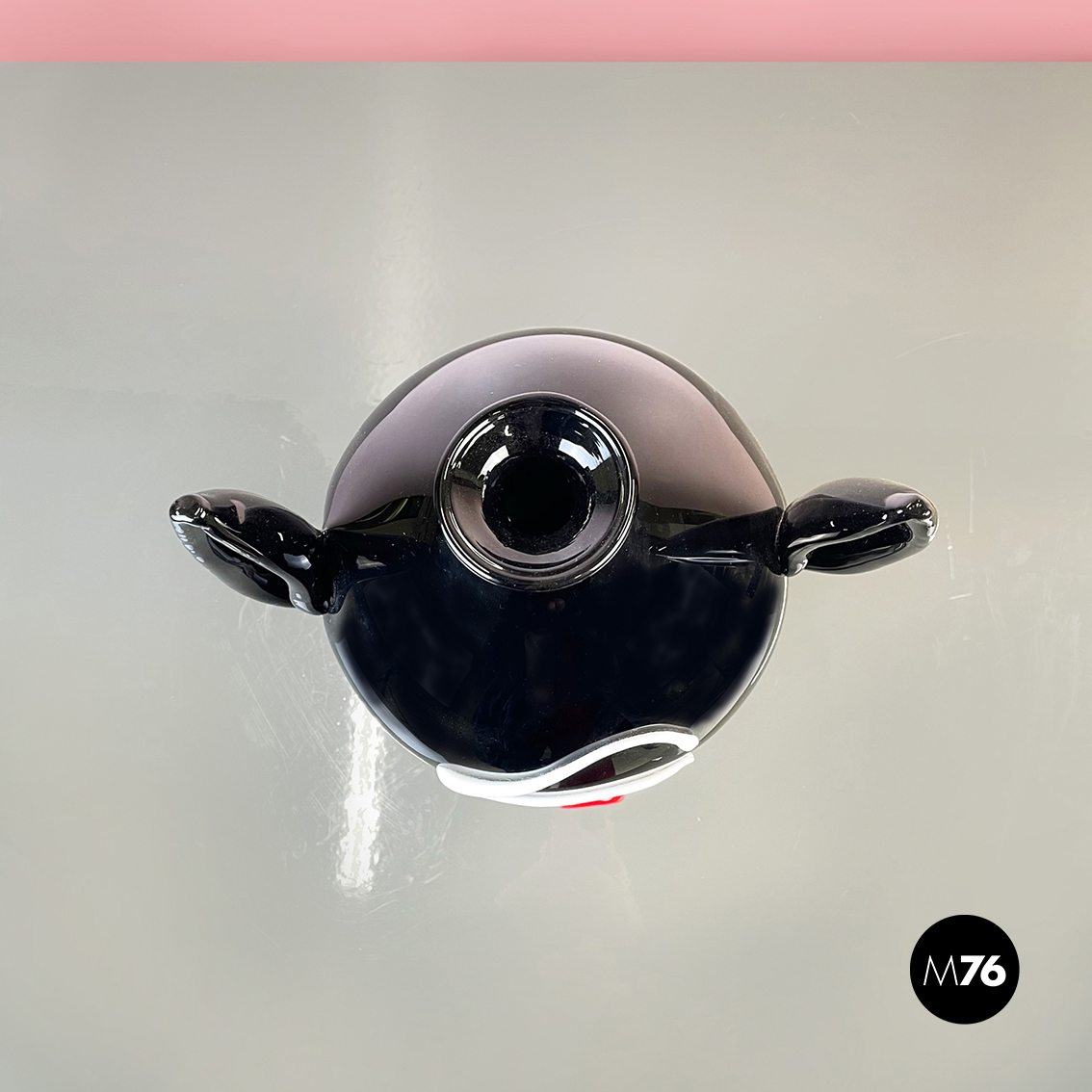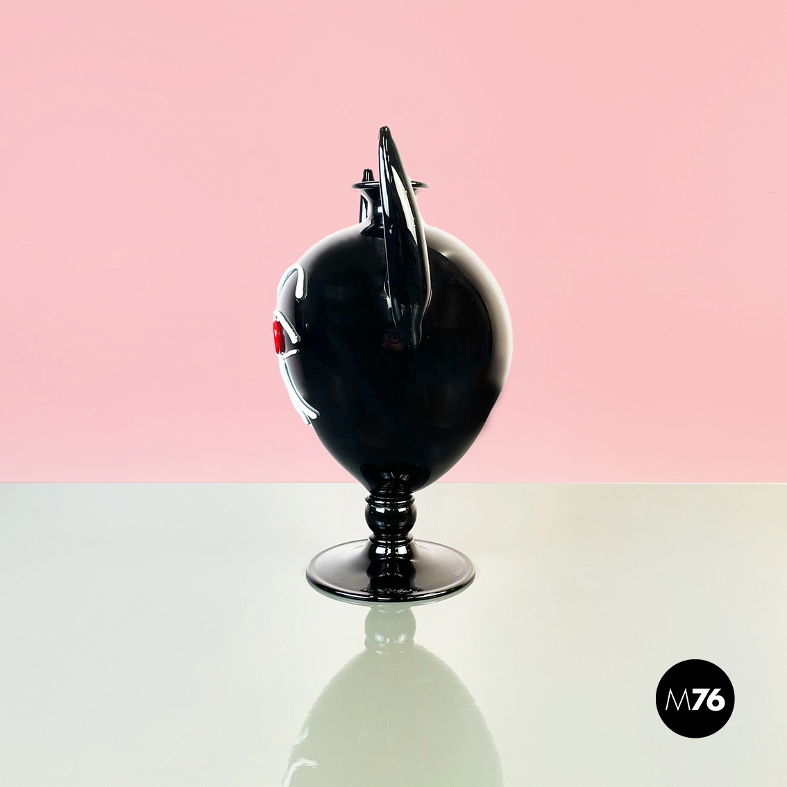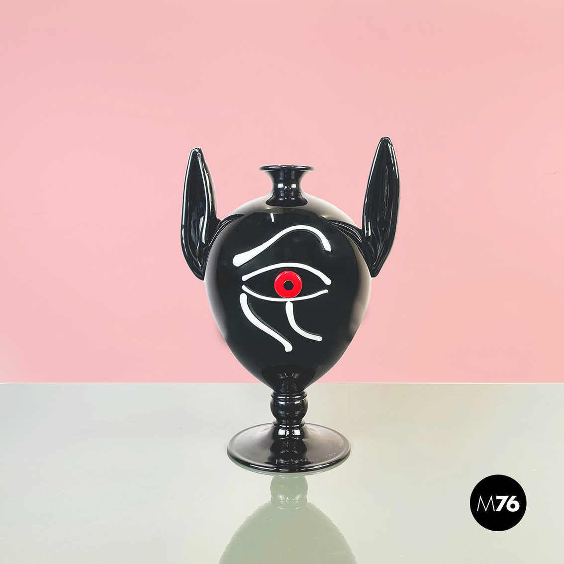 Vaso modello Veronese in vetro di Murano nero, pezzo unico in quanto prototipo del vaso messo in seguito in produzione. Il fronte è decorato con applicazioni a caldo dell occhio di Iside in vetro di Murano rosso e di filamenti di vetro di Murano bianco. Presenta ai lati due orecchie nere allungate, applicate a caldo.