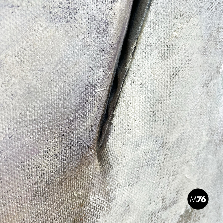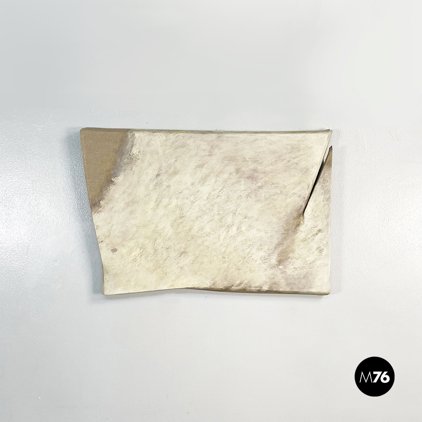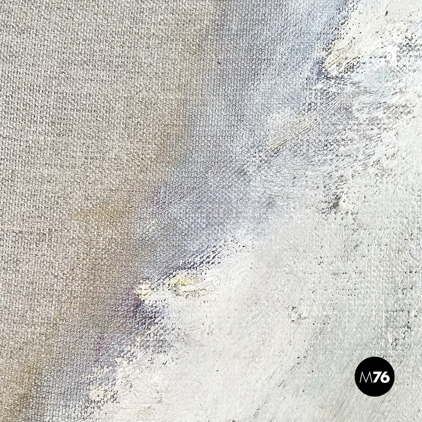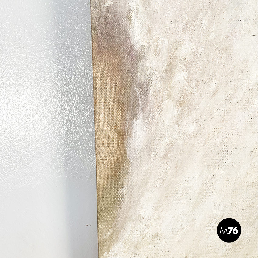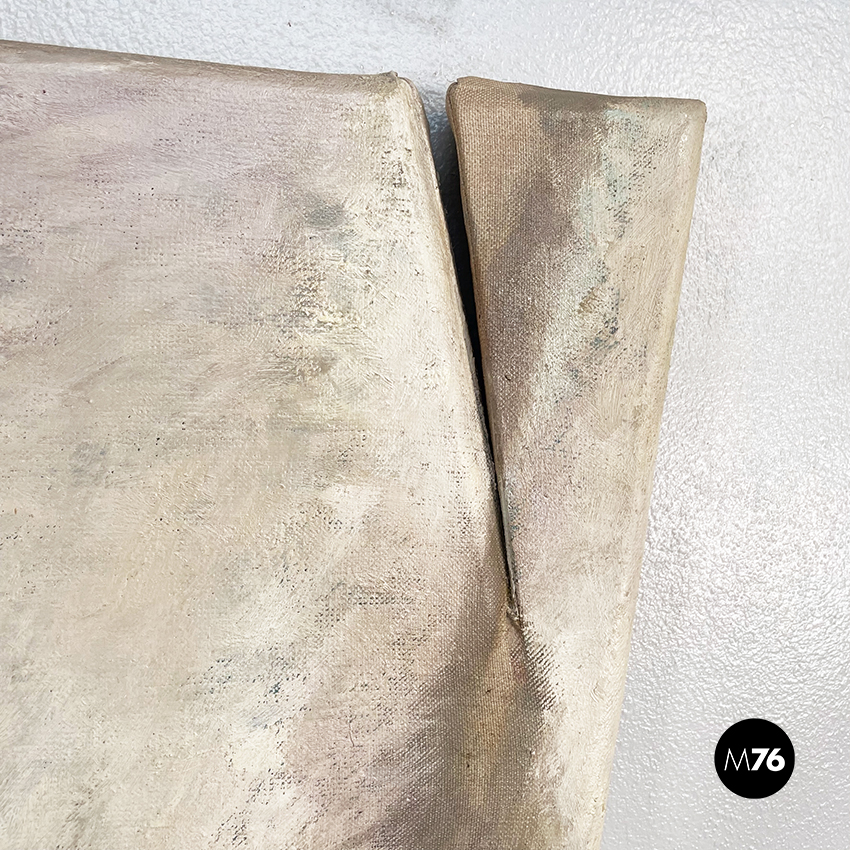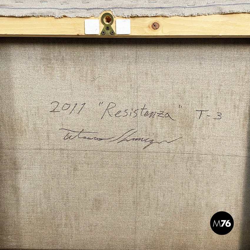 Coppia di quadri astratti intitolati T3 Resistenza e T4 Persistenza, olio su tela. La tela usata è tendente al grigio, i colori utilizzati sono beige, bianco e grigio. Il telaio presenta una forma irregolare.
