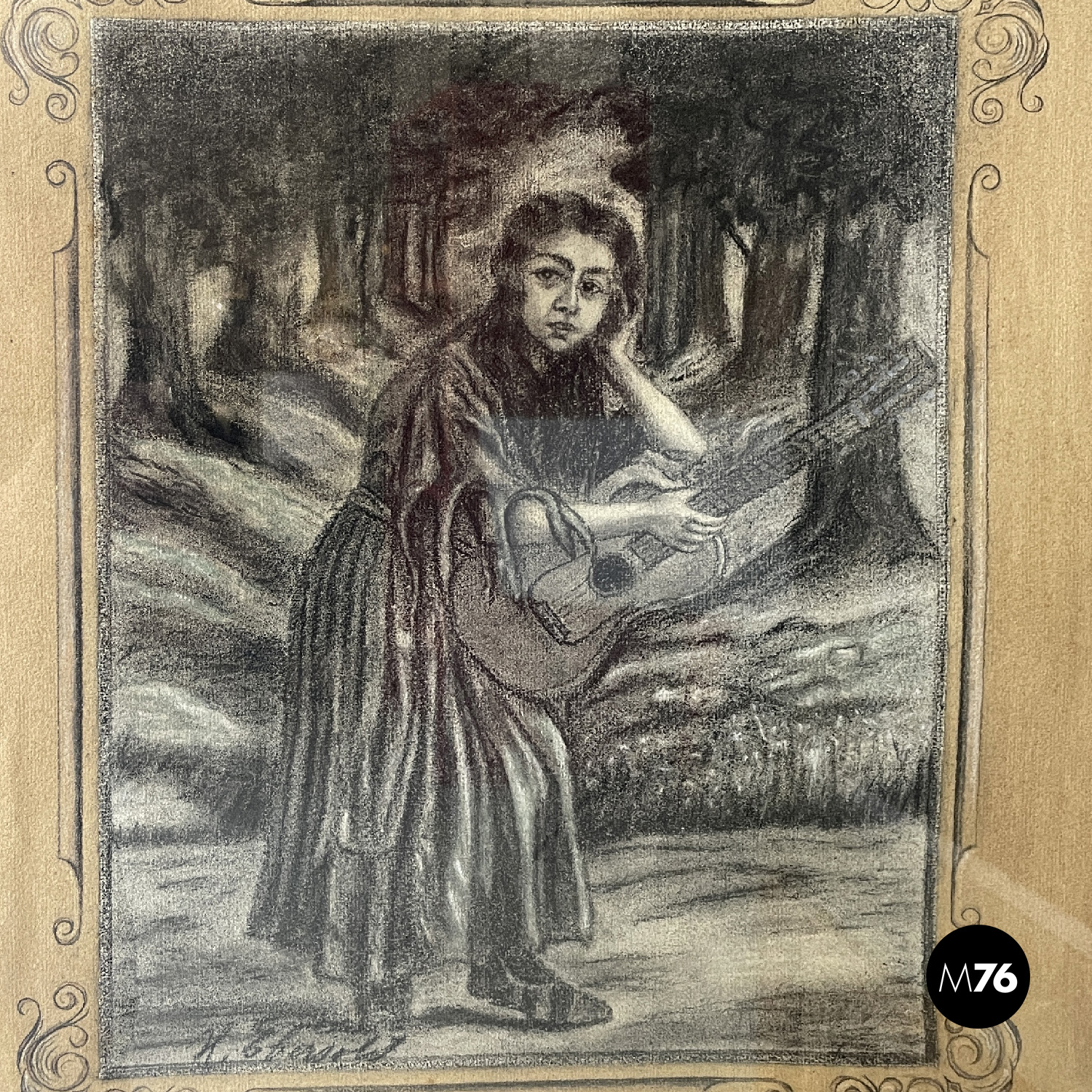 Quadro con disegno a carboncino e cornice in legno. Il disegno rappresenta una ragazza che suona la chitarra in un bosco, il disegno è arricchito ai lati e sugli angoli da decorazioni e ghirigori disegnati a matita. La cornice interamente in legno presenta una forma rettangolare che si stringe alla base ed ha gli angoli e la parte centrale in alto decorati con forme geometriche.