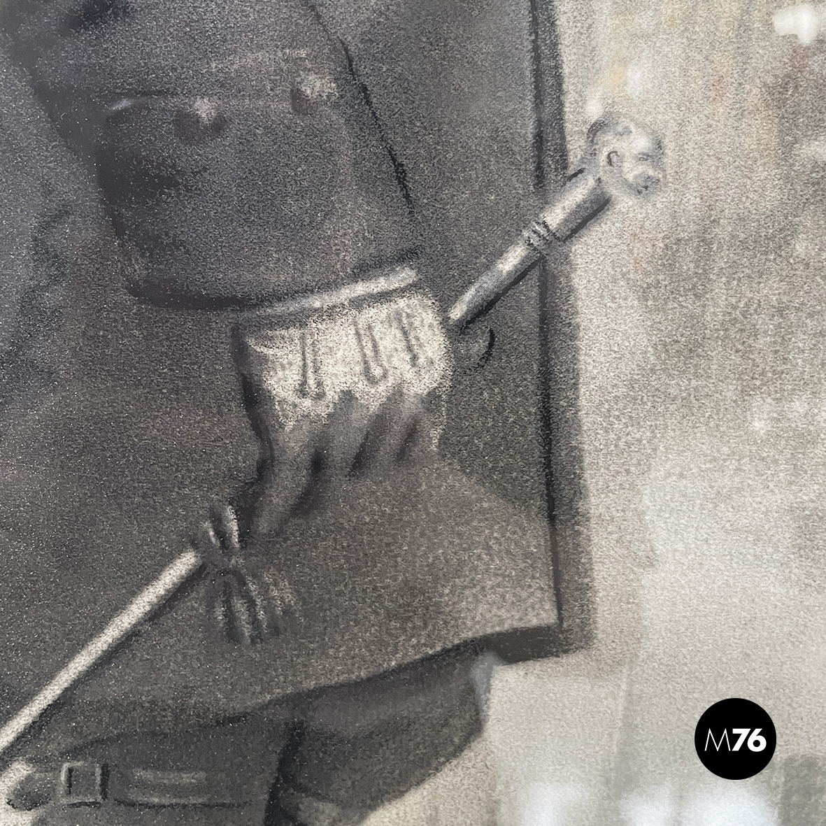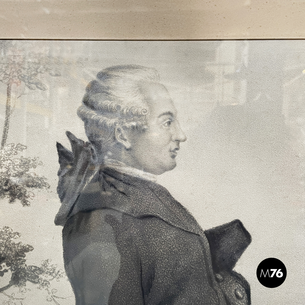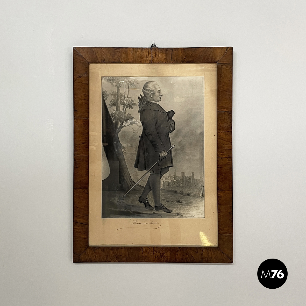 Quadro a carboncino su carta raffigurante Pierre-Augustin Caron de Beaumarchais, famosa figura poliedrica francese del 1700. Il soggetto è rappresentato in piedi, di profilo, immerso in un paesaggio verdeggiante. Sullo sfondo è presente una città. Il passepartout di carta presenta la scritta Beaumarchais in corsivo. In cornice di grosso spessore in legno.