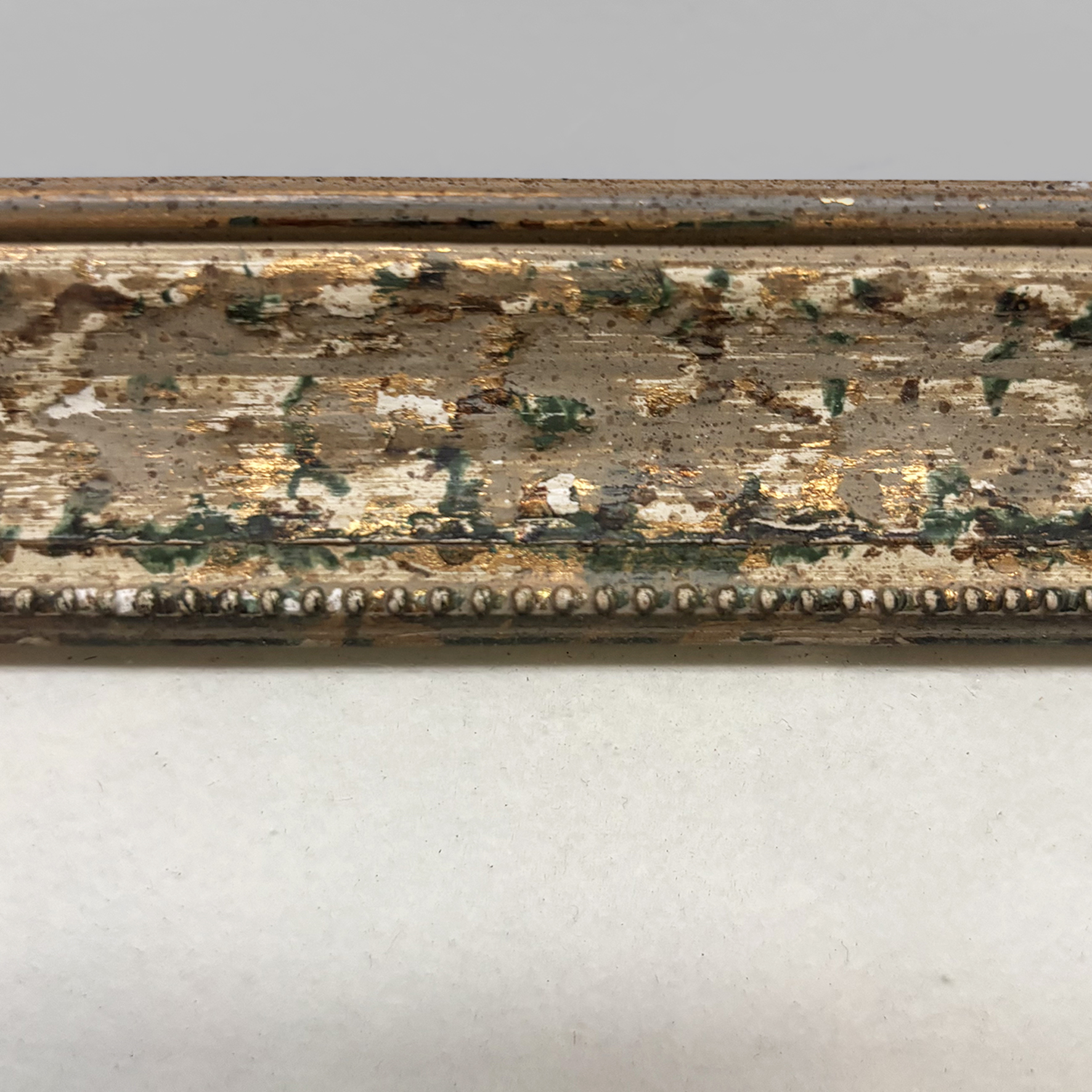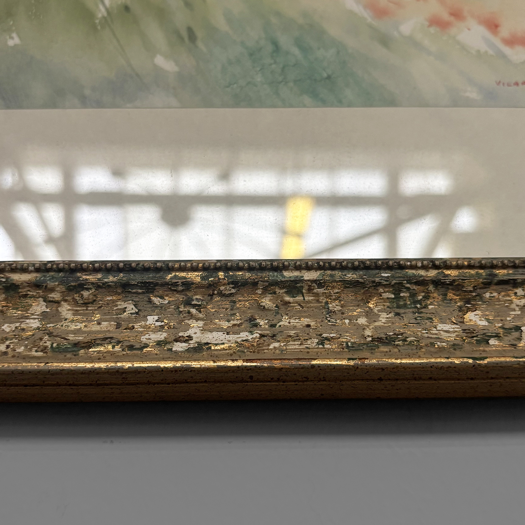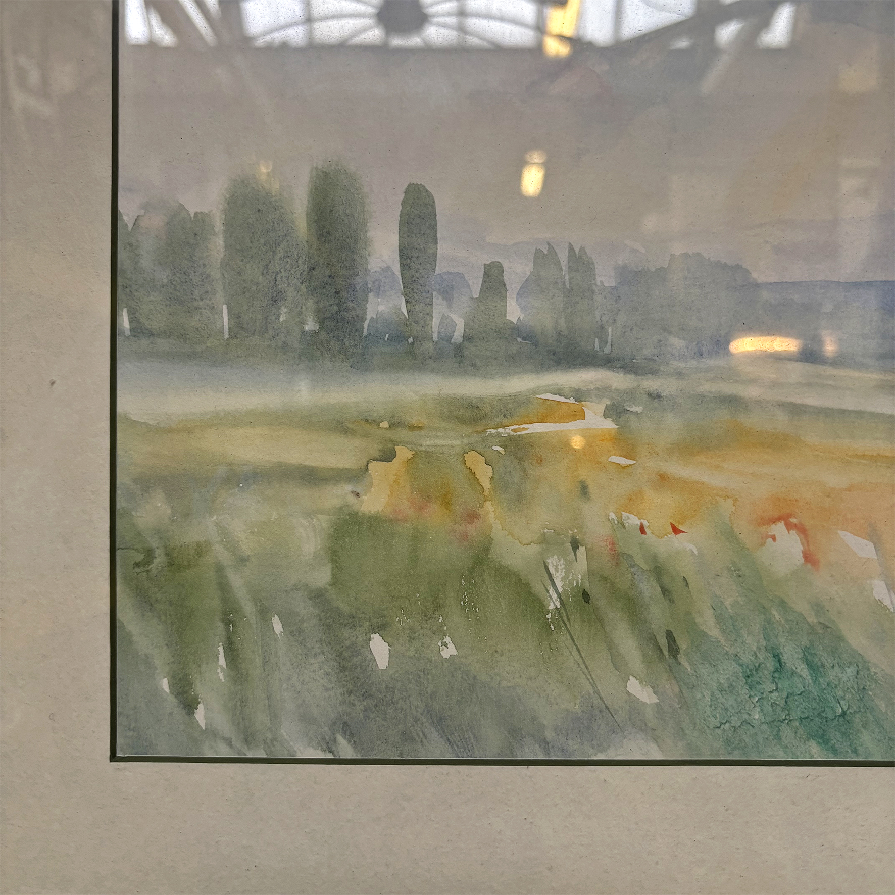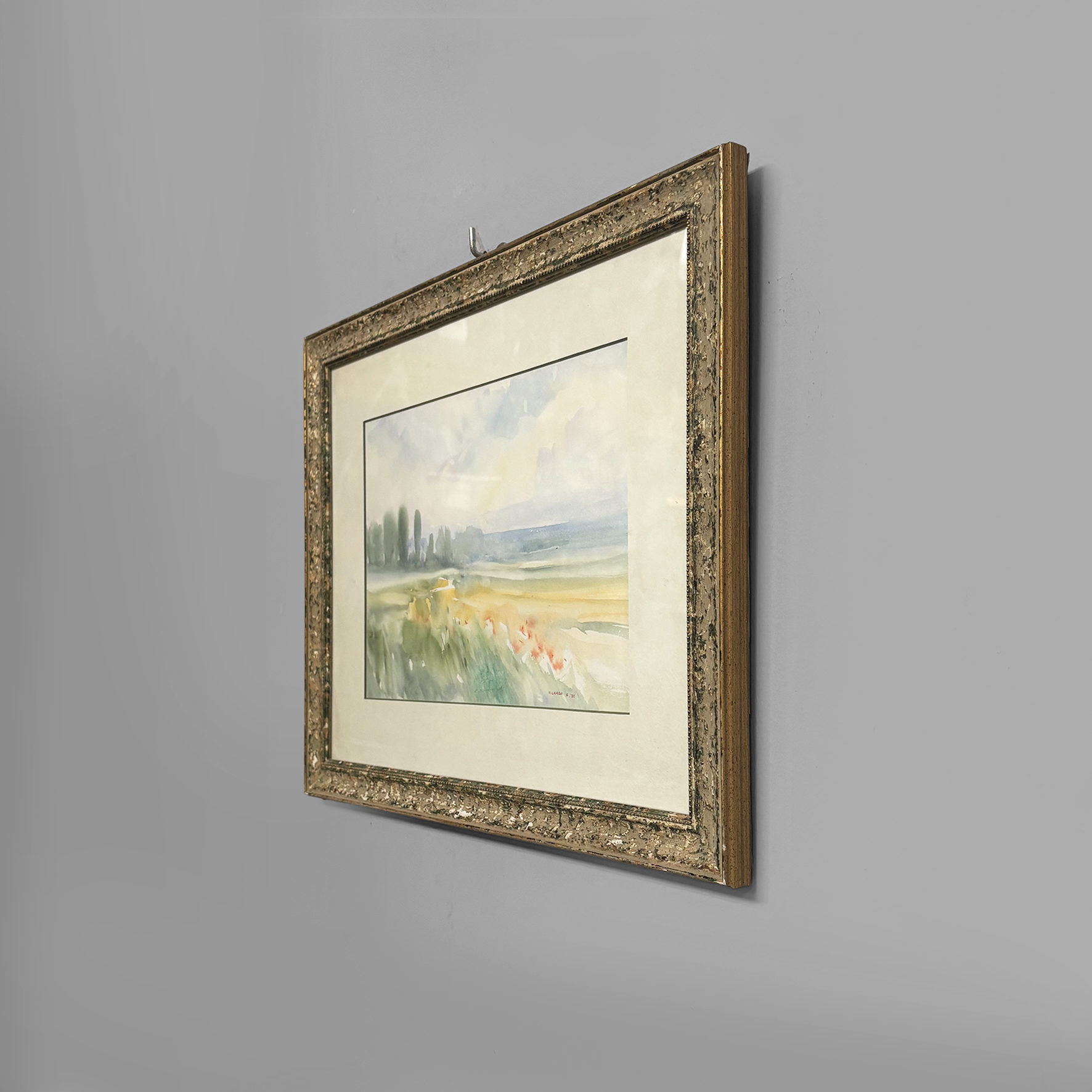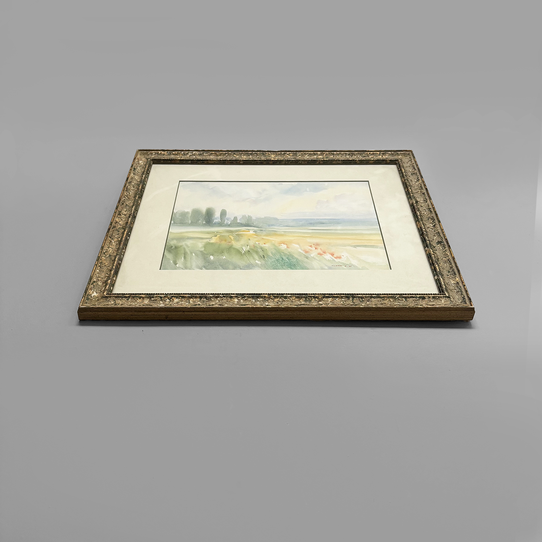 Quadro ad acquarello su carta, raffigurante un paesaggio di campagna con alberi verdeggianti e un cielo azzurro. Passepartout in carta bianca, cornice in legno con dettagli dorati e verdi e vetro.