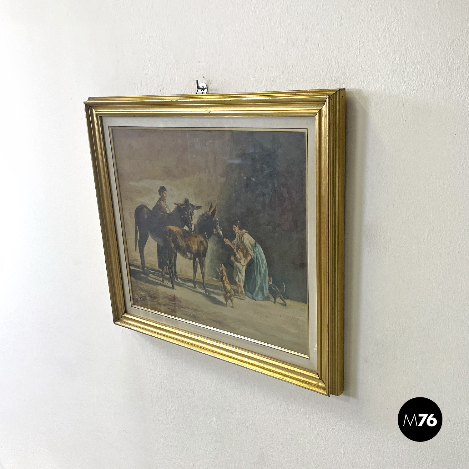 Dipinto ad olio con cornice rettangolare. Il quadro rappresenta due asini accompagnati da una ragazza, un’altra figura femminile con un bambino, un cane e un gatto in un ambiente agricolo. I colori sono principalmente sui toni del beige e del marrone, fatta eccezione per la gonna celeste della donna sulla destra. Presenta una cornice in legno dorato con passepartout interno.