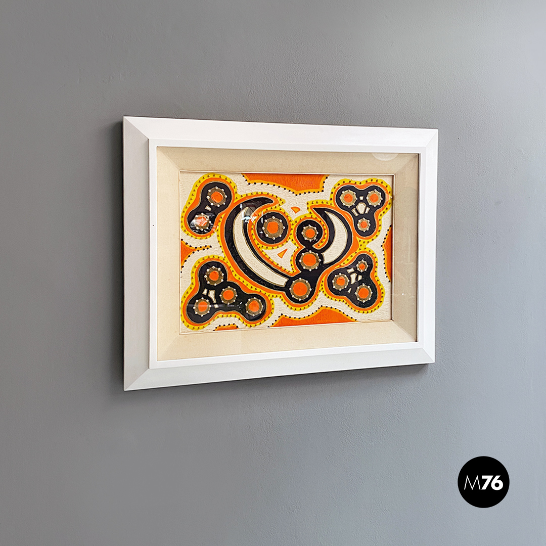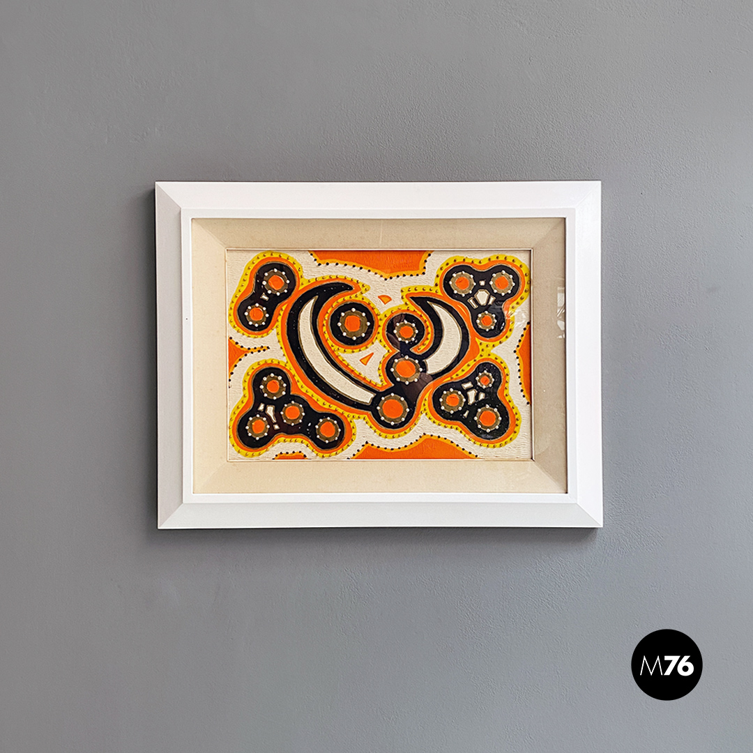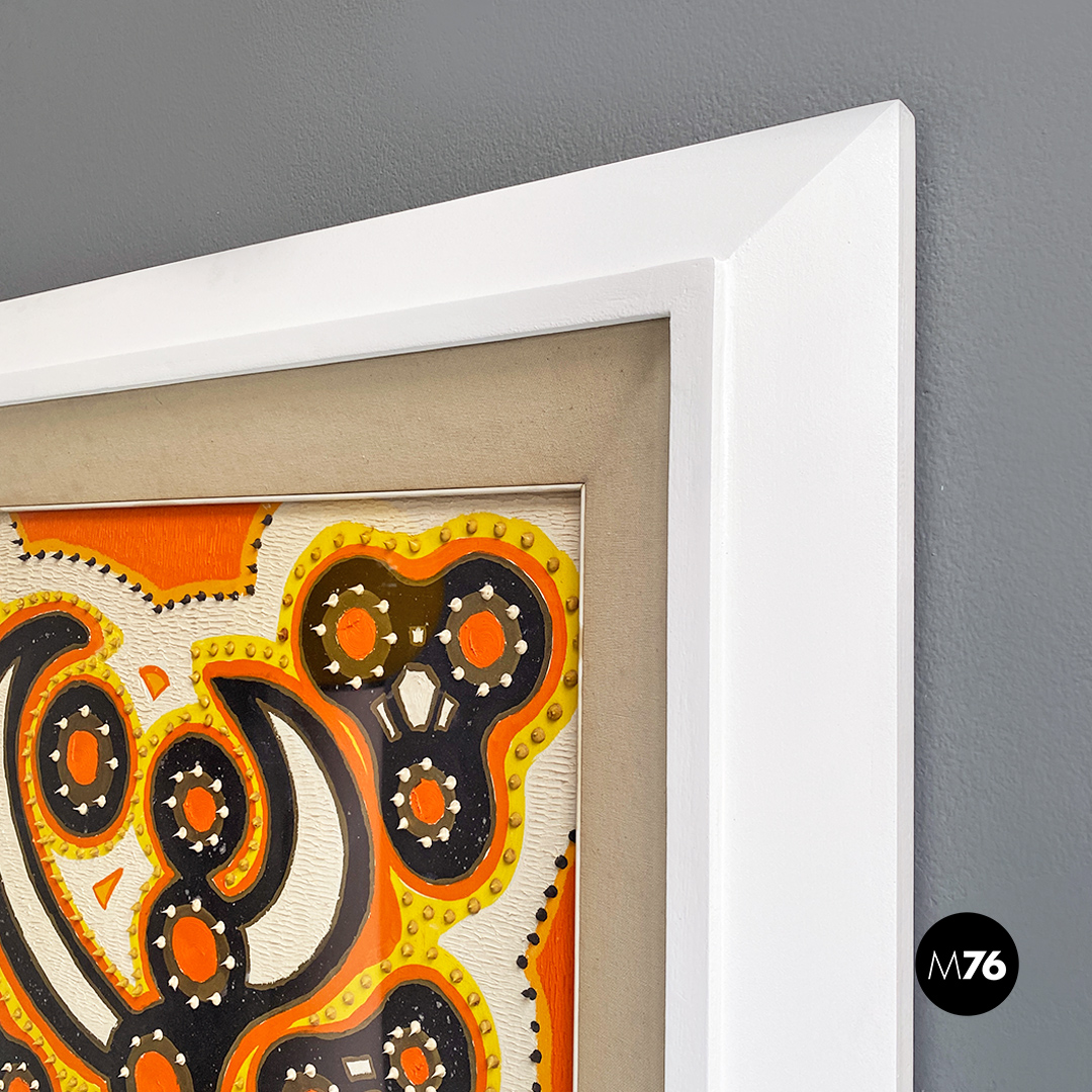 Quadro astratto con motivo a gocce in rilievo all’interno del dipinto, sui toni dell’arancio, giallo e blu con cornice restaurata e riverniciata a nuovo in bianco e passpartout in tela.