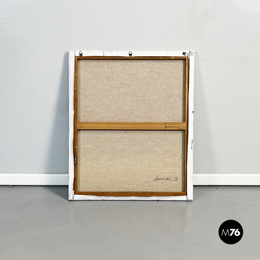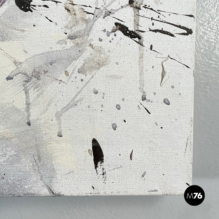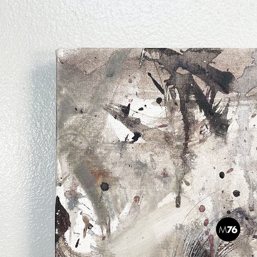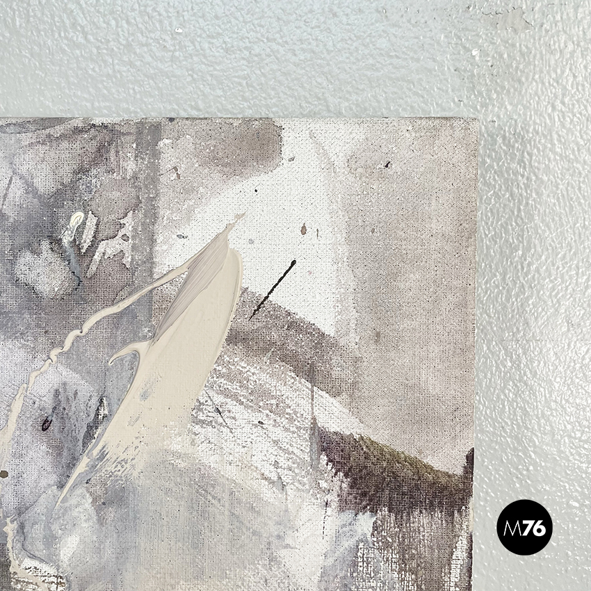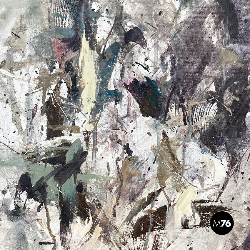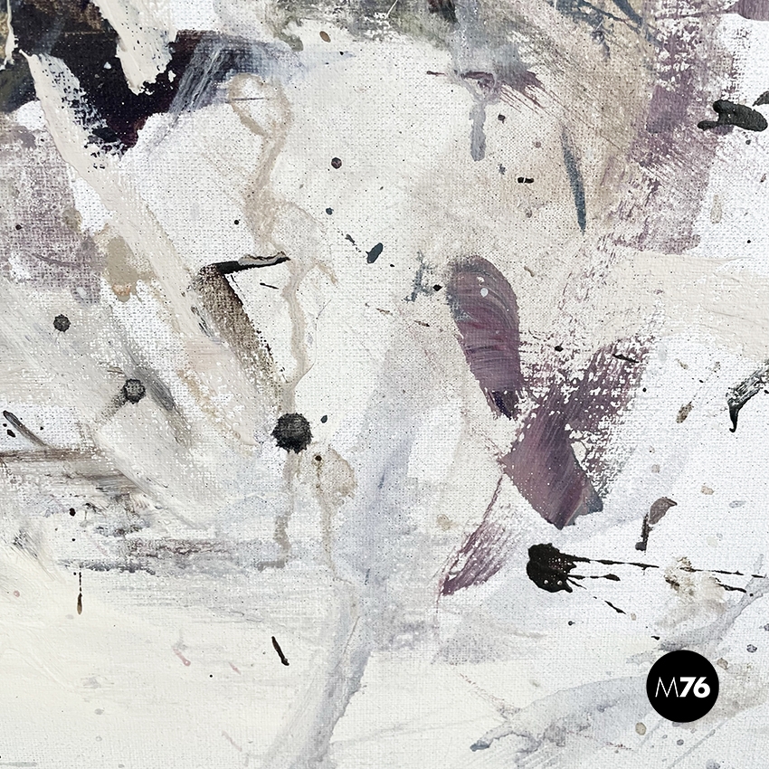 Quadro astratto a tecnica mista su tela bianca. I colori presenti spaziano dal beige, al viola, al verdone e al grigio. Telaio in legno.