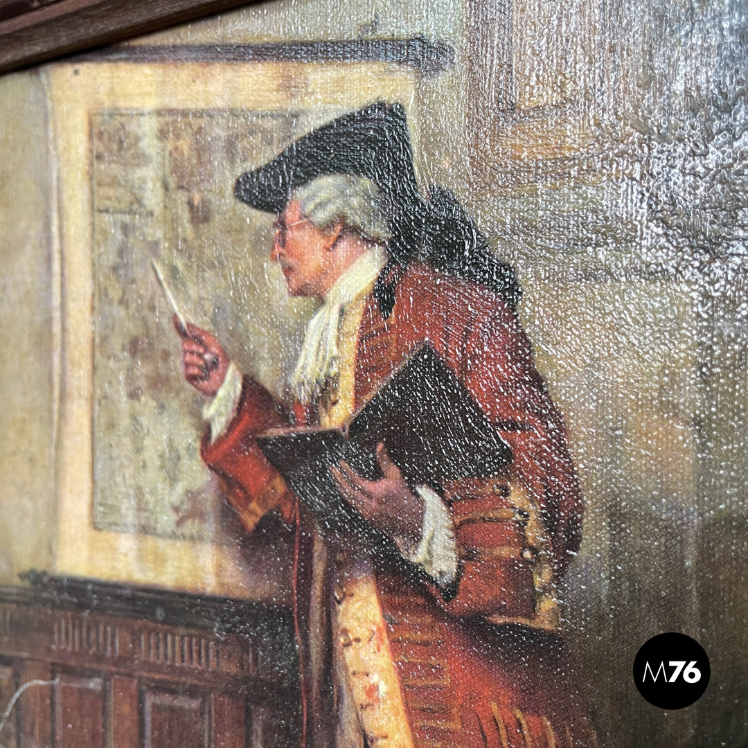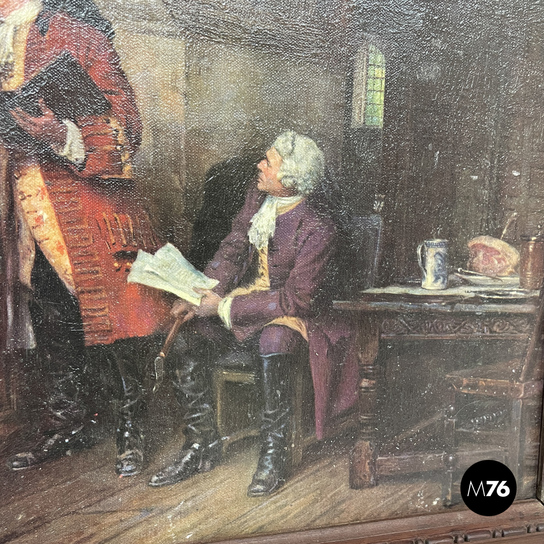 Quadro rettangolare con cornice il legno lavorata con decorazioni tondeggianti ripetute. Il quadro rappresenta due figure maschili intenti ad osservare una mappa appesa alla parete, presumibilmente in uno studio. I due personaggi sono illuminati e portano abiti sui toni del rosso e del viola, mentre l’ambiente intorno a loro è quasi interamente in legno e più in ombra.
