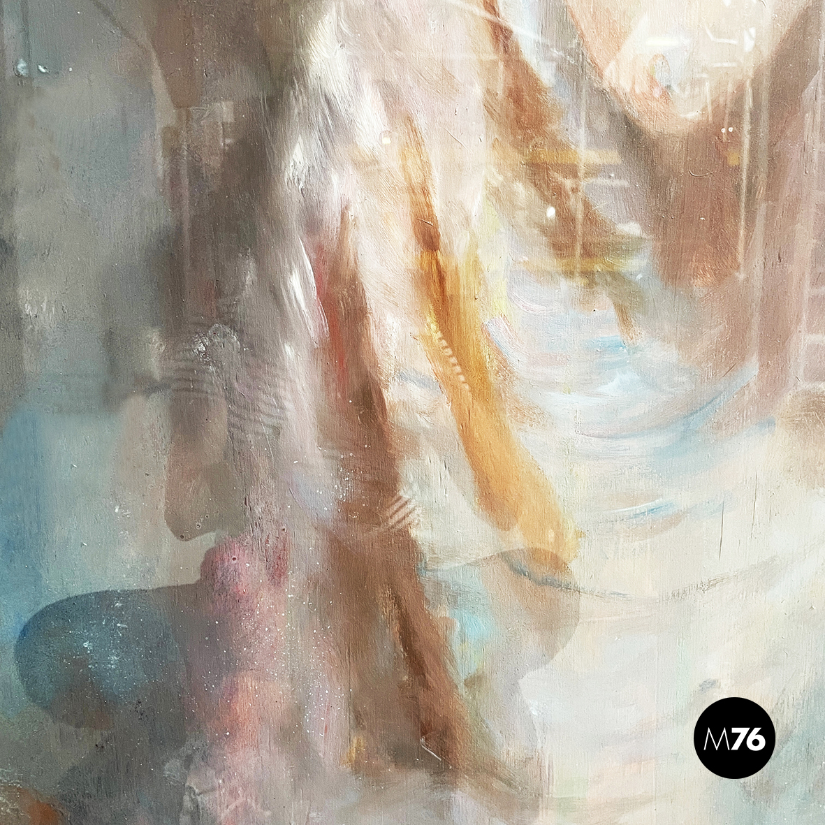 Quadro rettangolare con cornice in legno finemente lavorato e decorato con disegni in oro. Il dipinto raffigura tre donne con i capelli corti o legati. I colori del dipinto sono sfumati e vividi. La cornice presenta il vetro.