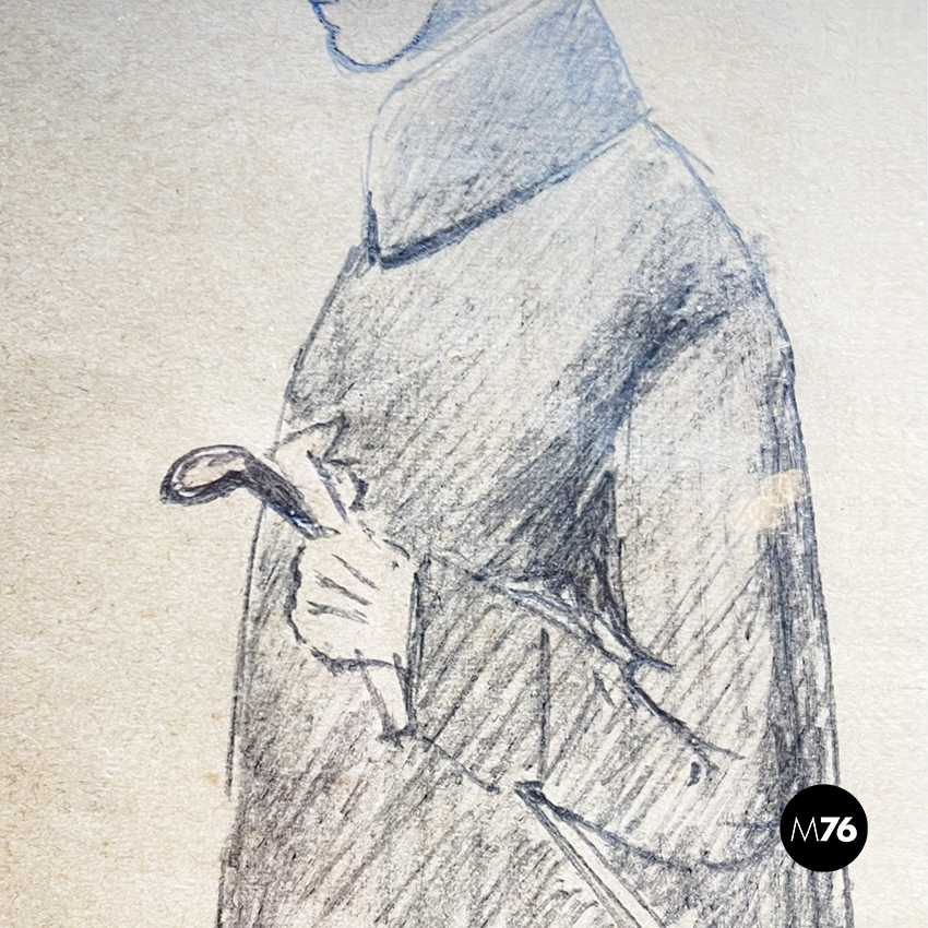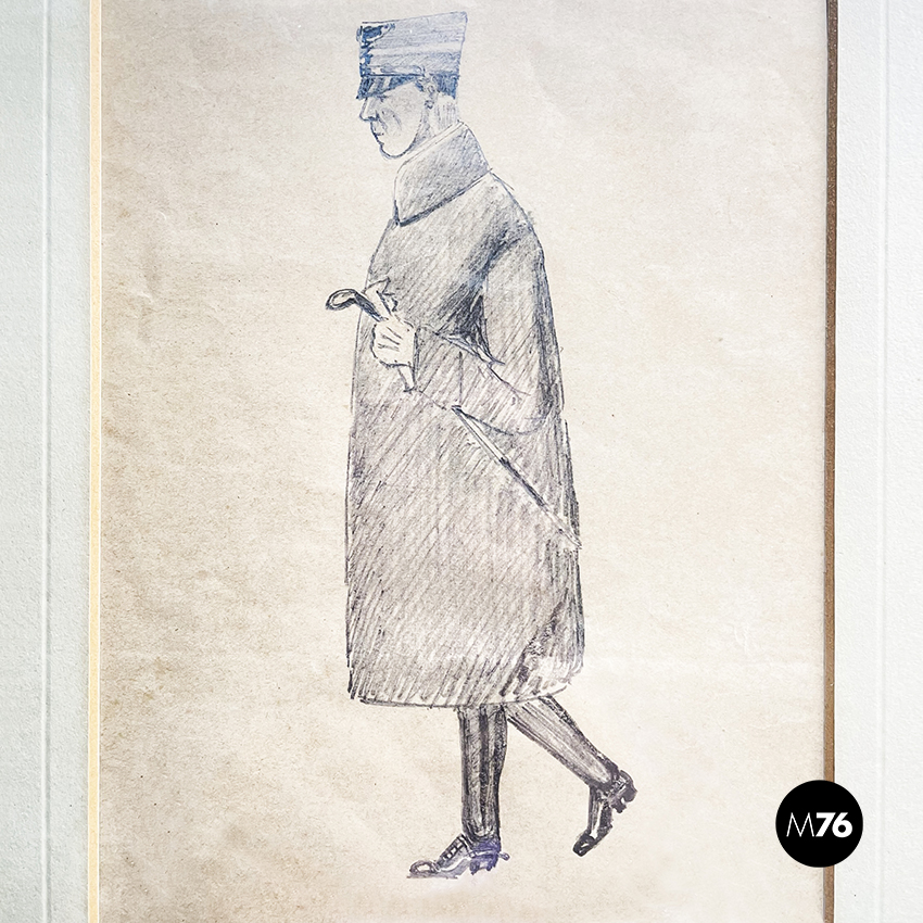 Disegno a matita su carta, rappresentante un uomo in cappotto con cappello e bastone che passeggia. In passepartout bianco-beige e cornice in legno.