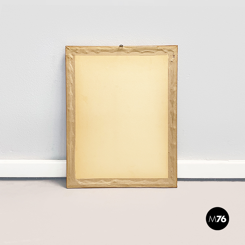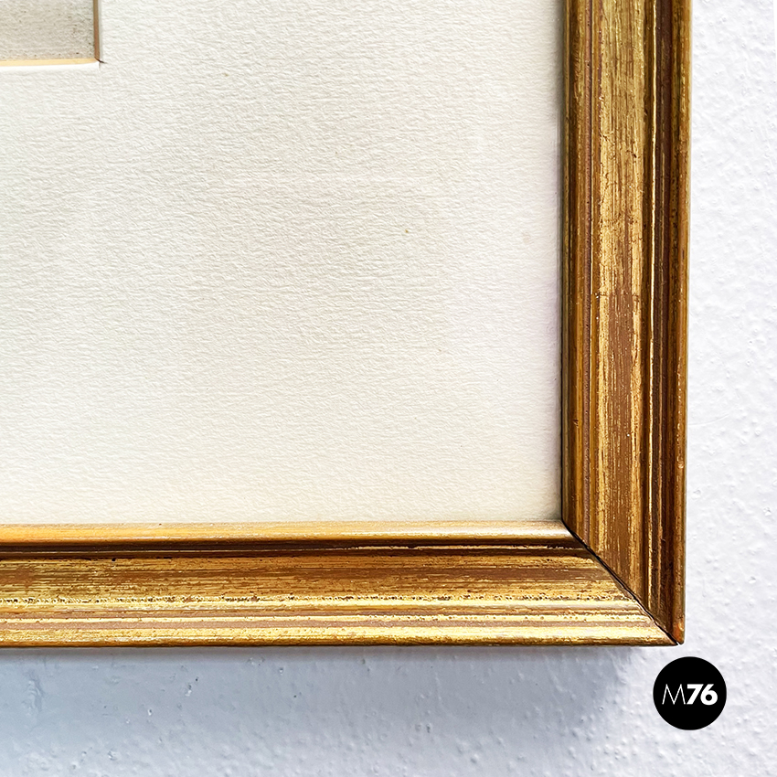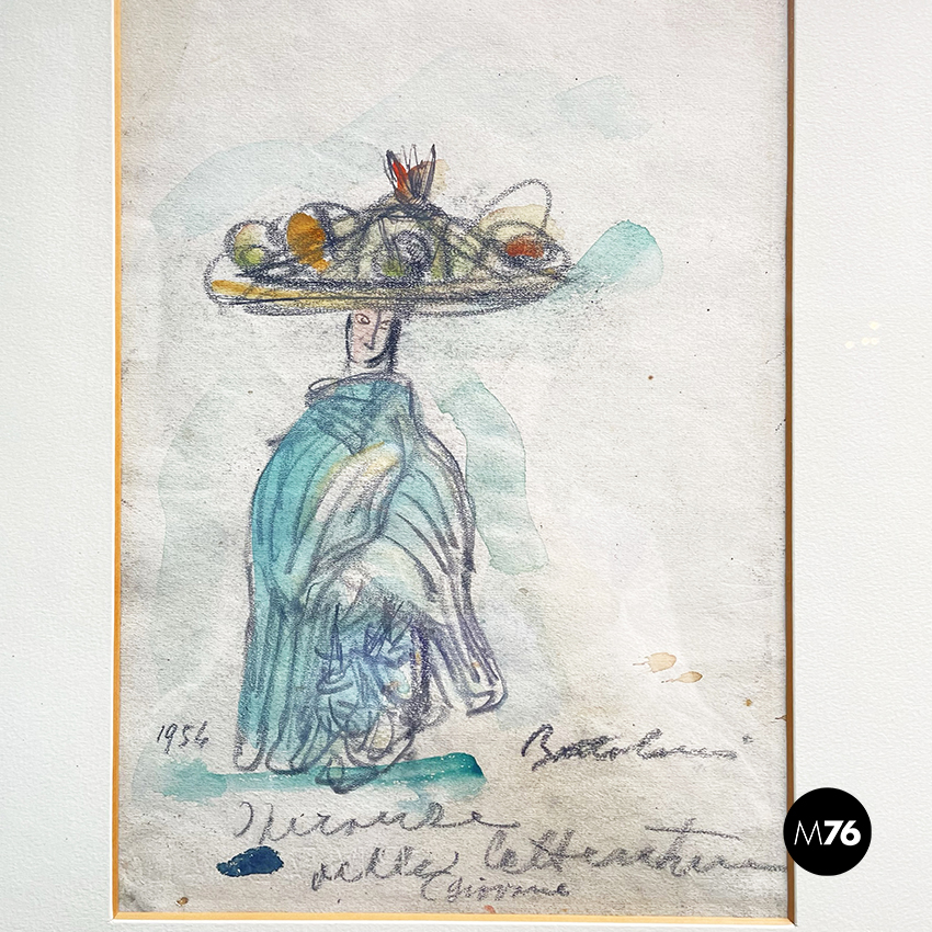 Disegno a pastello e acquarello su carta, rappresentante una persona avvolta in vestito ampio azzurro con in testa un cappello estroso. In passepartout bianco e cornice dorata in legno.
