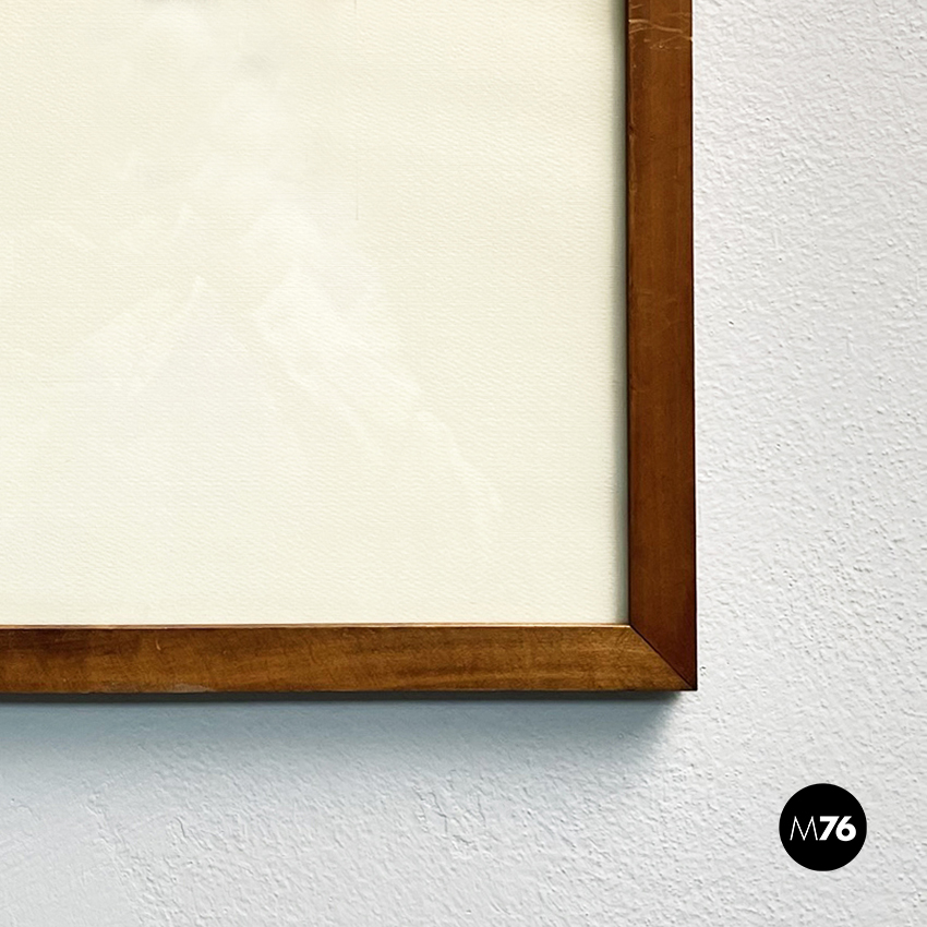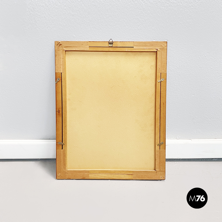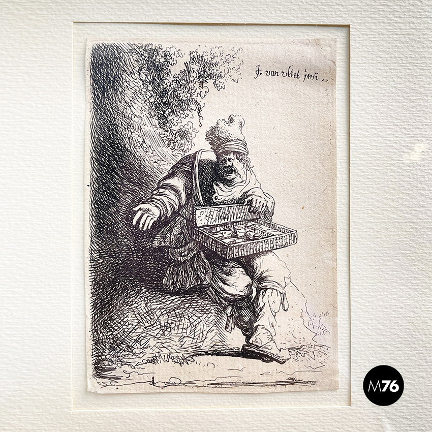 Stampa realizzata con la tecnica di incisione ad acquaforte su carta, rappresentante un venditore ambulante che vende merci dal suo vassoio. La scena riprende un soggetto di un’incisione di Rembrandt. In passepartout bianco e cornice in legno.