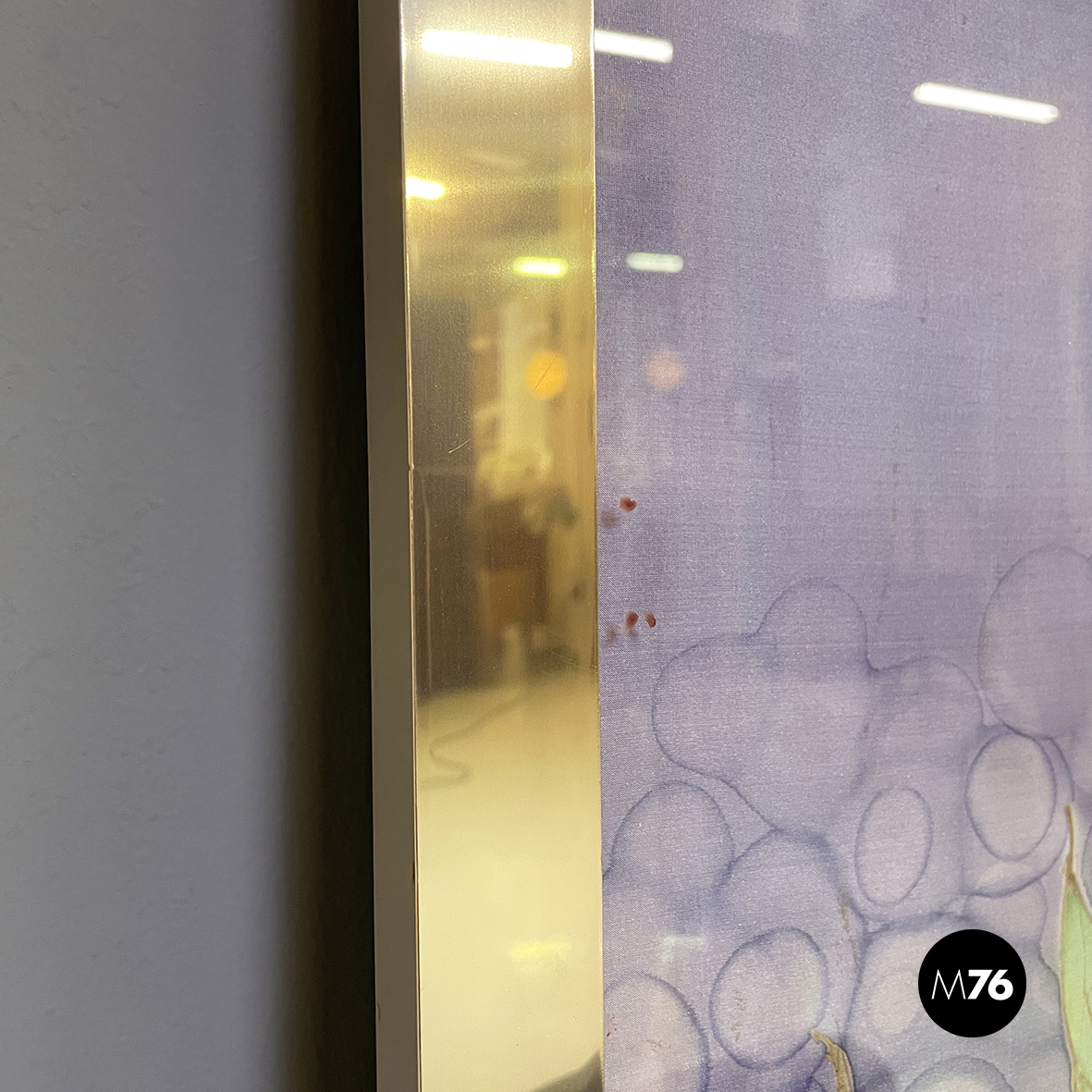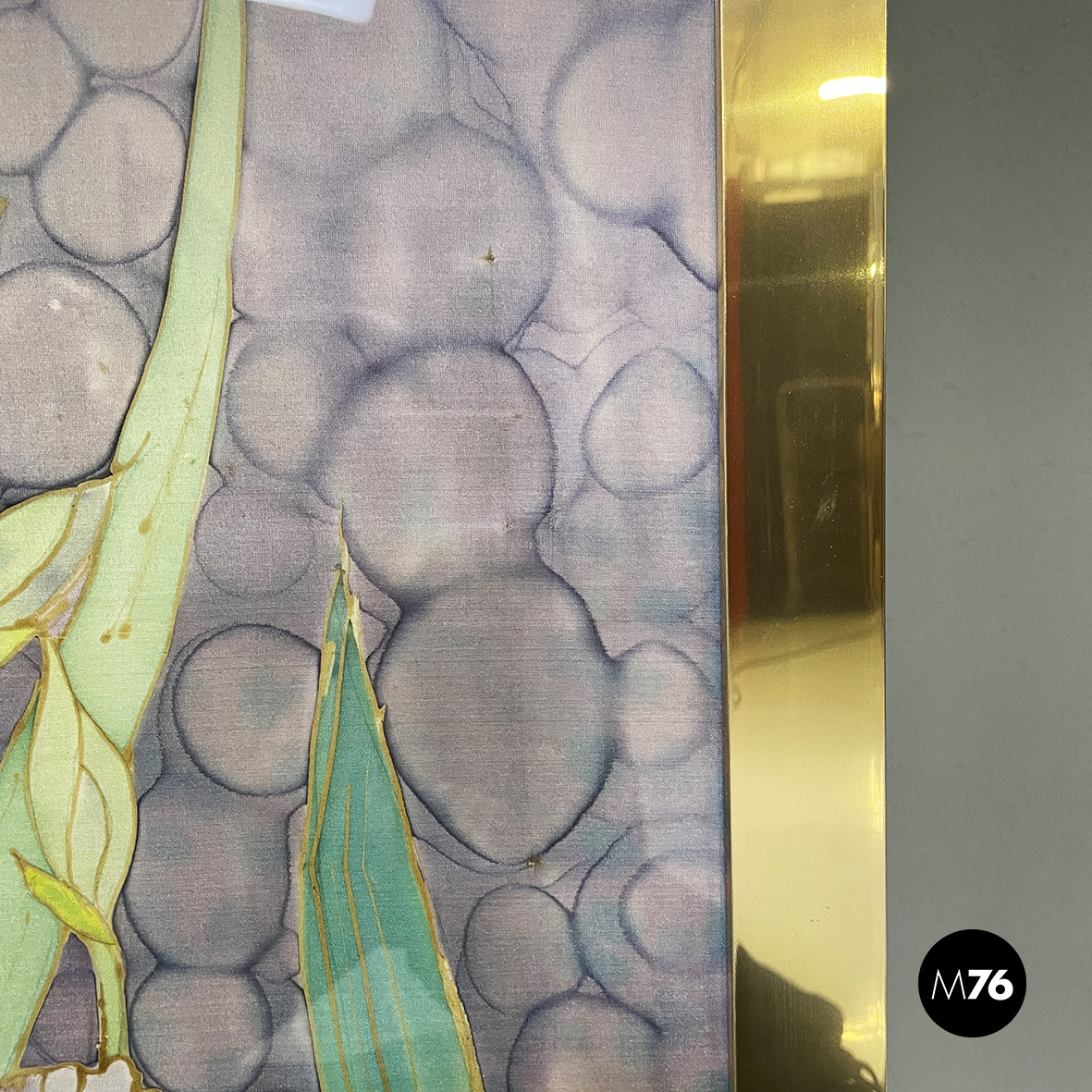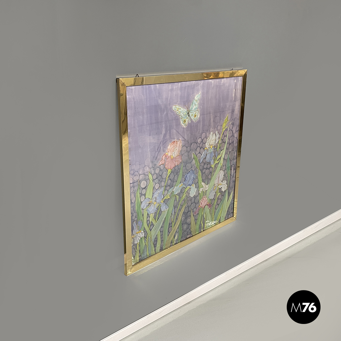 Quadro su tela raffigurante dei fiori colorati blu e rosati, in perfetto stile liberty. Nella parte alta del disegno è presente una farfalla azzurra. Lo sfondo è sui toni del viola. In cornice di metallo con finitura dorata.