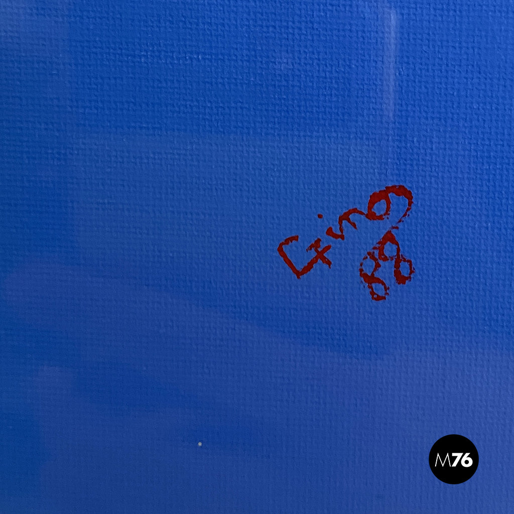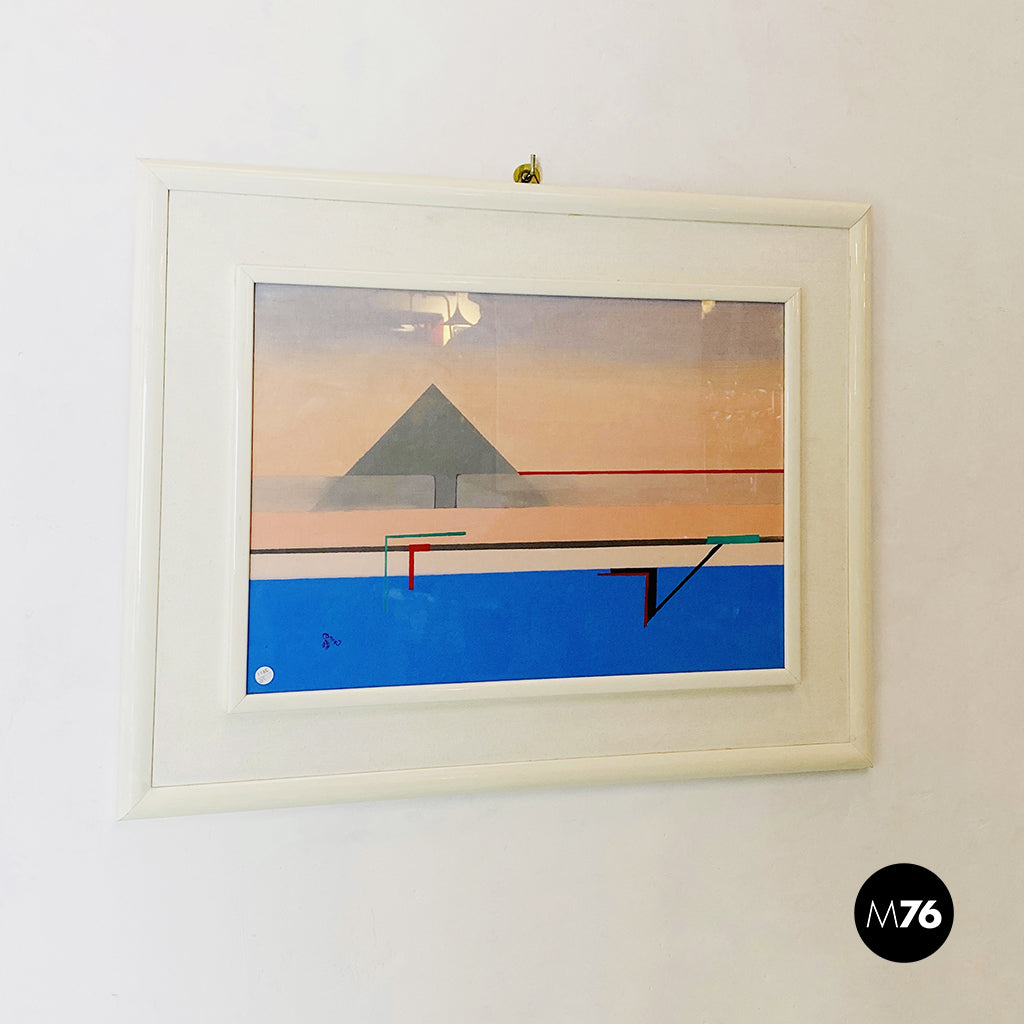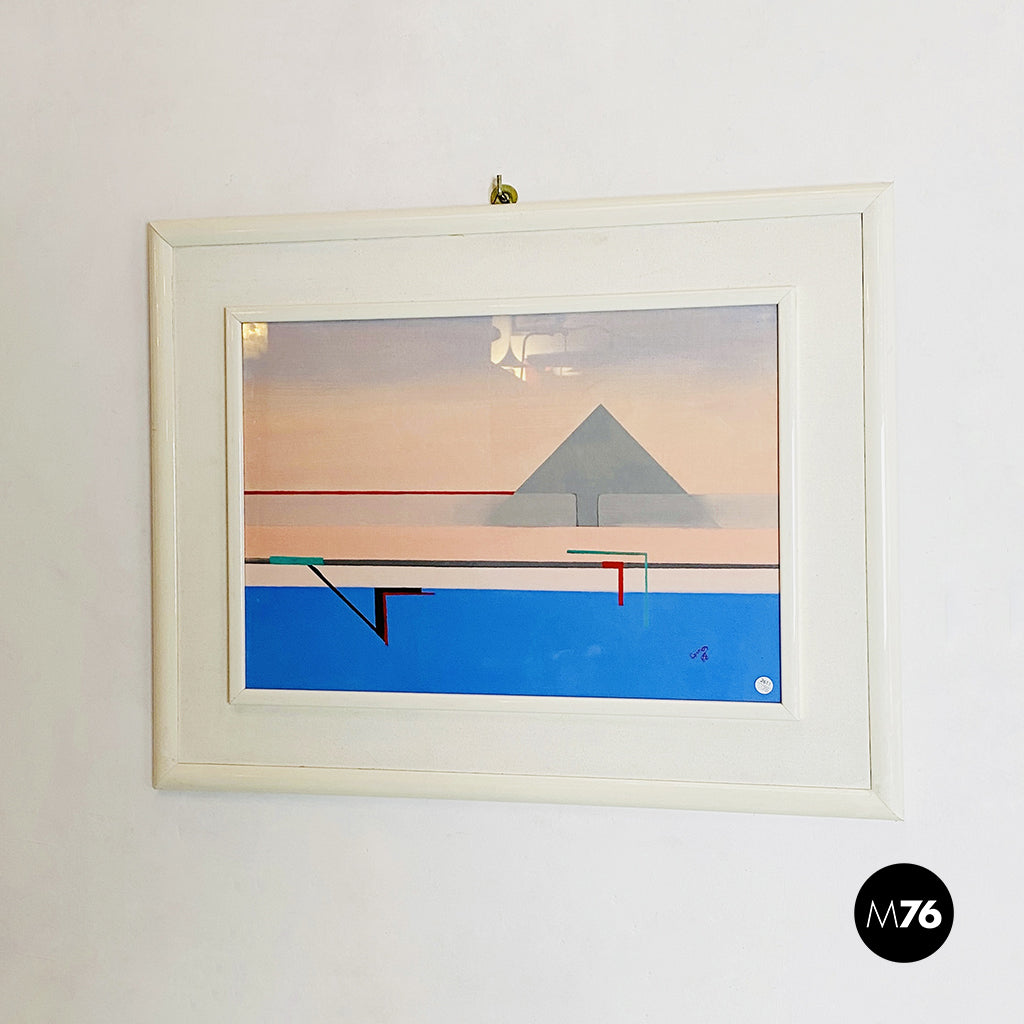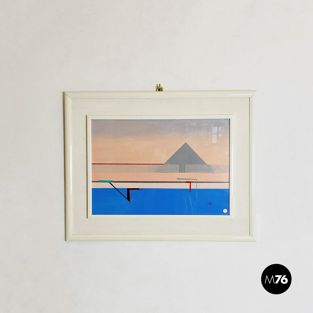 Dipinto dai colori pastello con rappresentazione geometrica che rimanda ad un paesaggio marino, con cornice in legno, passe-partout in tessuto e firma dell’autore in basso a sinistra.