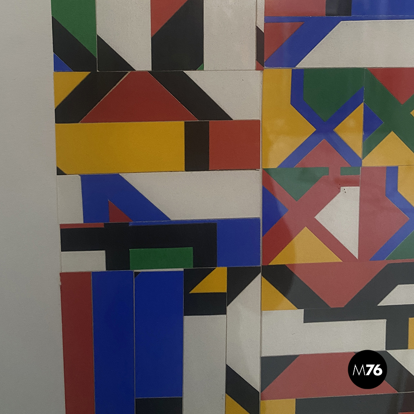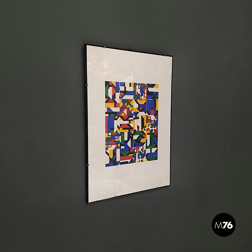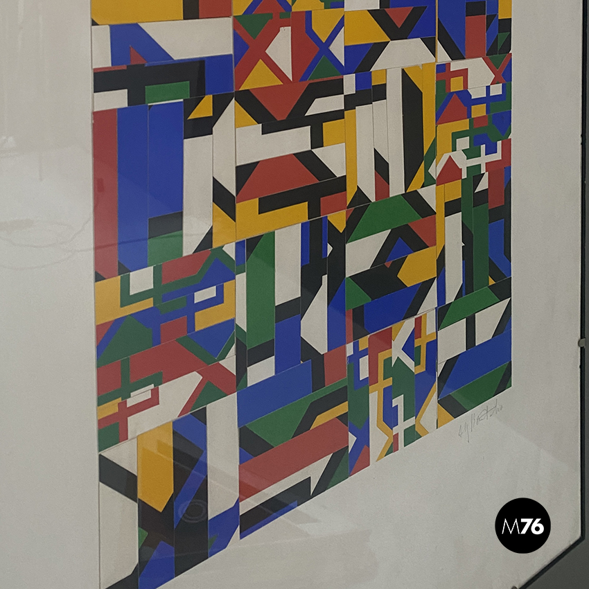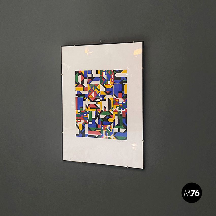 Quadro di forma rettangolare con tecnica a collage raffigurante forme geometriche colorate dai colori blu, giallo, rosso e verde. La cornice nera è realizzata su misura.