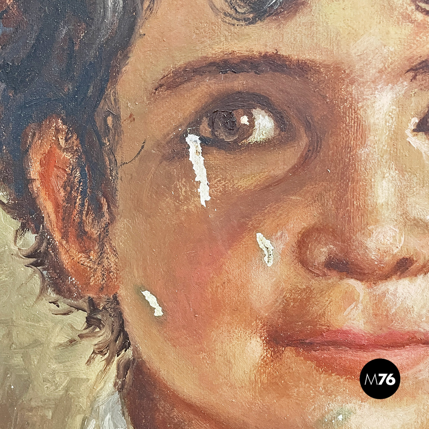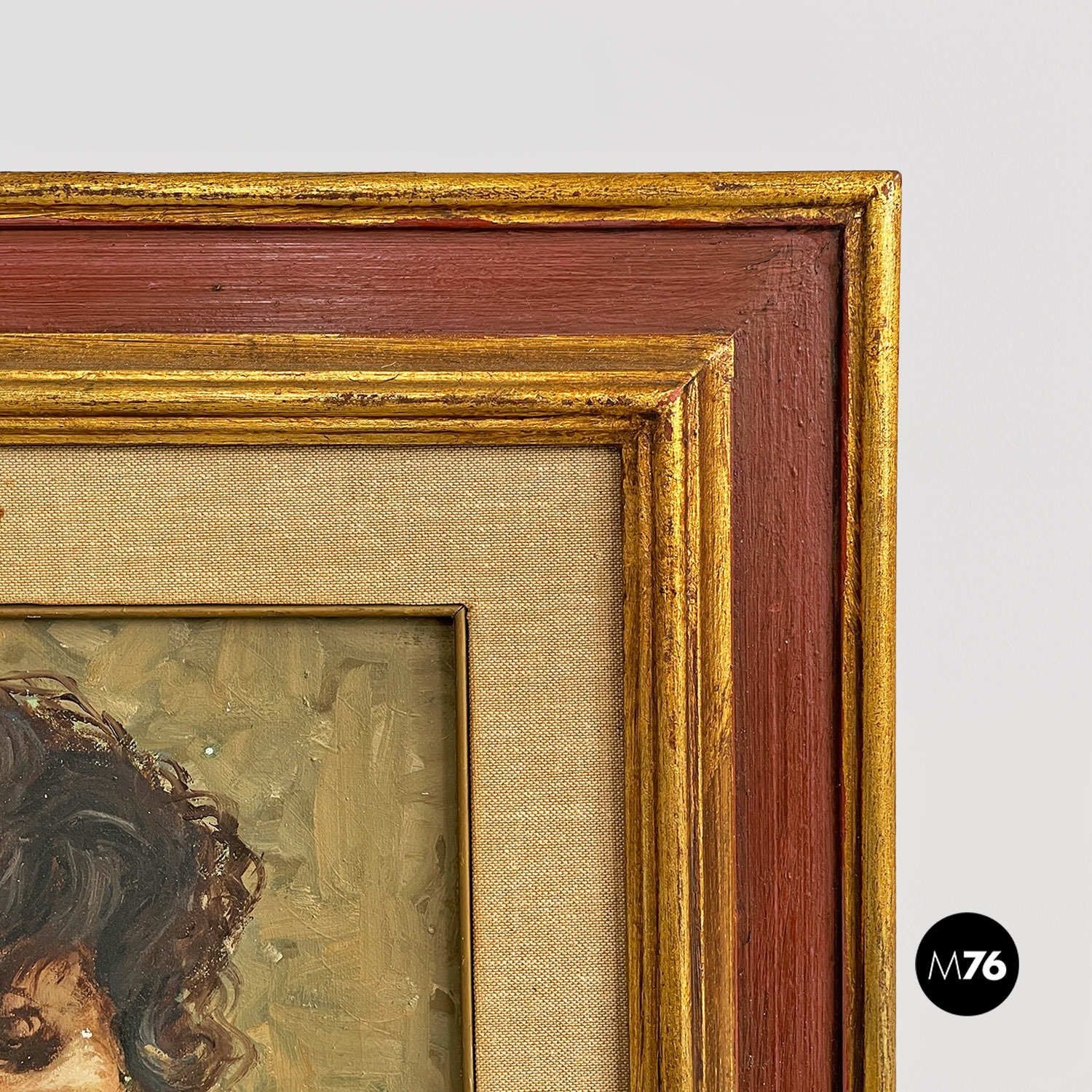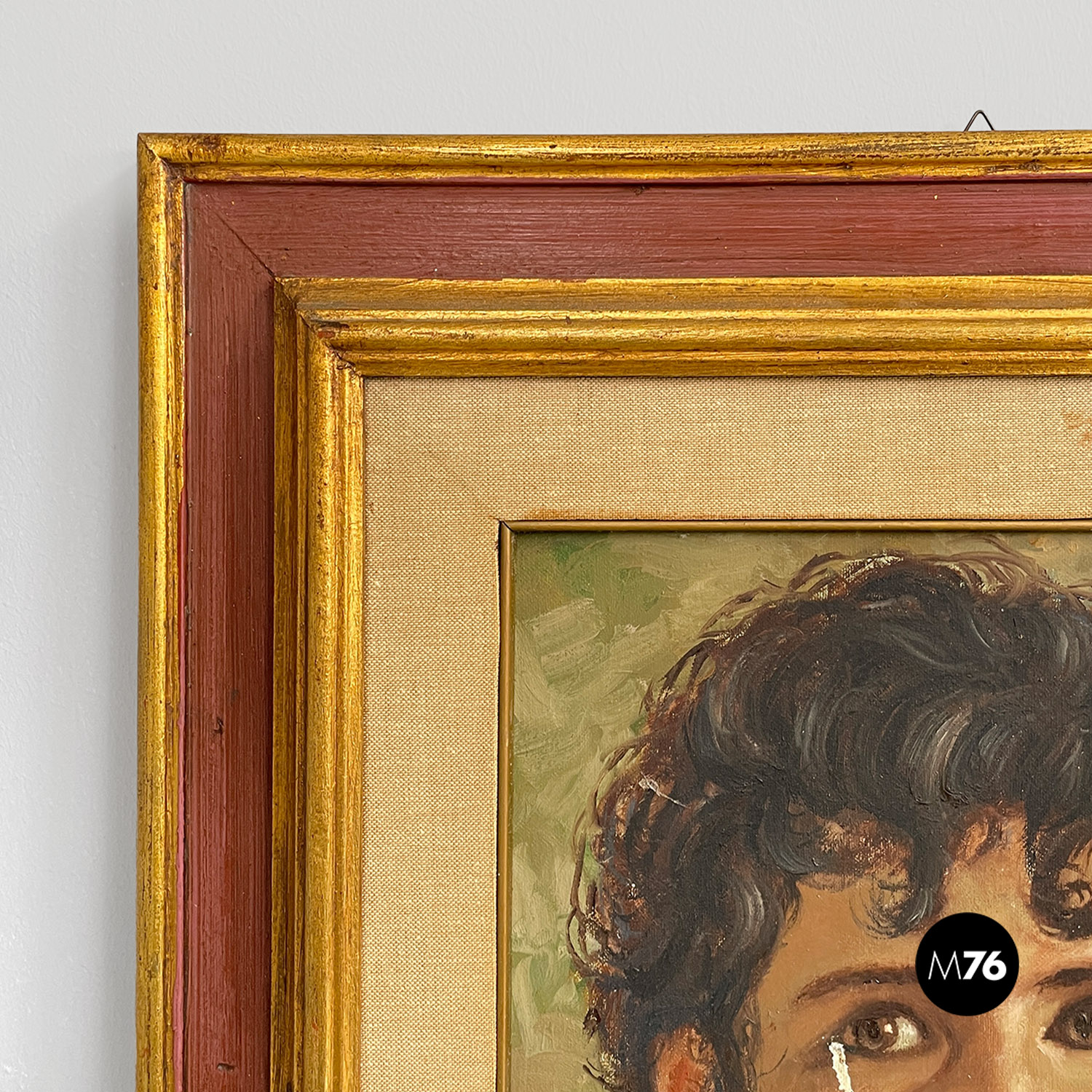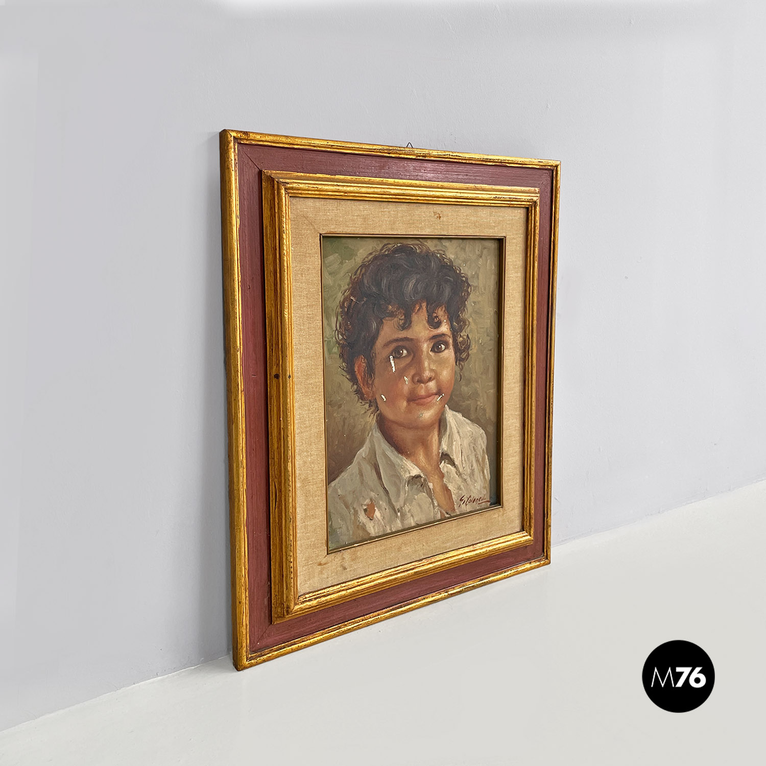 Dipinto realizzato con colori a tempera, rappresentante un bambino dai capelli scuri e mossi e un volto tondeggiante. I colori sono caldi e la cornice è realizzata in legno, dipinto oro o in tinta marrone e tessuto beige.