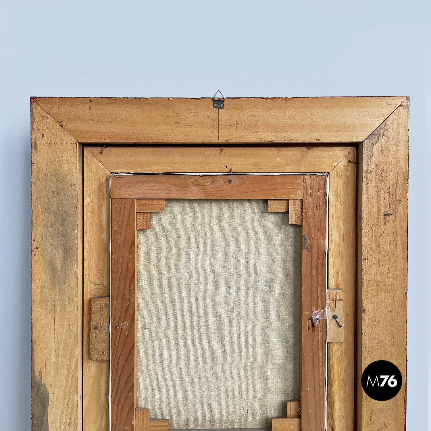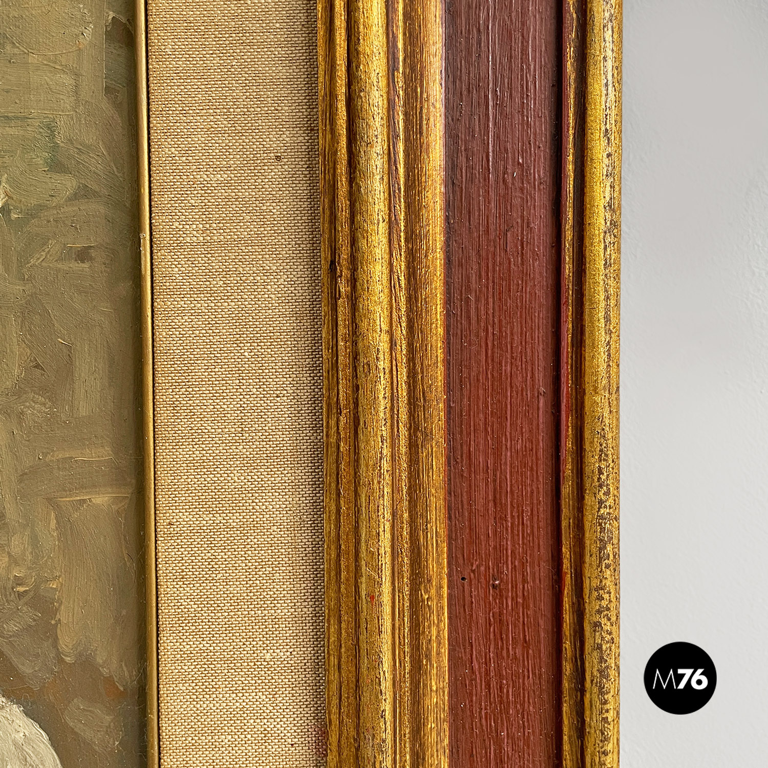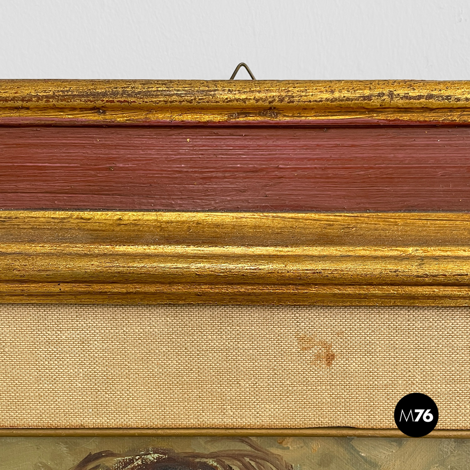 Dipinto realizzato con colori a tempera, rappresentante un bambino dai capelli scuri e mossi e un volto tondeggiante. I colori sono caldi e la cornice è realizzata in legno, dipinto oro o in tinta marrone e tessuto beige.