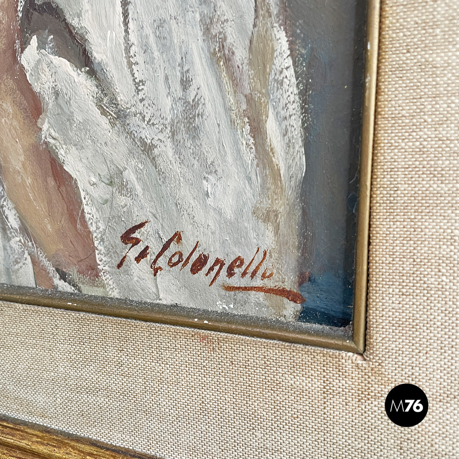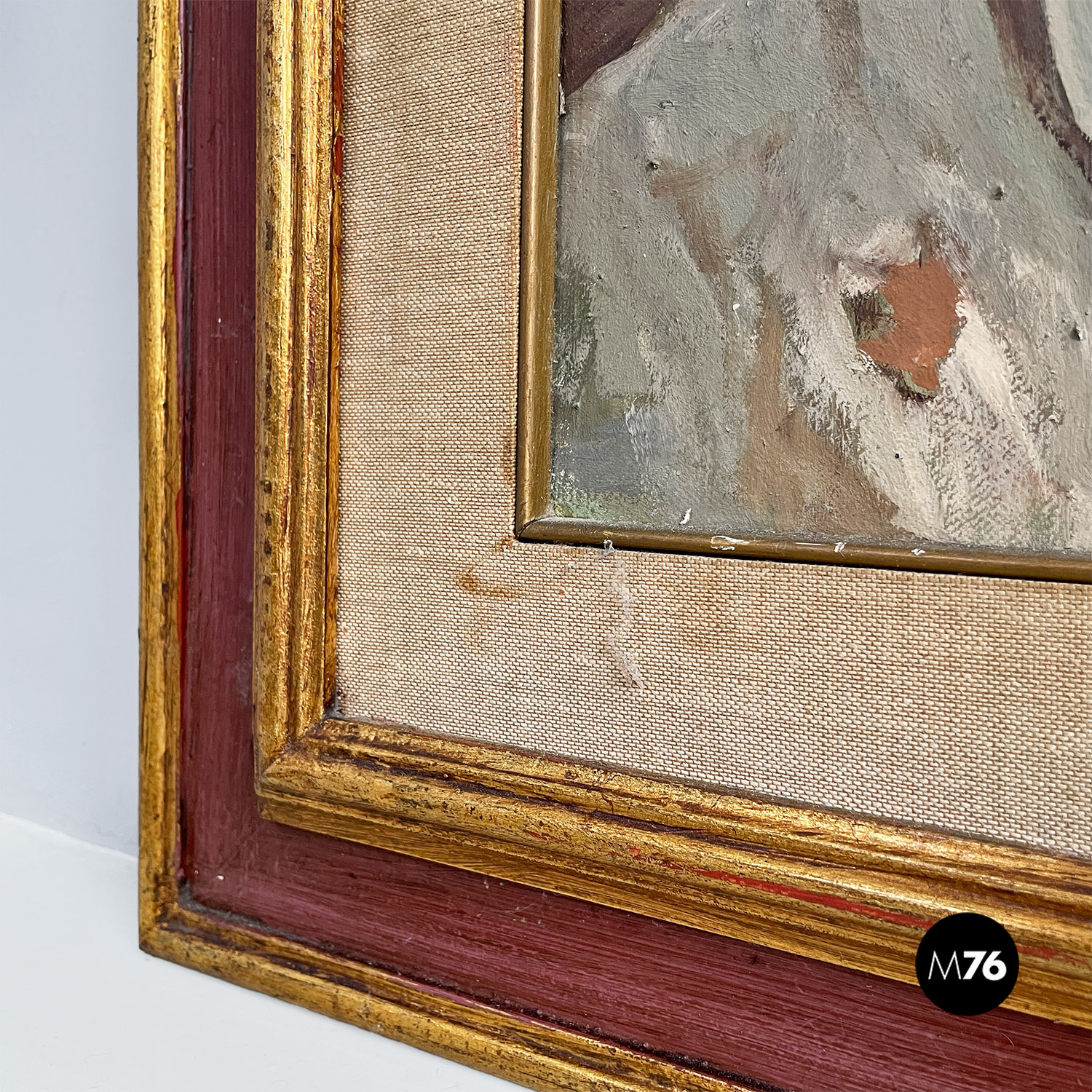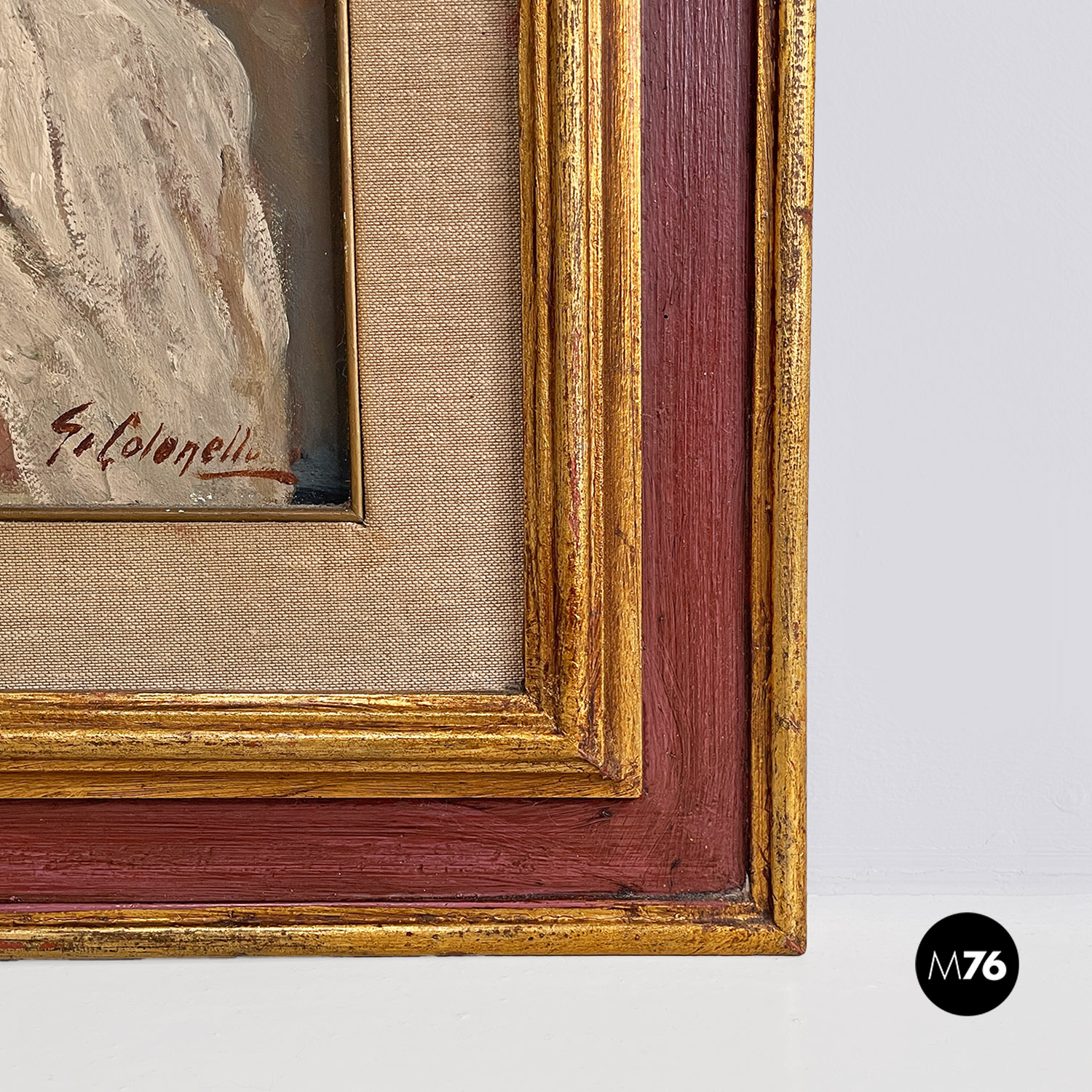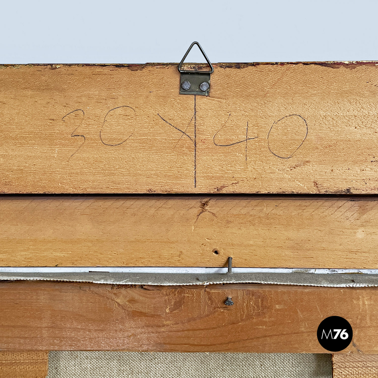 Dipinto realizzato con colori a tempera, rappresentante un bambino dai capelli scuri e mossi e un volto tondeggiante. I colori sono caldi e la cornice è realizzata in legno, dipinto oro o in tinta marrone e tessuto beige.