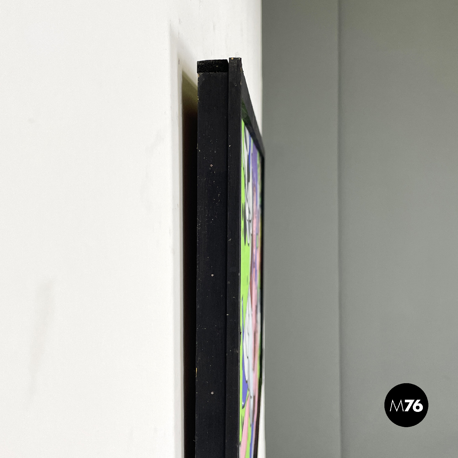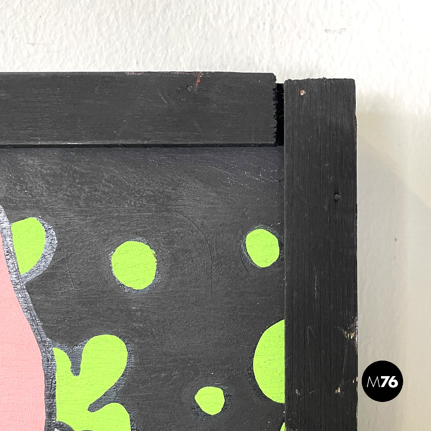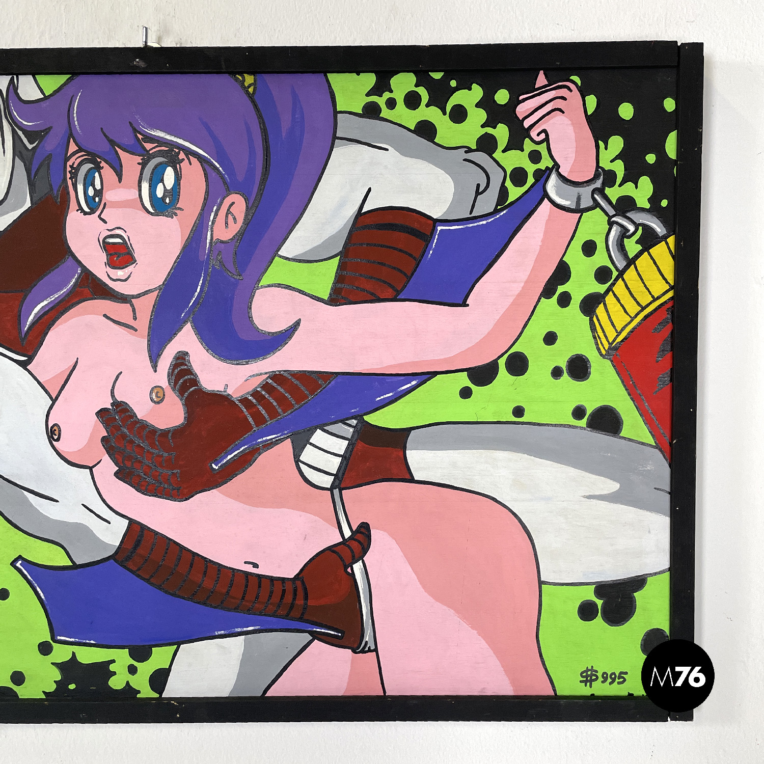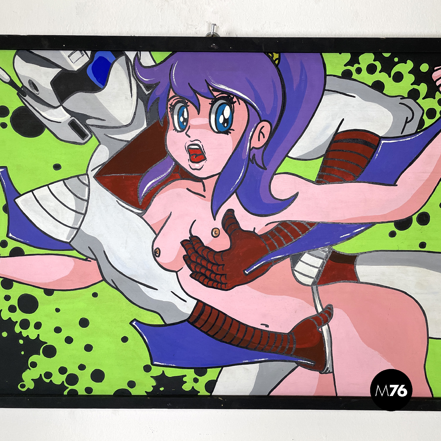 Quadro ad acrilico su tavola a tema erotico, rappresentante personaggi iconici della cultura pop manga giapponese. La composizione presenta colori accesi e sgargianti: verde, viola, nero e rosso. Presenta una cornice nera in legno liscio a sezione quadrata.