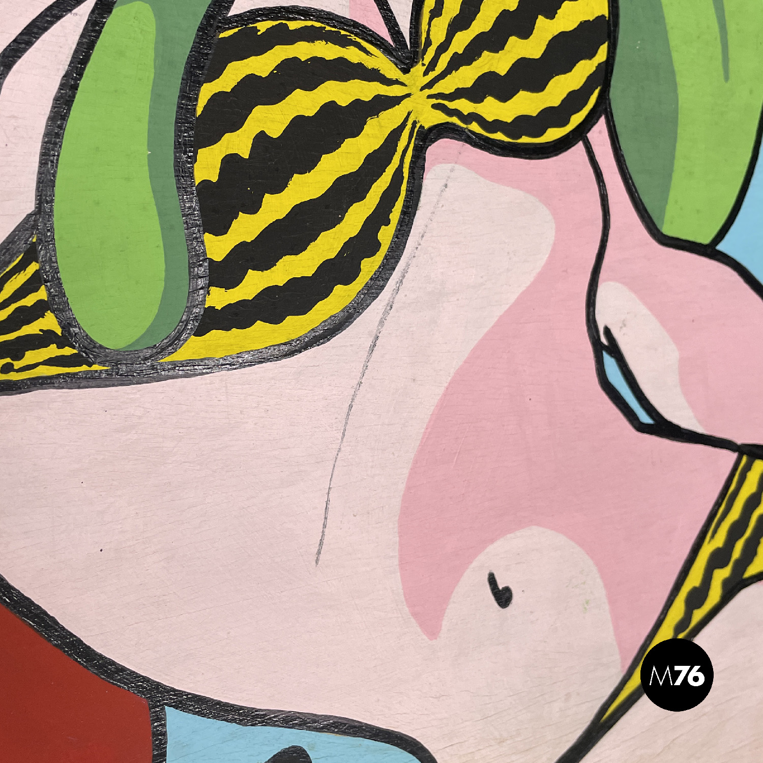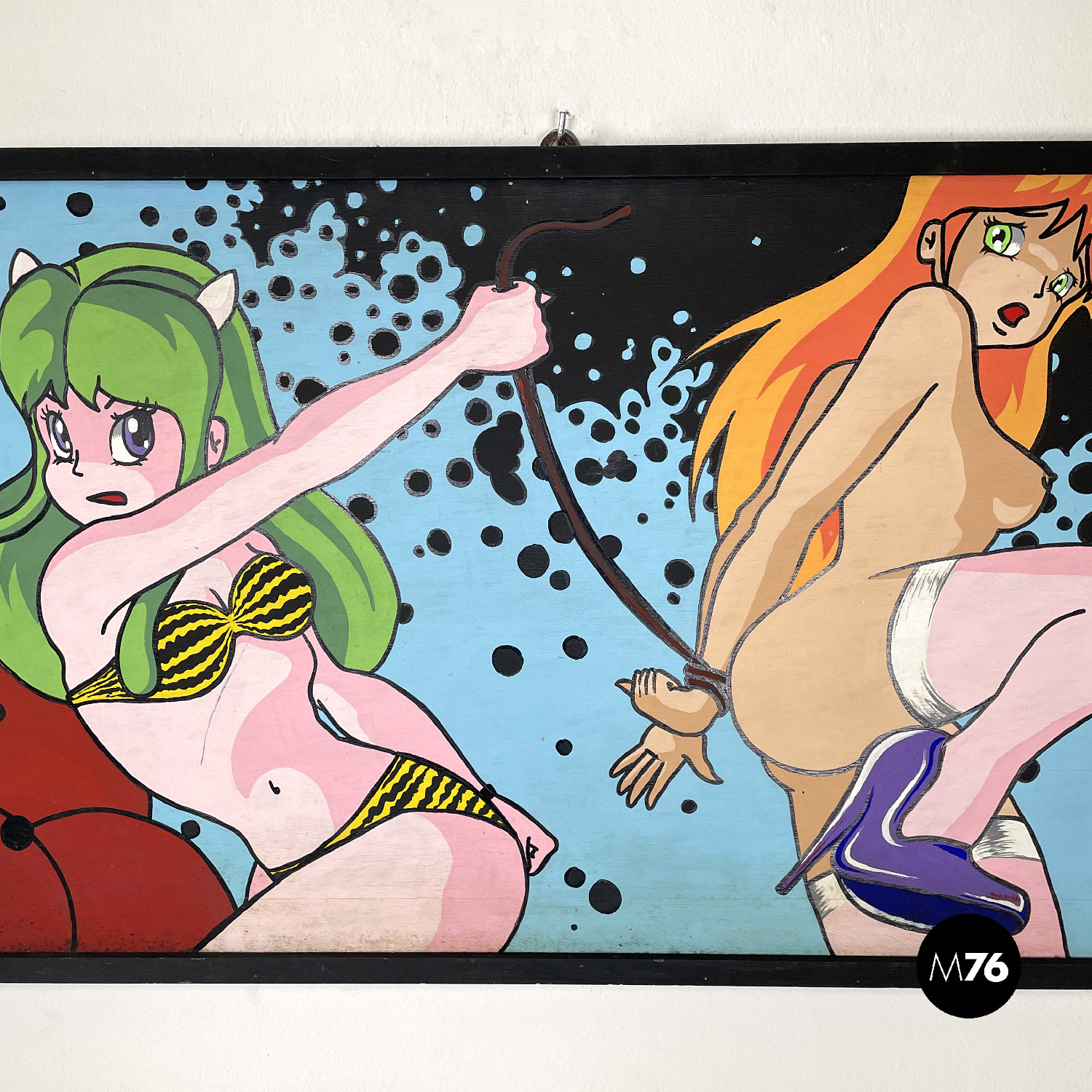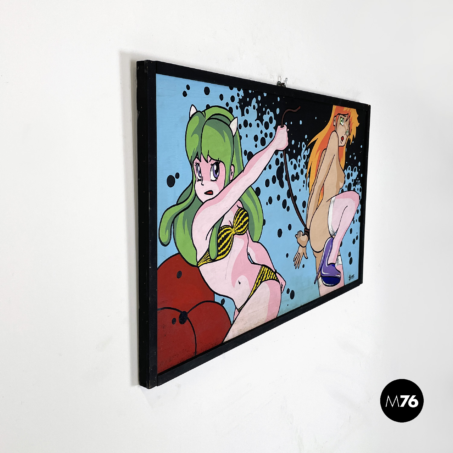 Quadro ad acrilico su tavola a tema erotico, rappresentante personaggi iconici della cultura pop manga giapponese. La composizione presenta colori accesi e sgargianti: rosso, blu, verde, giallo, rosa, arancione e nero. Presenta una cornice nera in legno liscio a sezione quadrata.