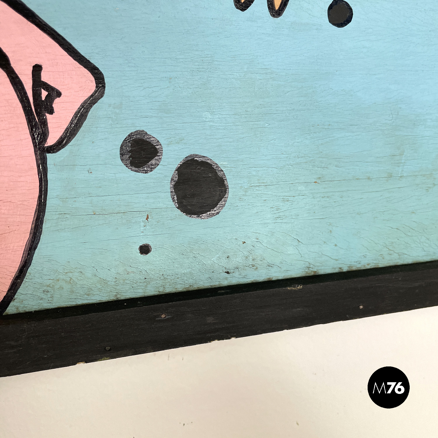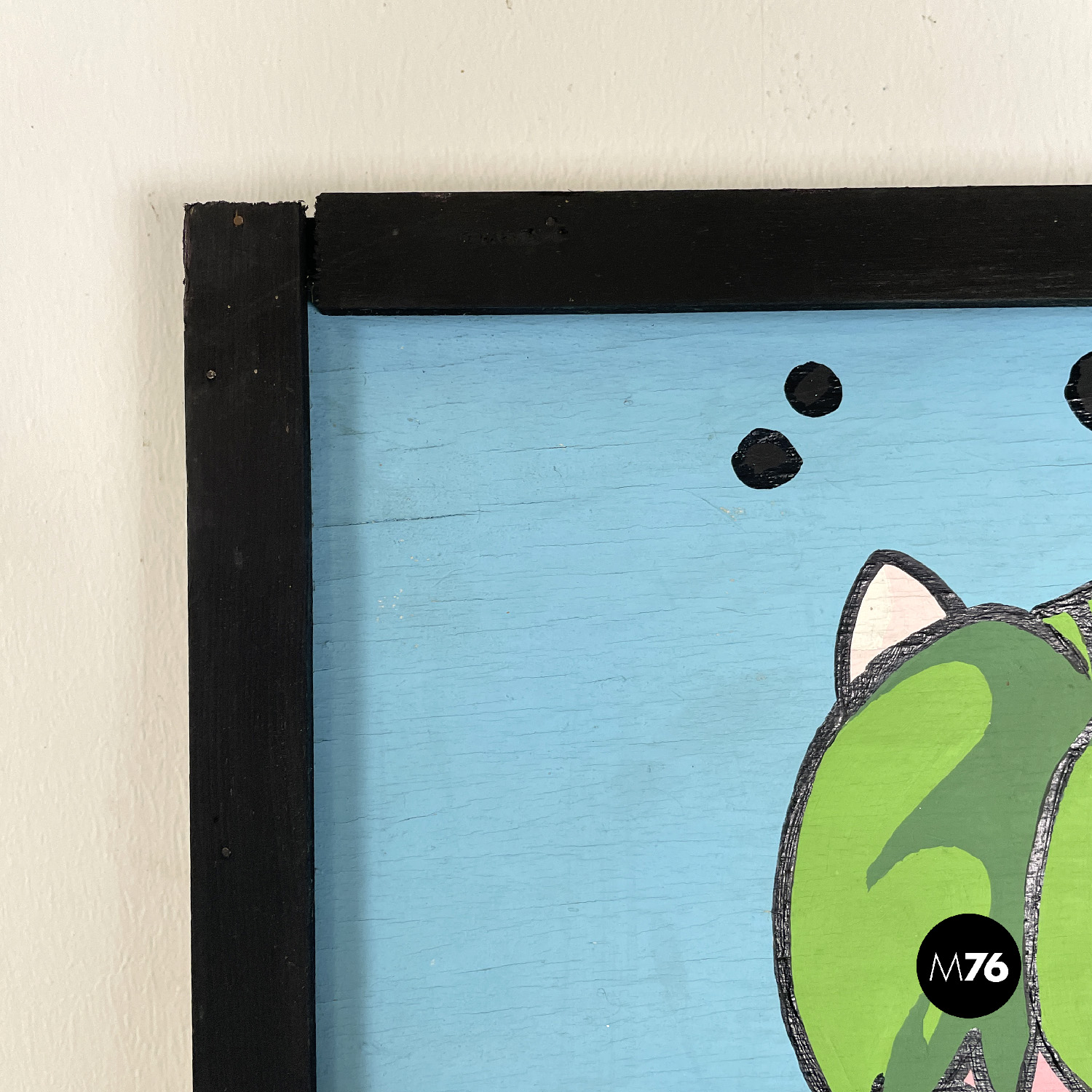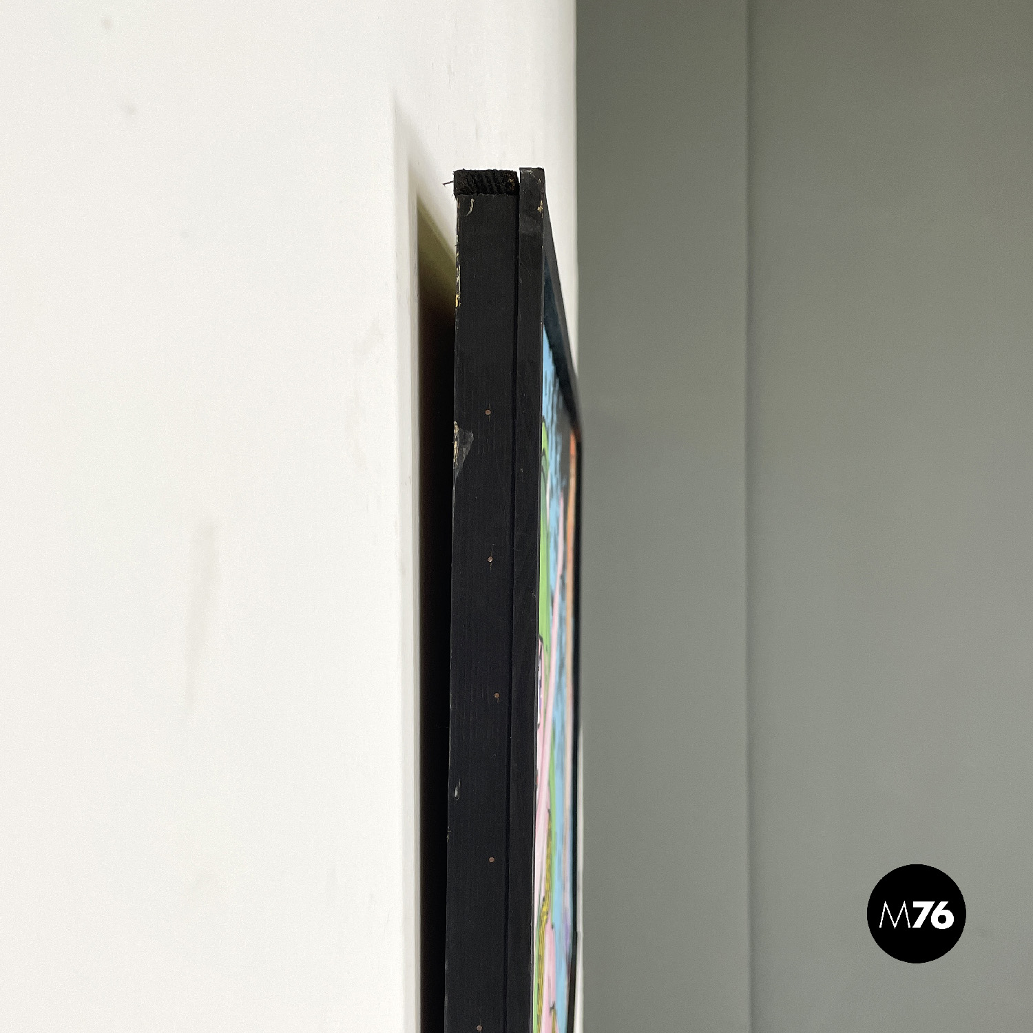 Quadro ad acrilico su tavola a tema erotico, rappresentante personaggi iconici della cultura pop manga giapponese. La composizione presenta colori accesi e sgargianti: rosso, blu, verde, giallo, rosa, arancione e nero. Presenta una cornice nera in legno liscio a sezione quadrata.
