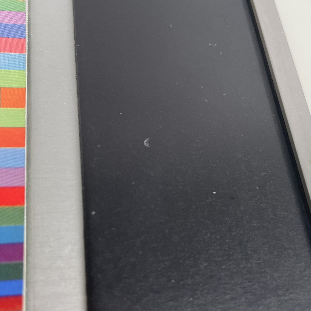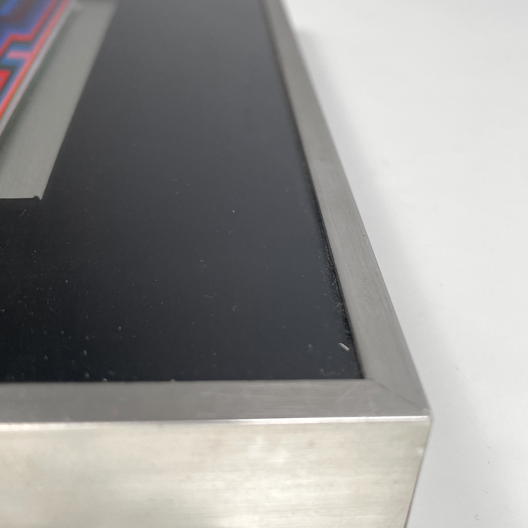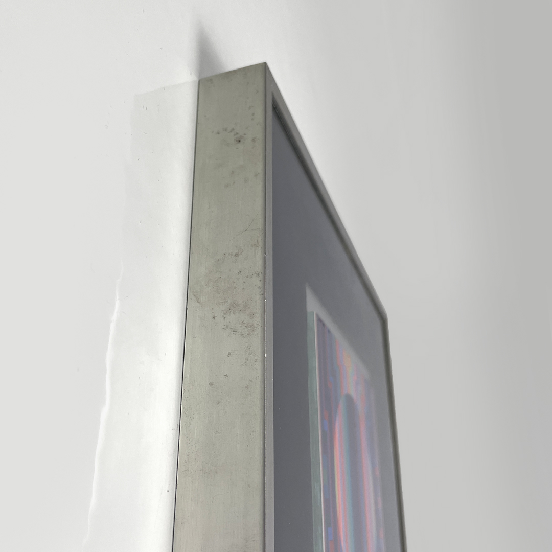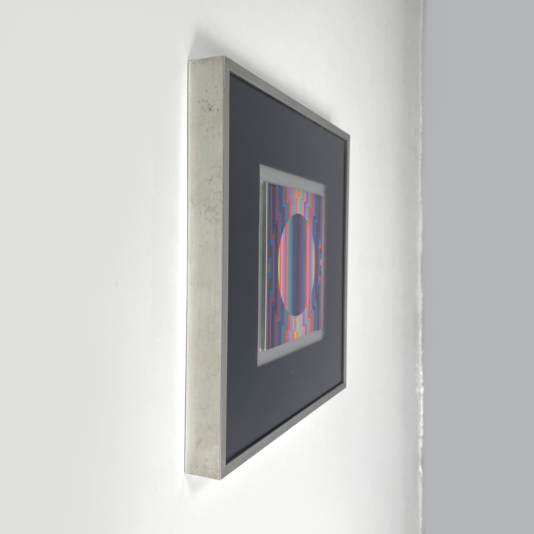 Quadro con cornice i metallo. Il quadro rappresenta una composizione geometrica colorata in pieno stile Optical Art, due toni del rosso, blu, rosa, verde e arancione.