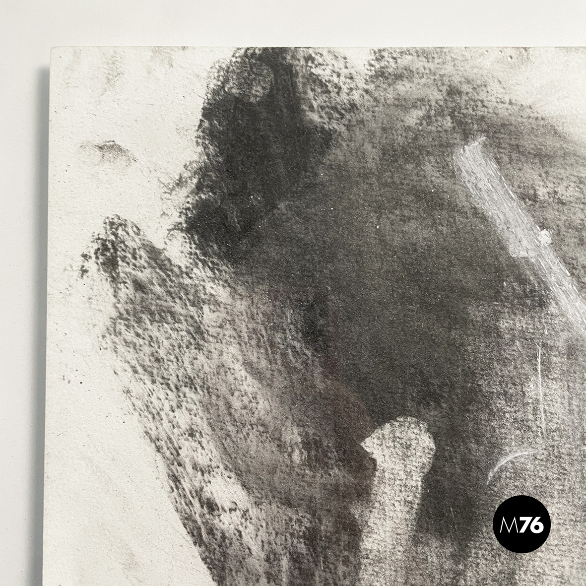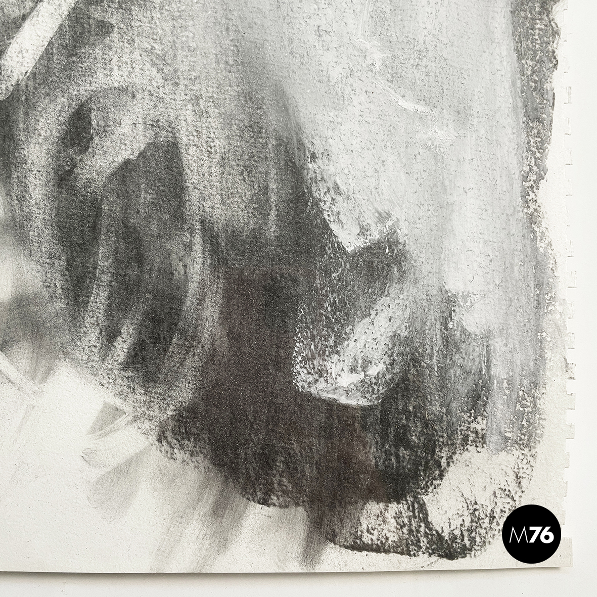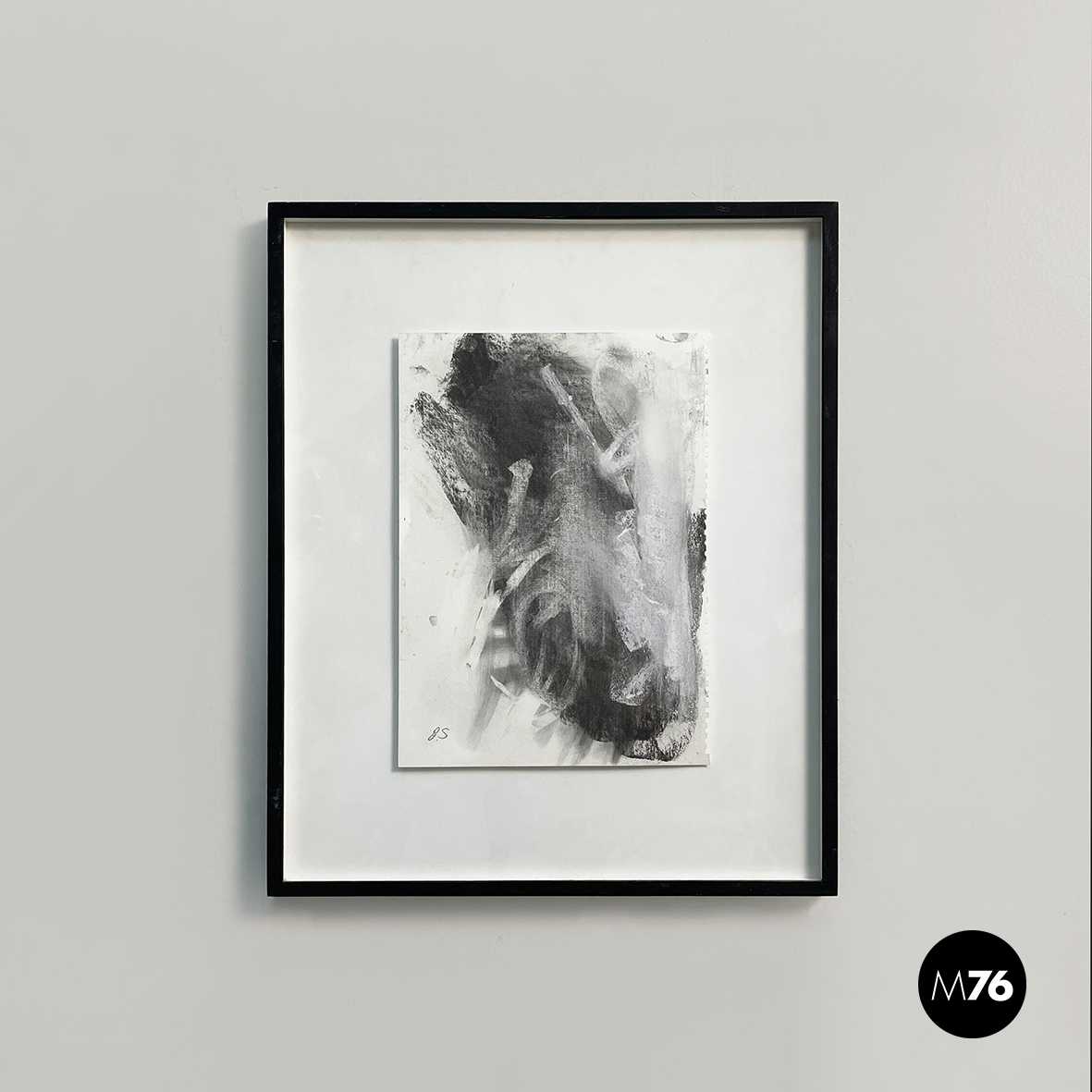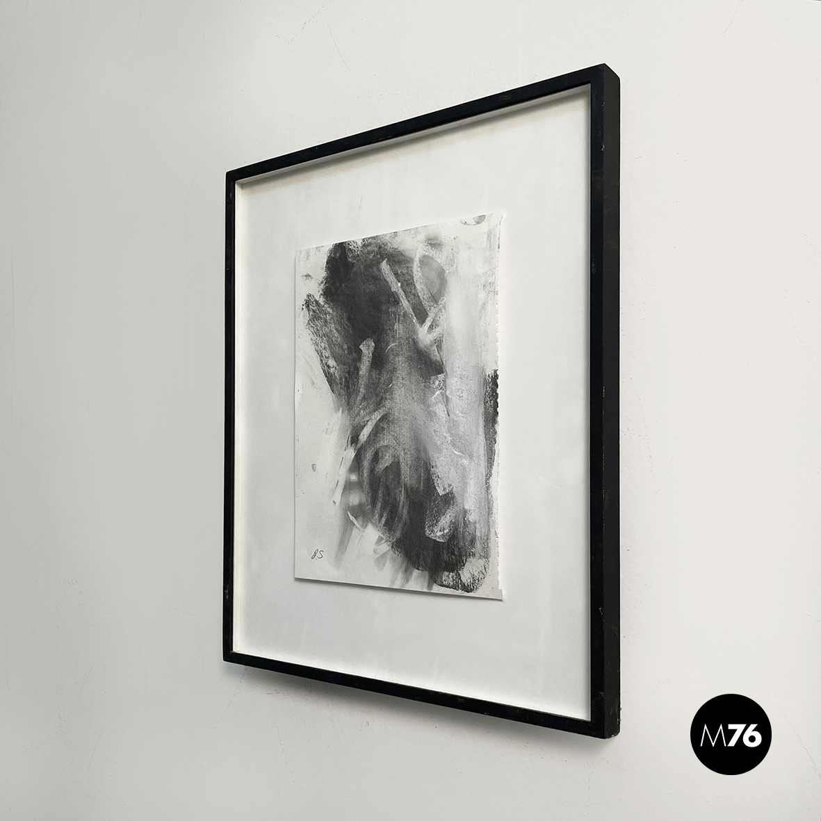 Disegno su carta con carboncino nero e pastello ad olio bianco. Il soggetto del quadro è astratto. Il foglio è fissato su un fondo bianco e in cornice di legno verniciato nero.