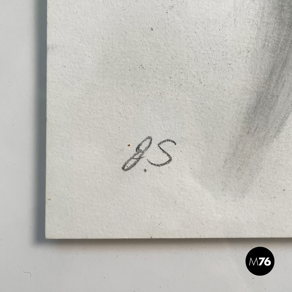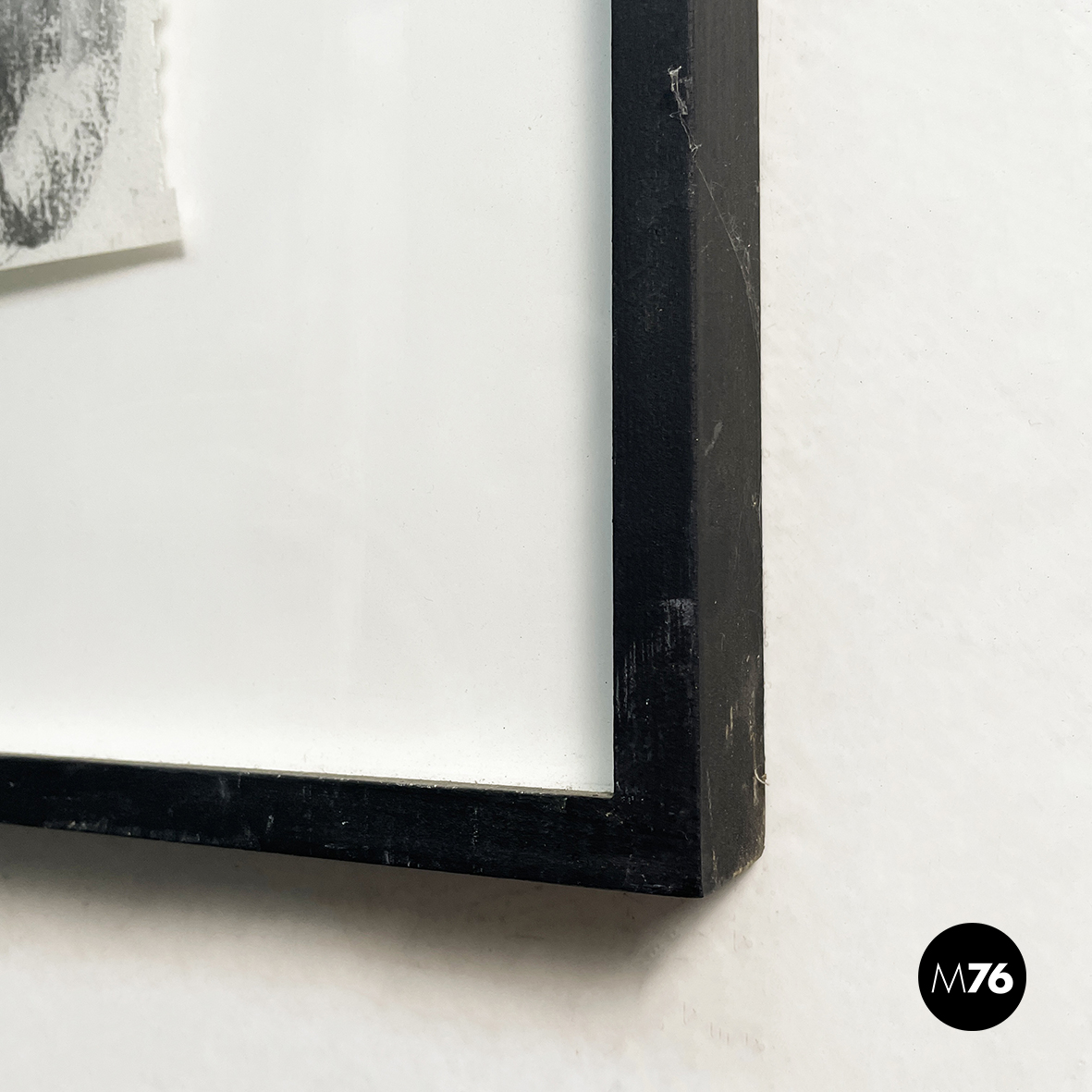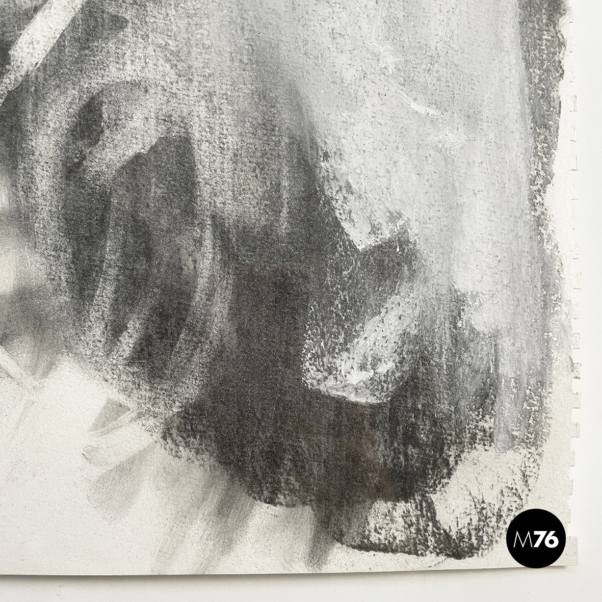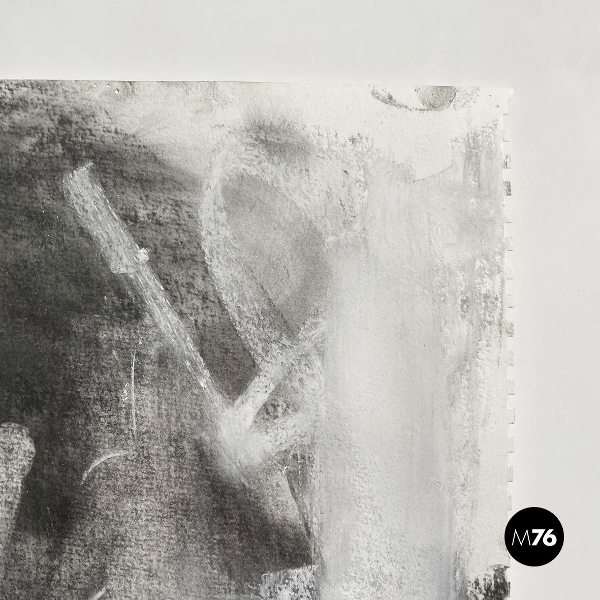 Disegno su carta con carboncino nero e pastello ad olio bianco. Il soggetto del quadro è astratto. Il foglio è fissato su un fondo bianco e in cornice di legno verniciato nero.