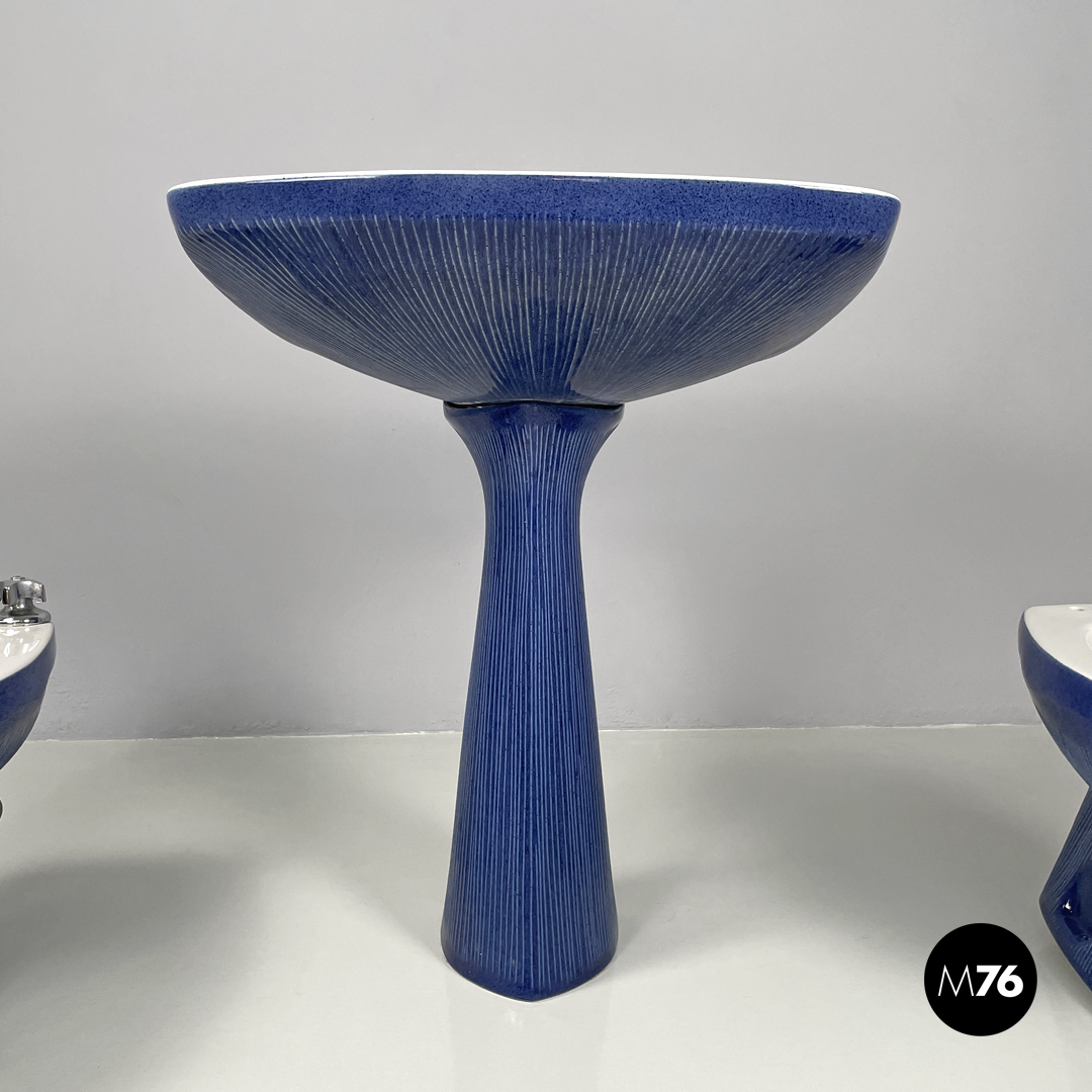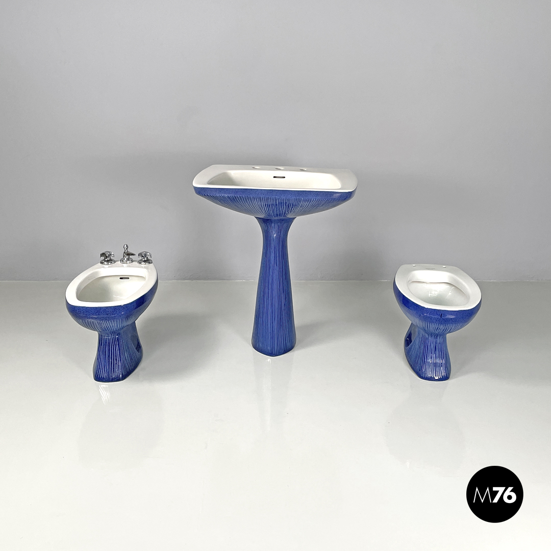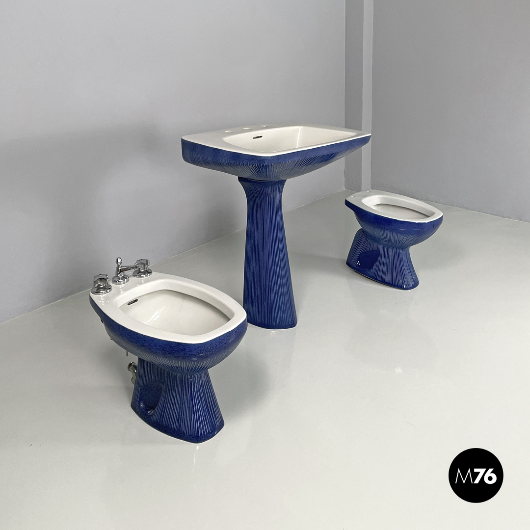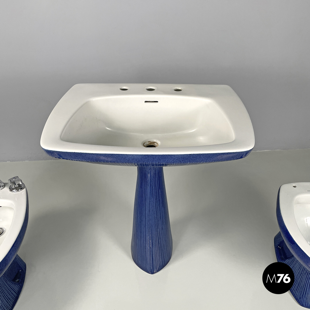Set di tre sanitari da bagno modello Gardena composto da wc, bidet e lavandino. I sanitari in ceramica bianca nella parte in alto, mentre l’esterno della struttura è smaltata sui toni del blu con striature rialzate più chiare. Il bidet presenta il rubinetto e le manopole in acciaio cromato.