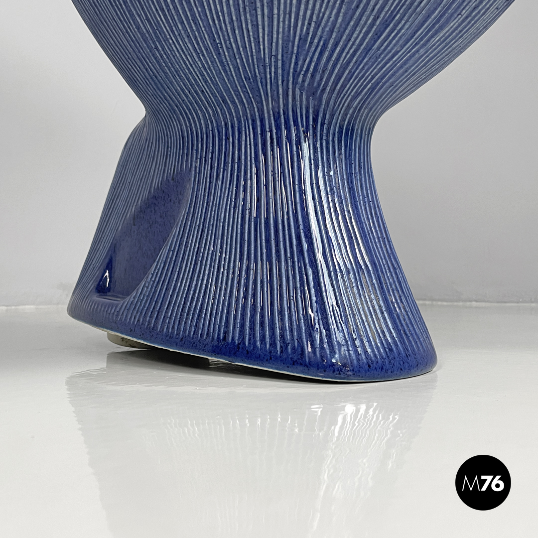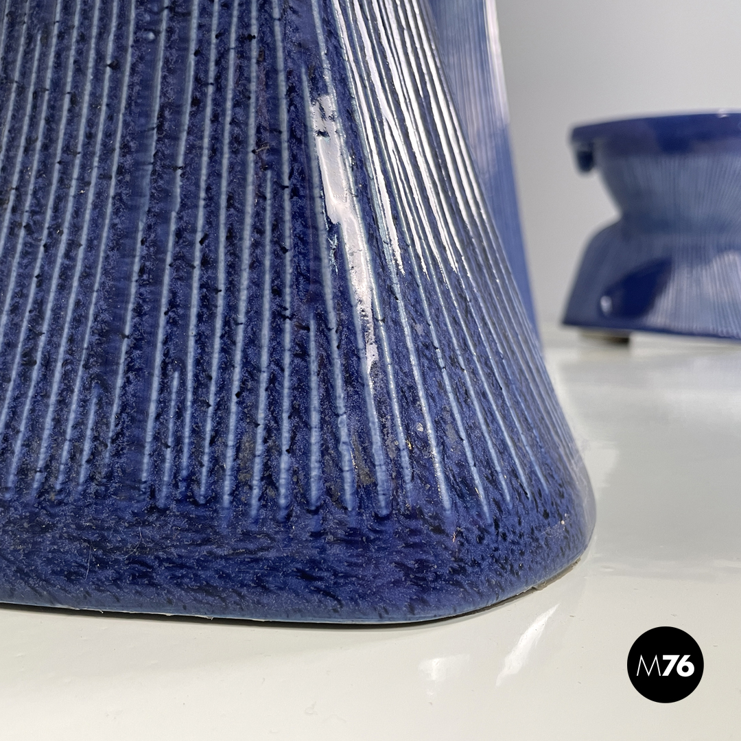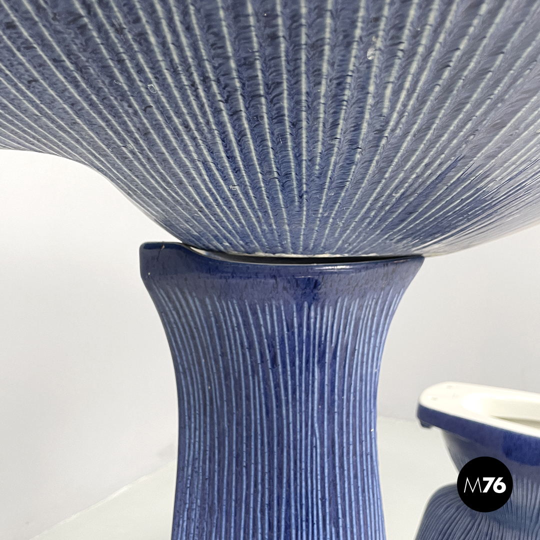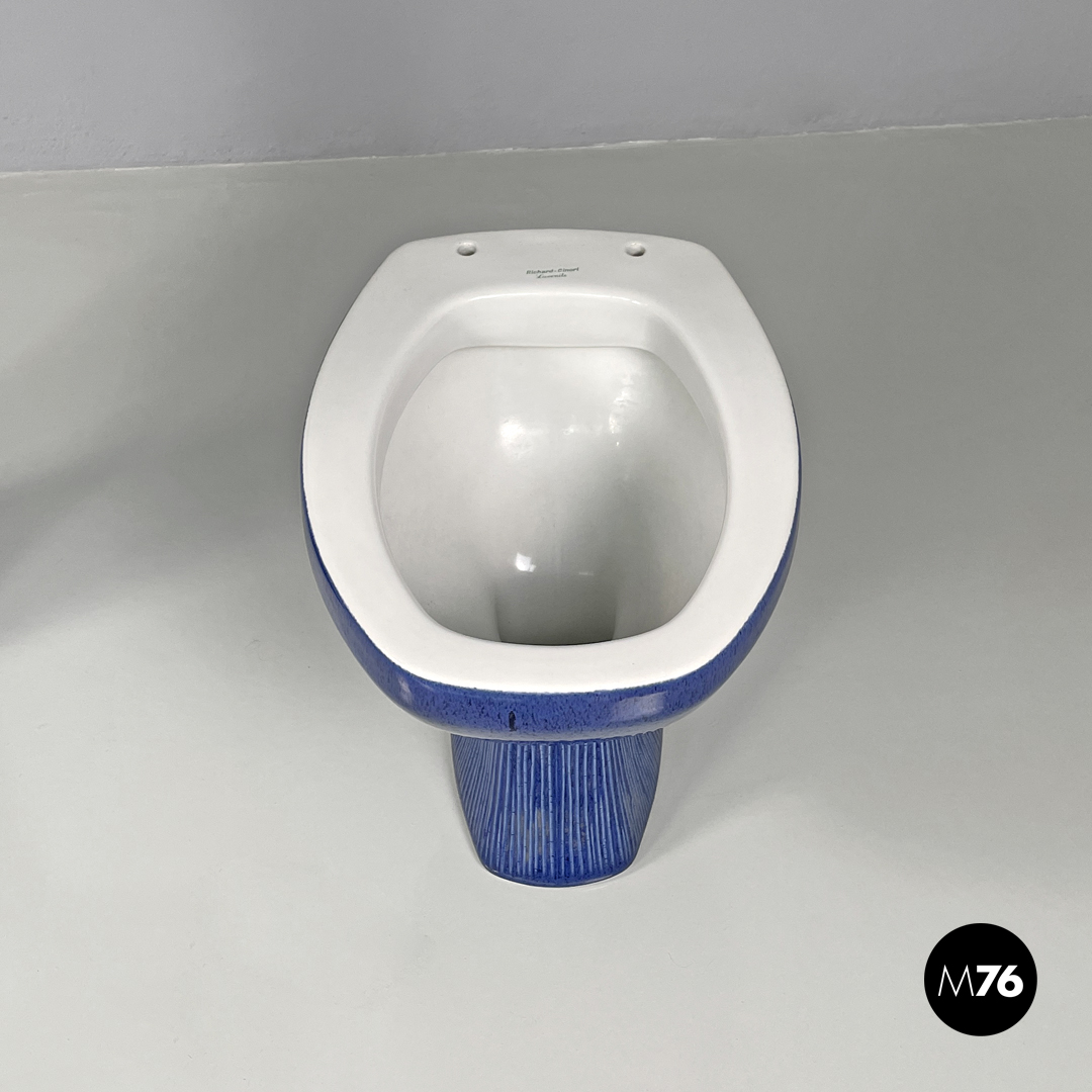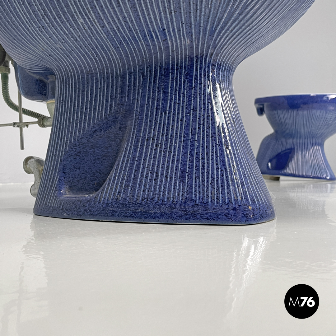 Set di tre sanitari da bagno modello Gardena composto da wc, bidet e lavandino. I sanitari in ceramica bianca nella parte in alto, mentre l’esterno della struttura è smaltata sui toni del blu con striature rialzate più chiare. Il bidet presenta il rubinetto e le manopole in acciaio cromato.
