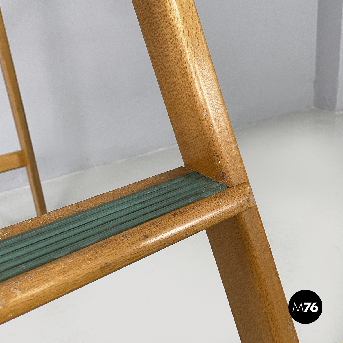 Scala apribile interamente in legno di faggio. Gli scalini presentano i borsi arrotondati e gli interni in legno verniciato verde. La struttura è a listelli.
