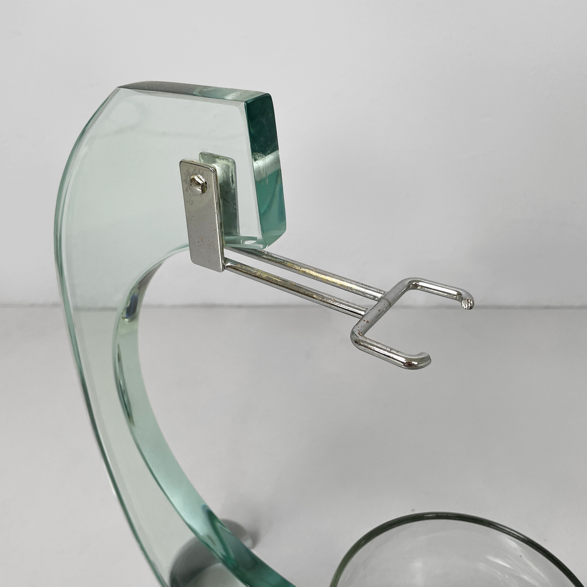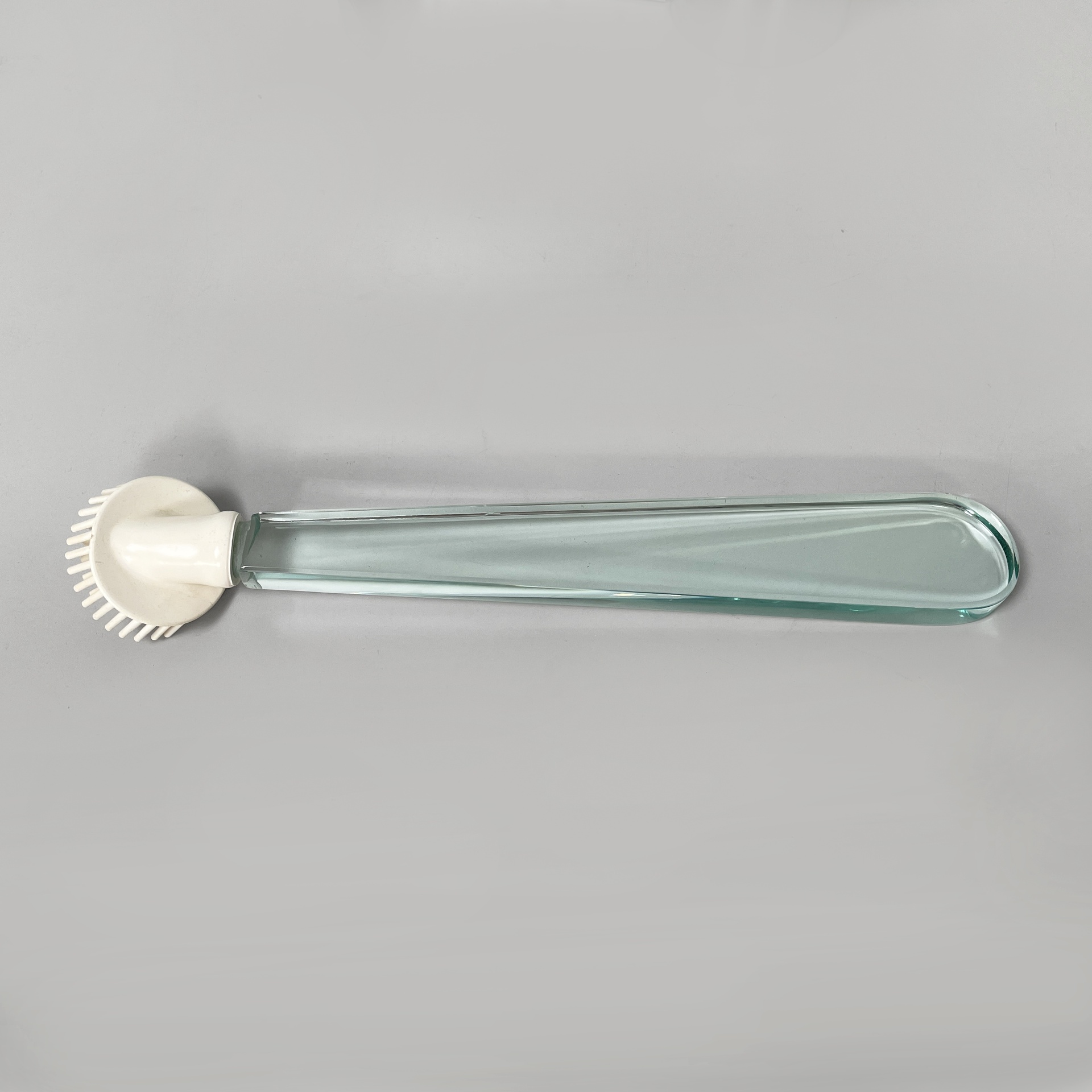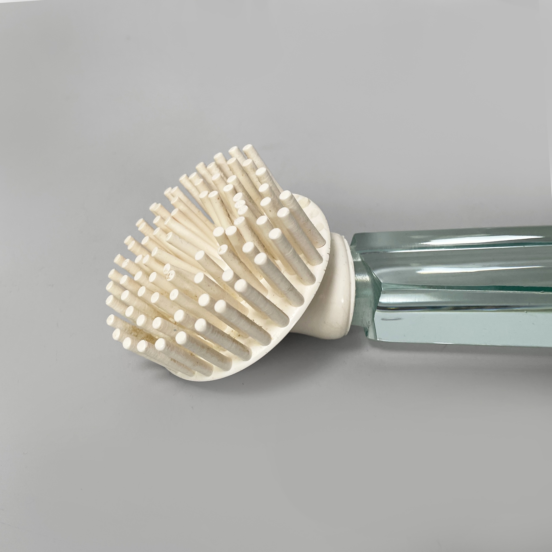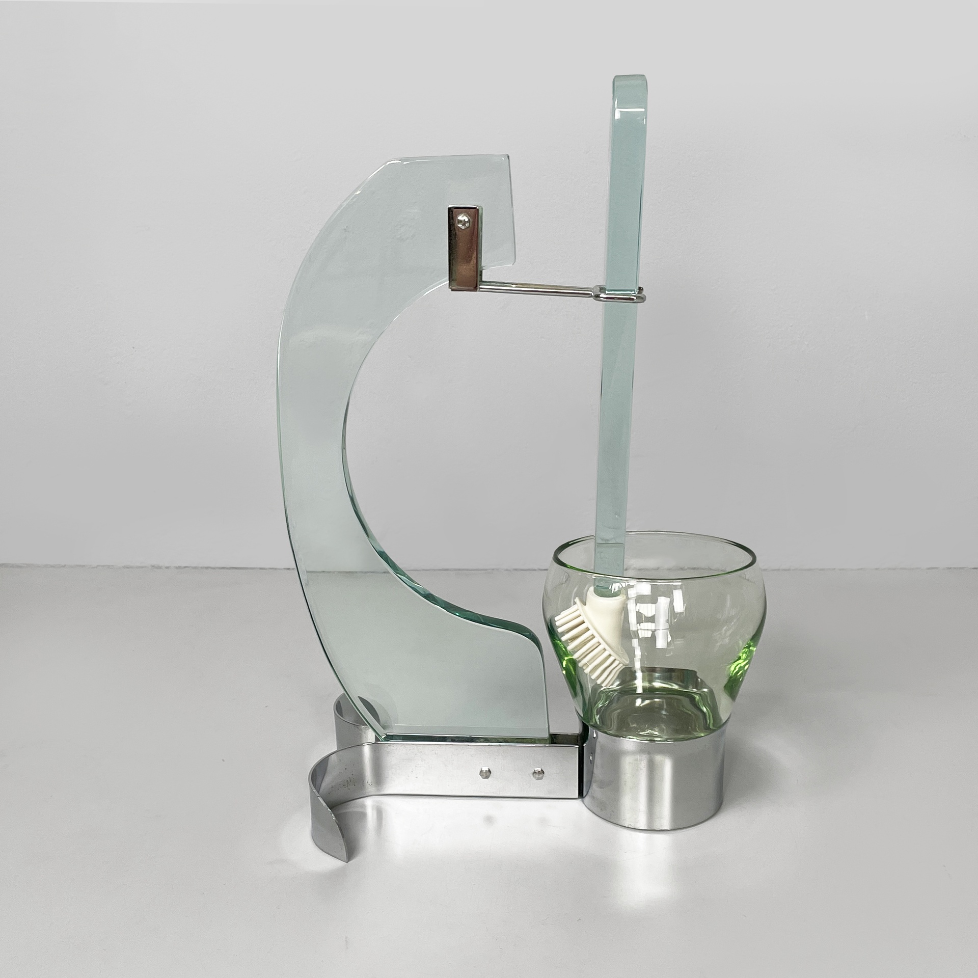 Scopino con portascopino da bagno in vetro e metallo. Lo scopino presenta delle setole bianche con struttura in vetro di grosso spessore. Il portascopino presenta un gancio in tondino di metallo, una struttura in vetro curvata e una base metallica con due riccioli. Alla base è presente una ciotola in vetro, dove poggiano le setole dello scopino.