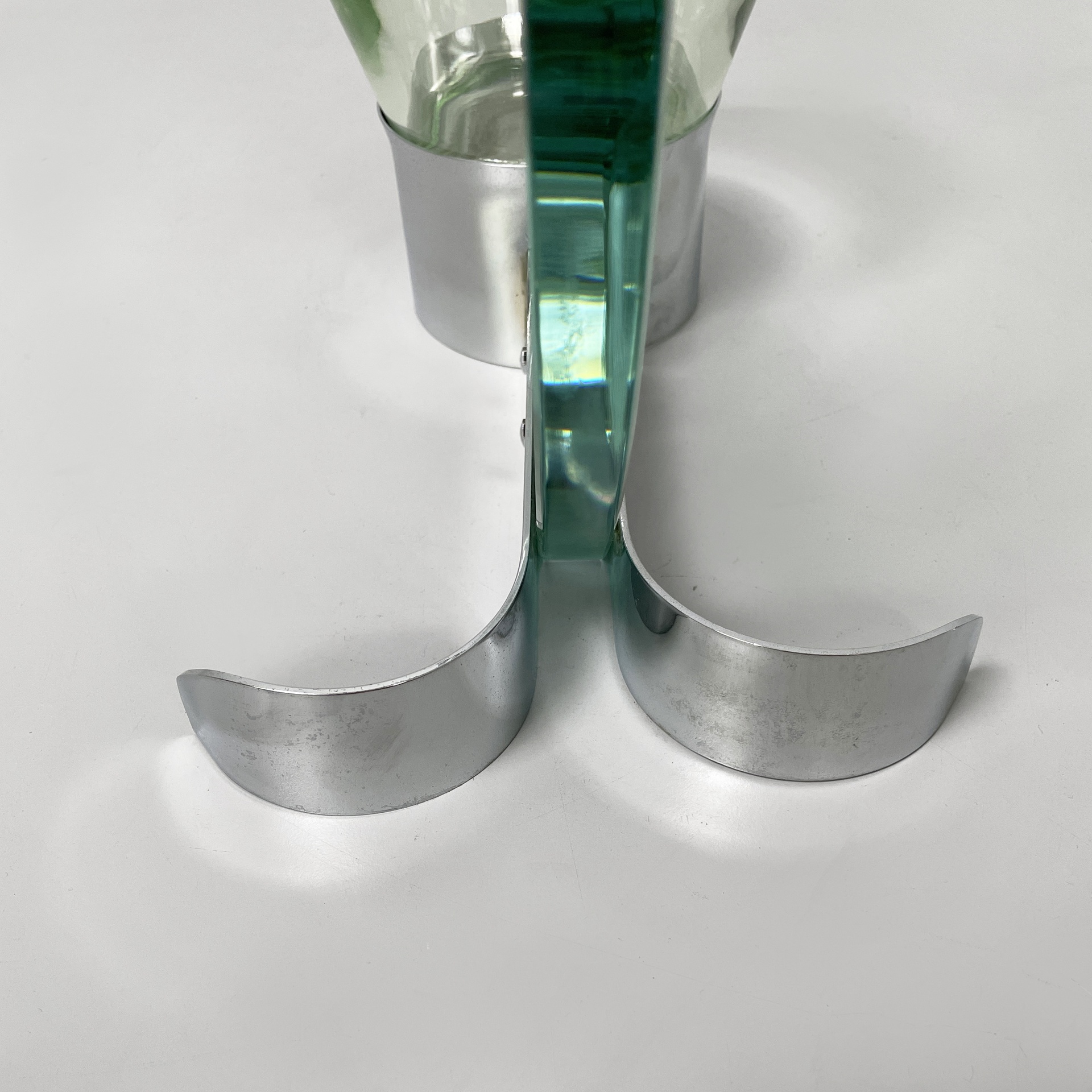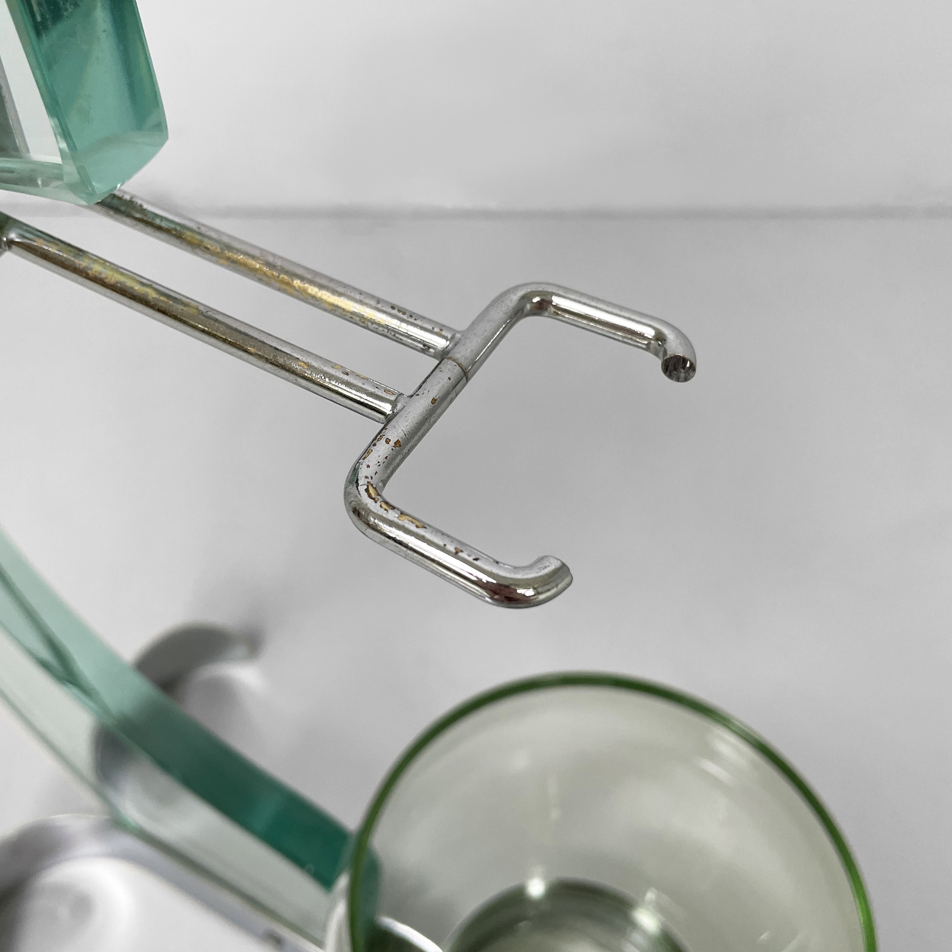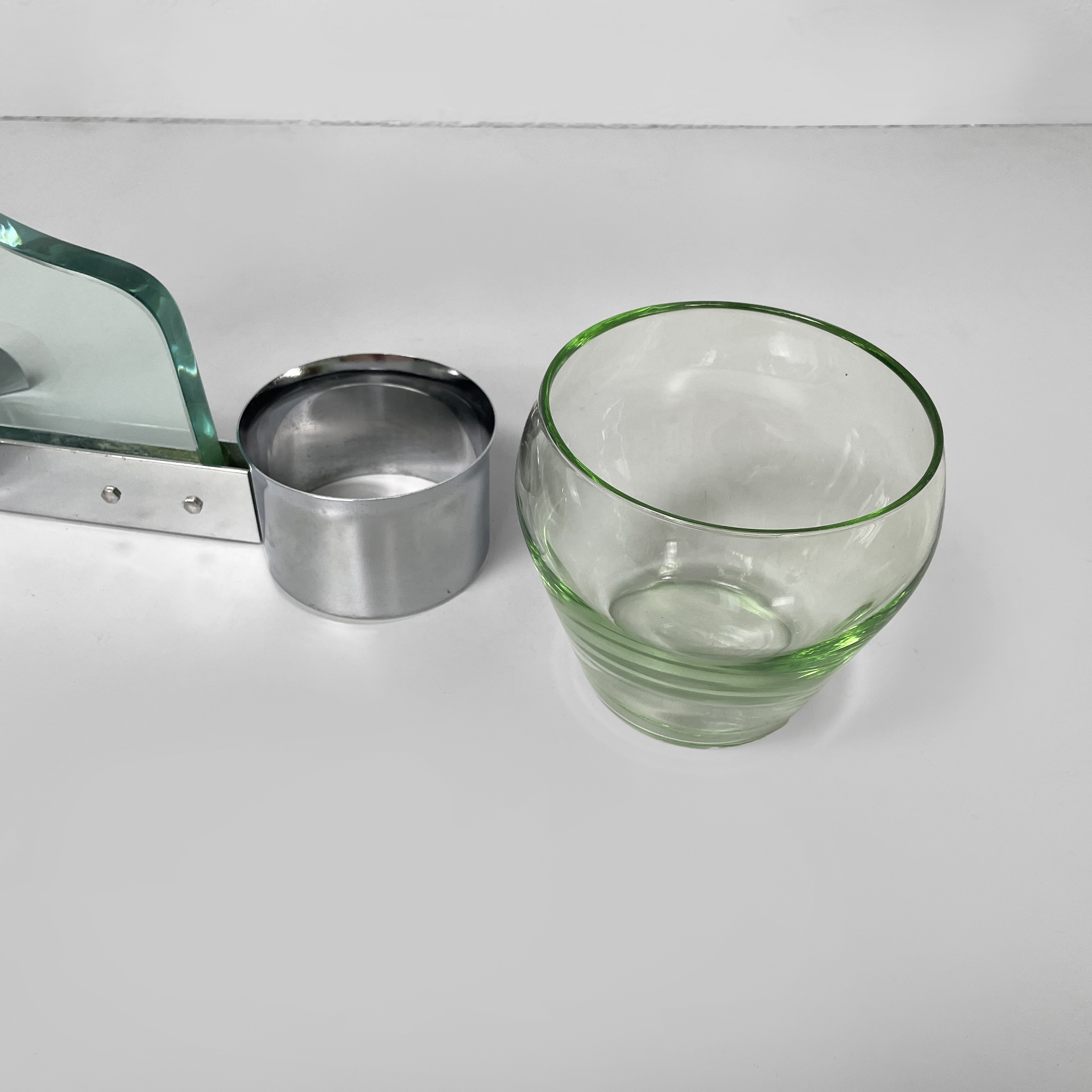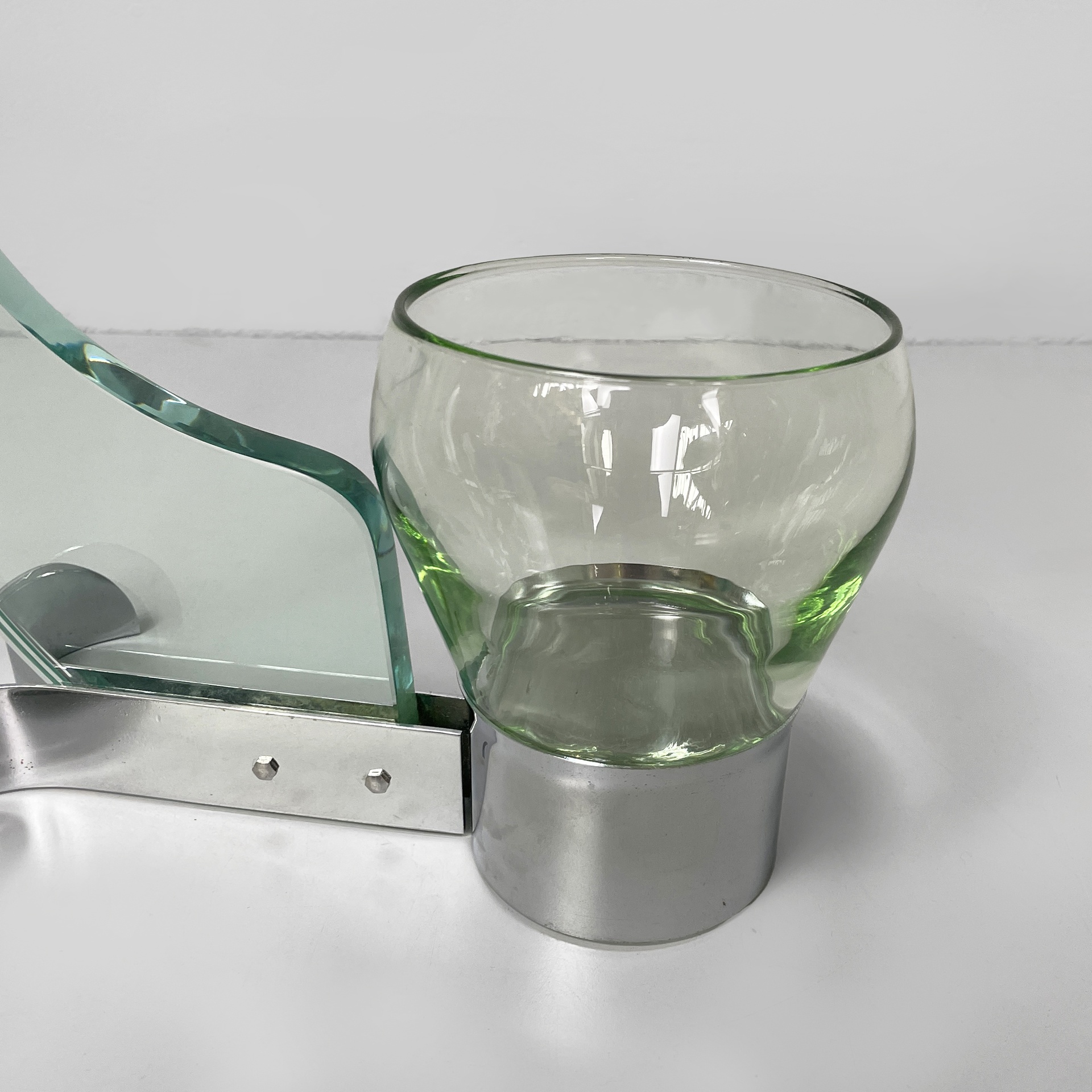 Scopino con portascopino da bagno in vetro e metallo. Lo scopino presenta delle setole bianche con struttura in vetro di grosso spessore. Il portascopino presenta un gancio in tondino di metallo, una struttura in vetro curvata e una base metallica con due riccioli. Alla base è presente una ciotola in vetro, dove poggiano le setole dello scopino.