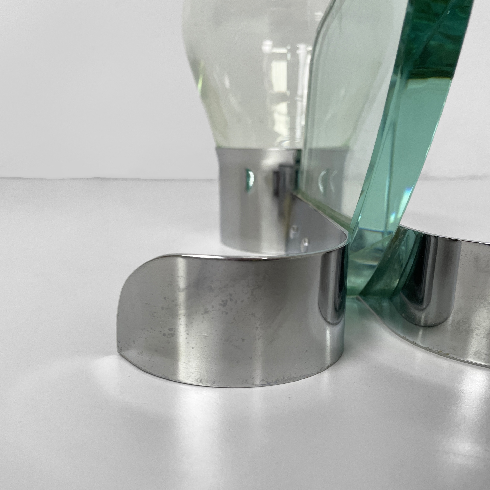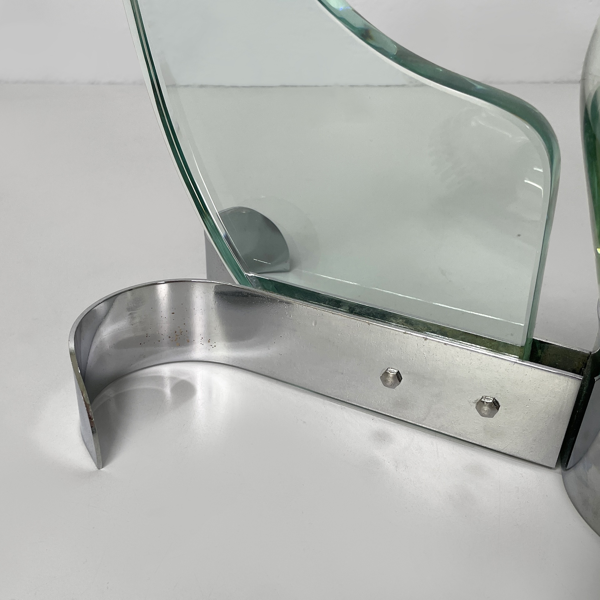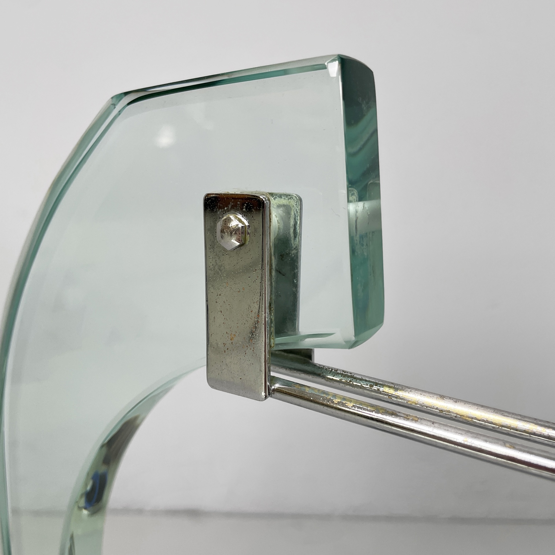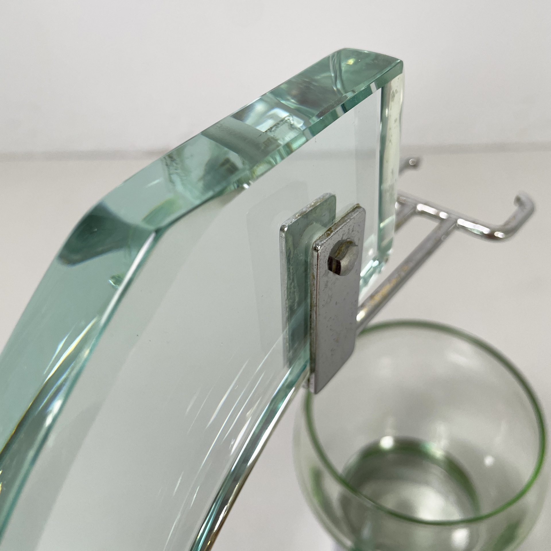 Scopino con portascopino da bagno in vetro e metallo. Lo scopino presenta delle setole bianche con struttura in vetro di grosso spessore. Il portascopino presenta un gancio in tondino di metallo, una struttura in vetro curvata e una base metallica con due riccioli. Alla base è presente una ciotola in vetro, dove poggiano le setole dello scopino.