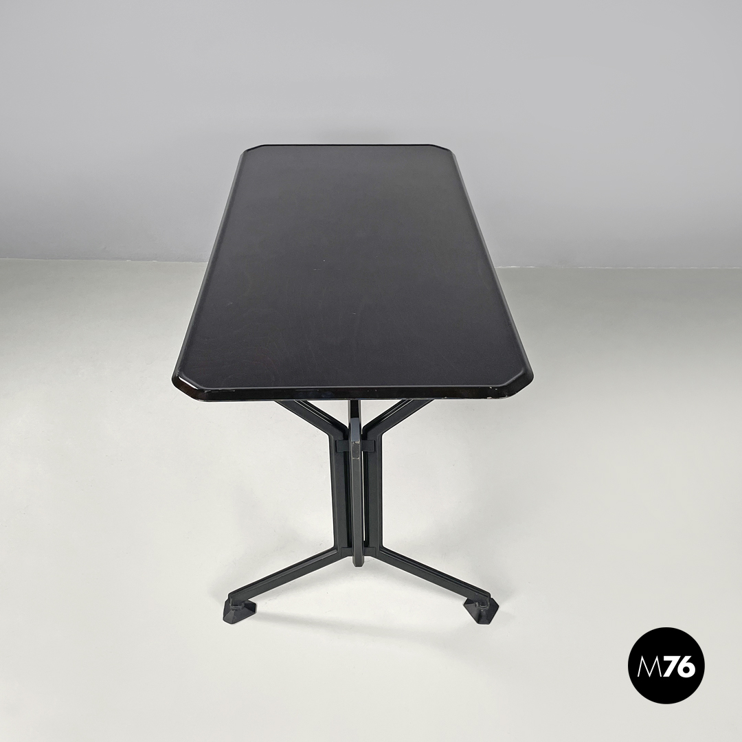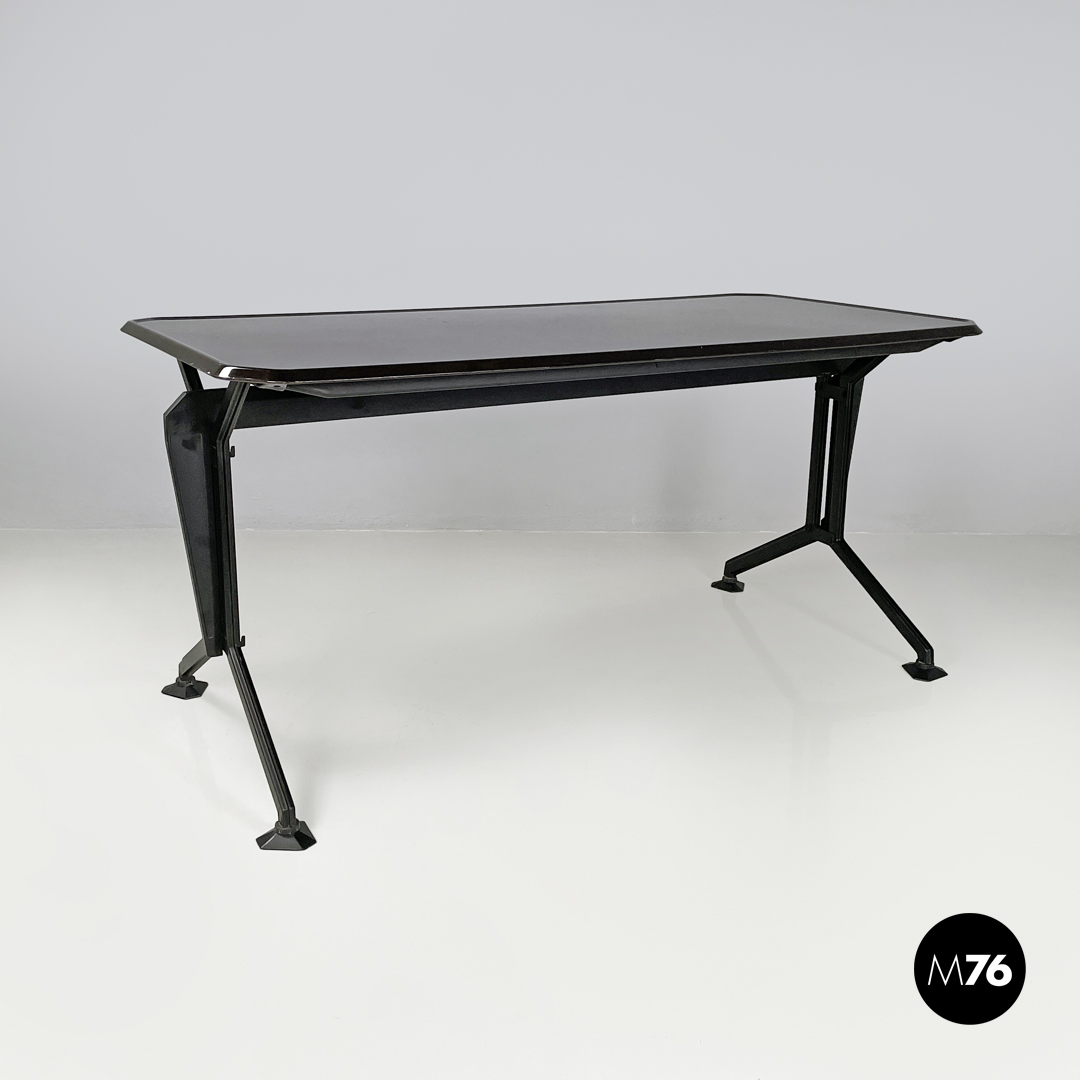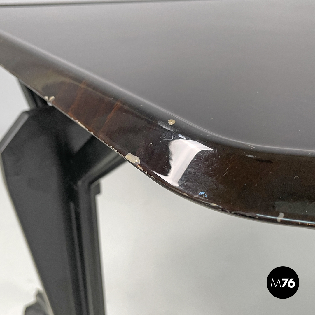 Scrivania o tavolo da pranzo modello Arco rettangolare. Il piano è in laminato effetto legno scuro con profili sagomati ed angoli tagliati. La struttura è in metallo verniciato nero opaco, le due gambe laterali unite da una trave centrale si diramano in due razze ciascuna terminando con piedini in metallo nero dalla forma piramidale.