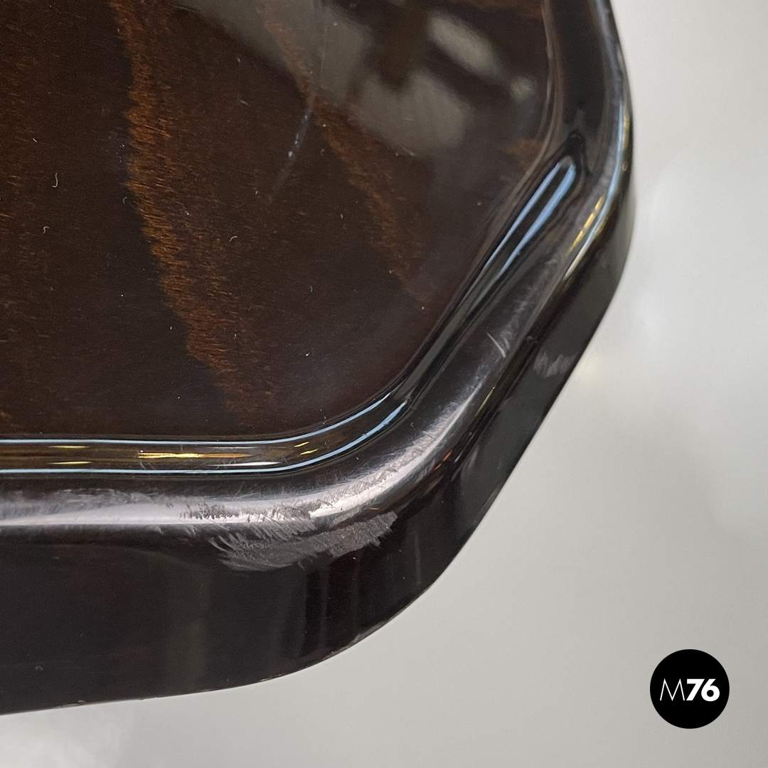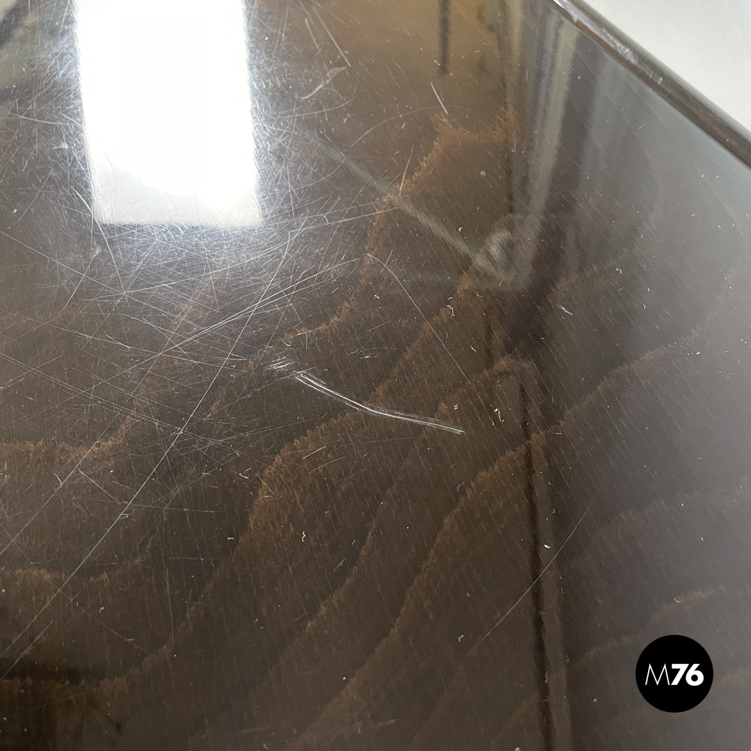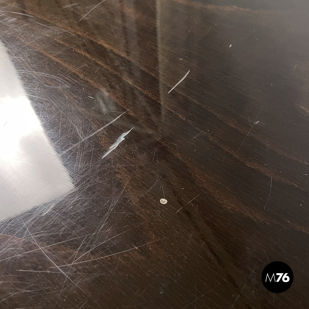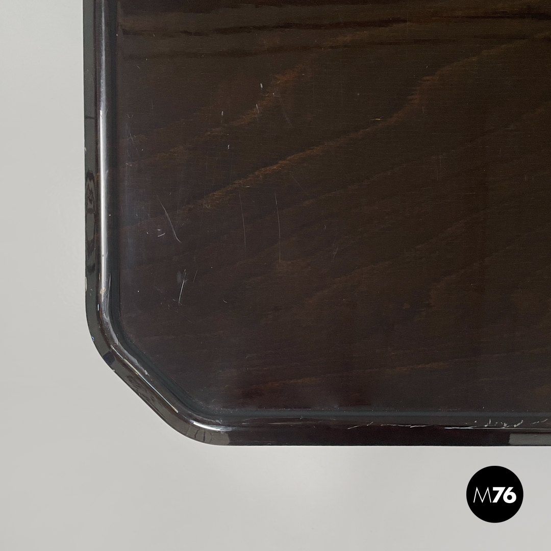 Scrivania o tavolo da pranzo modello Arco rettangolare. Il piano è in laminato effetto legno scuro con profili sagomati ed angoli tagliati. La struttura è in metallo verniciato nero opaco, le due gambe laterali unite da una trave centrale si diramano in due razze ciascuna terminando con piedini in metallo nero dalla forma piramidale.