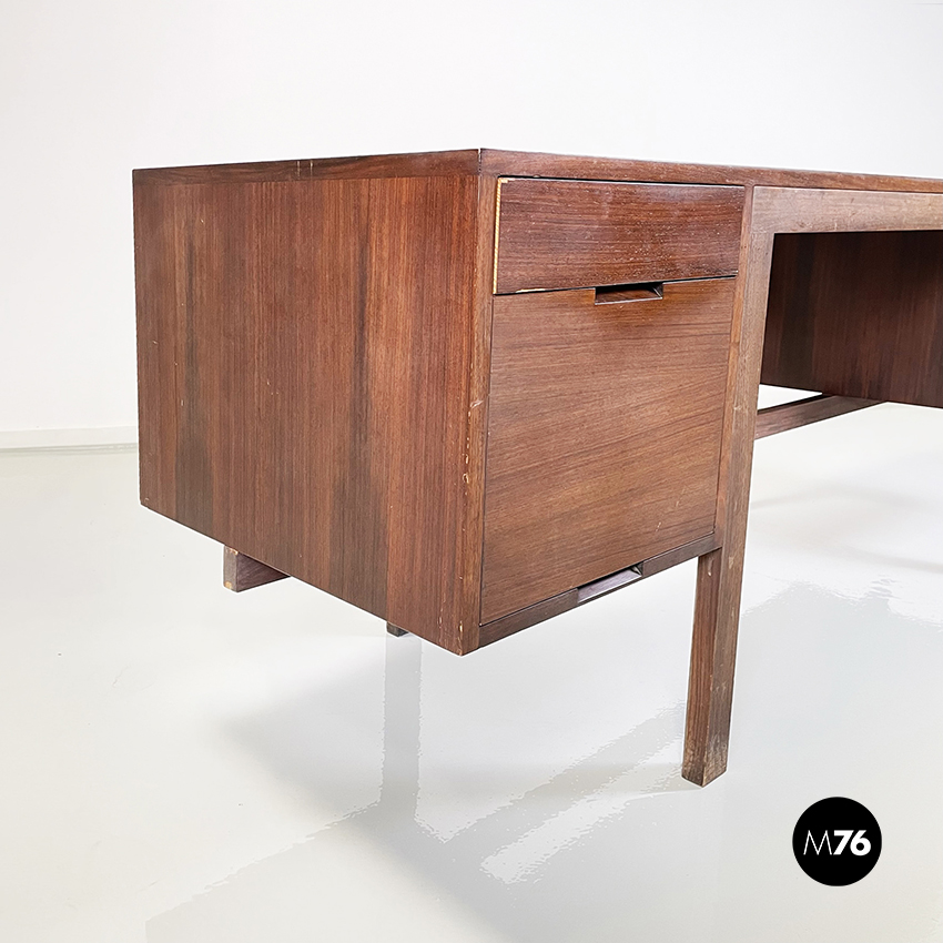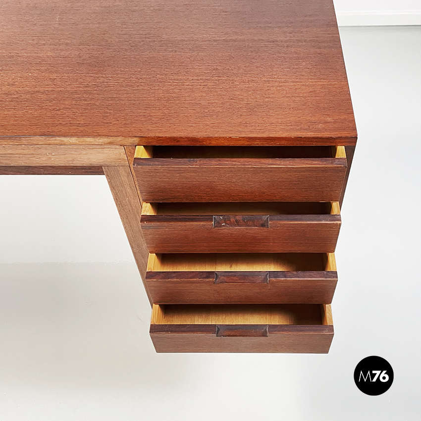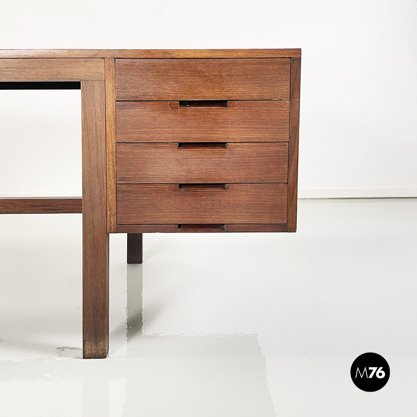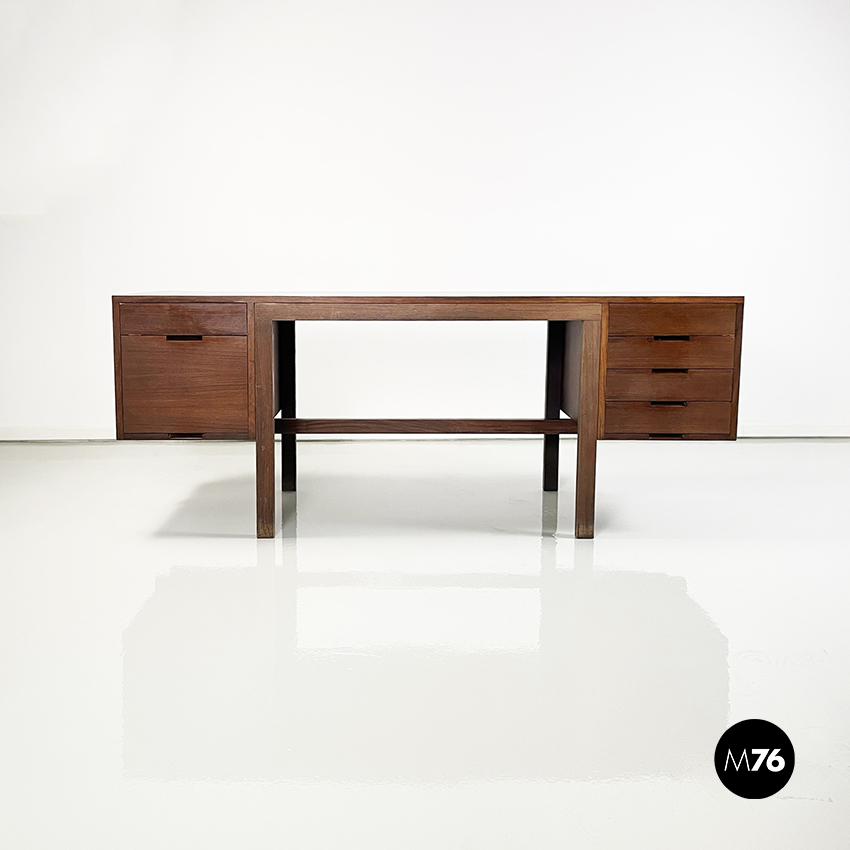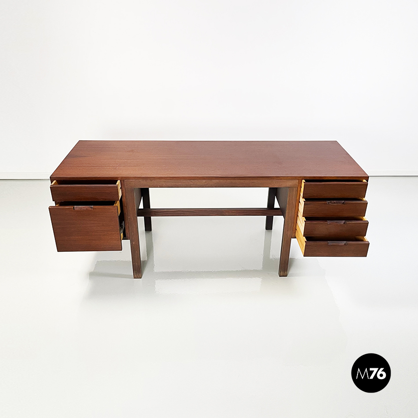 Scrivania modello Canaan con piano rettangolare in legno. Su un lato sono presenti due cassetti e sull’altro quattro. Presenta nella parte bassa una traversa in legno, utilizzabile per poggiare i piedi. Gambe a sezione rettangolare.