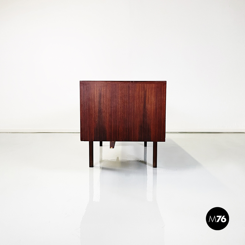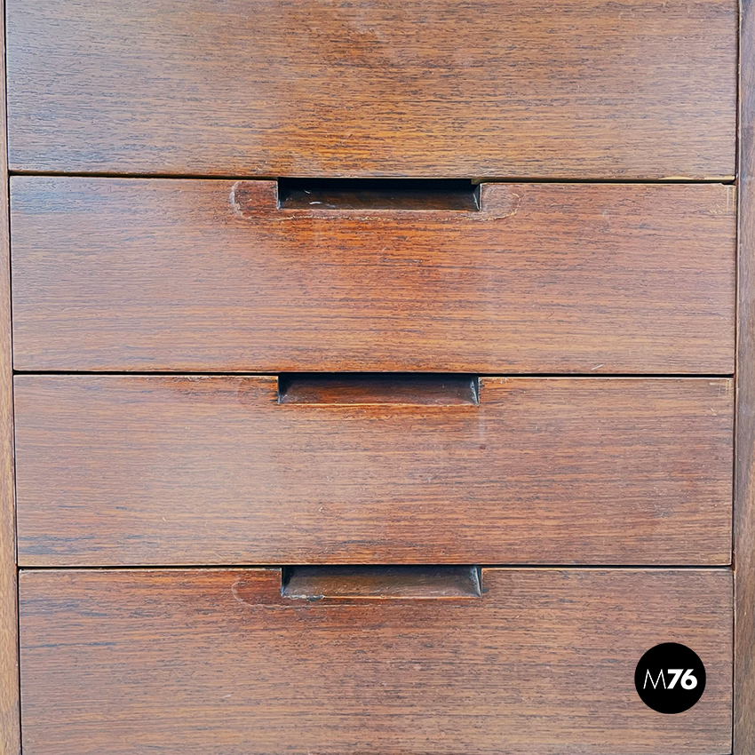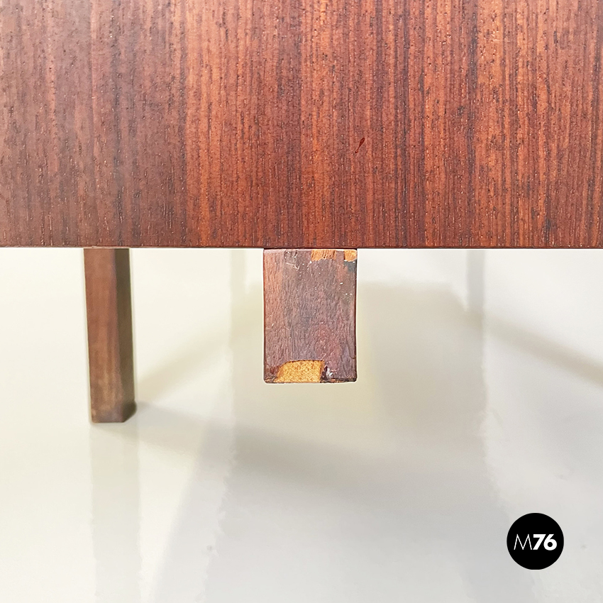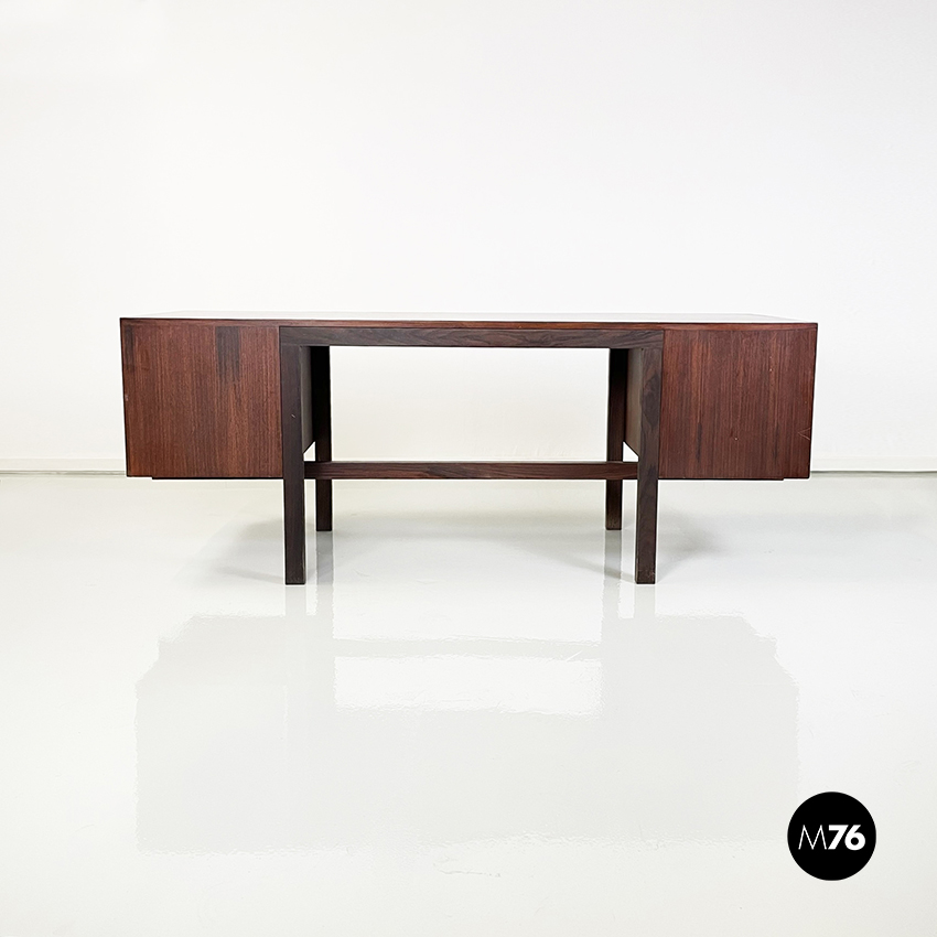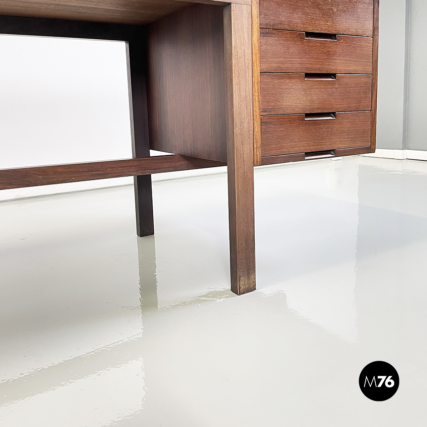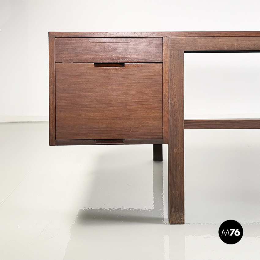 Scrivania modello Canaan con piano rettangolare in legno. Su un lato sono presenti due cassetti e sull’altro quattro. Presenta nella parte bassa una traversa in legno, utilizzabile per poggiare i piedi. Gambe a sezione rettangolare.