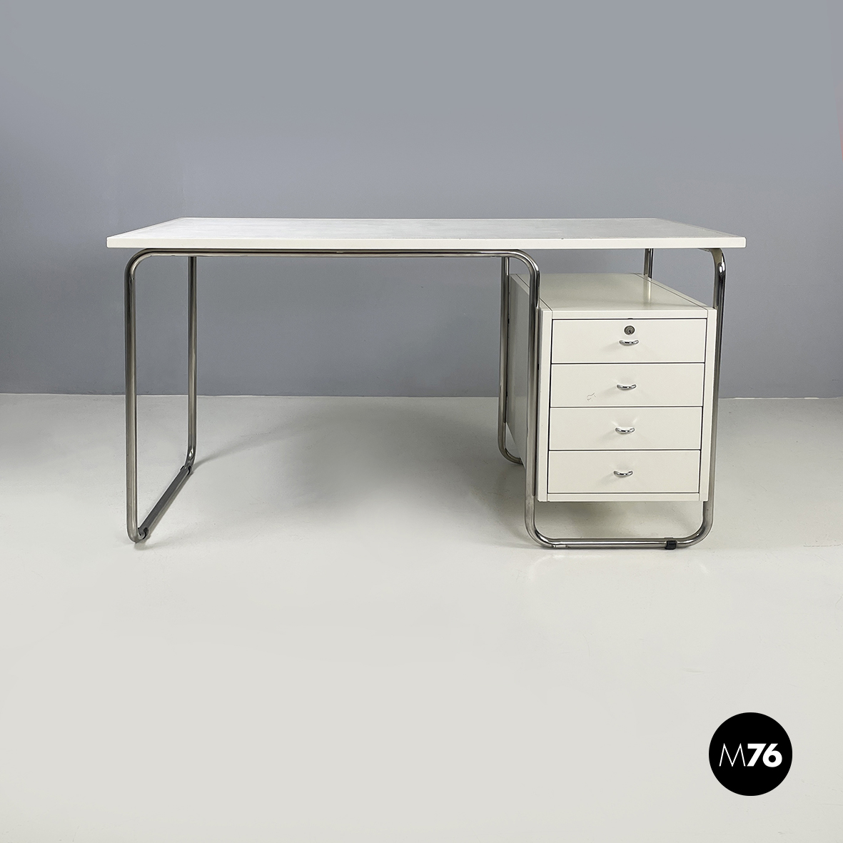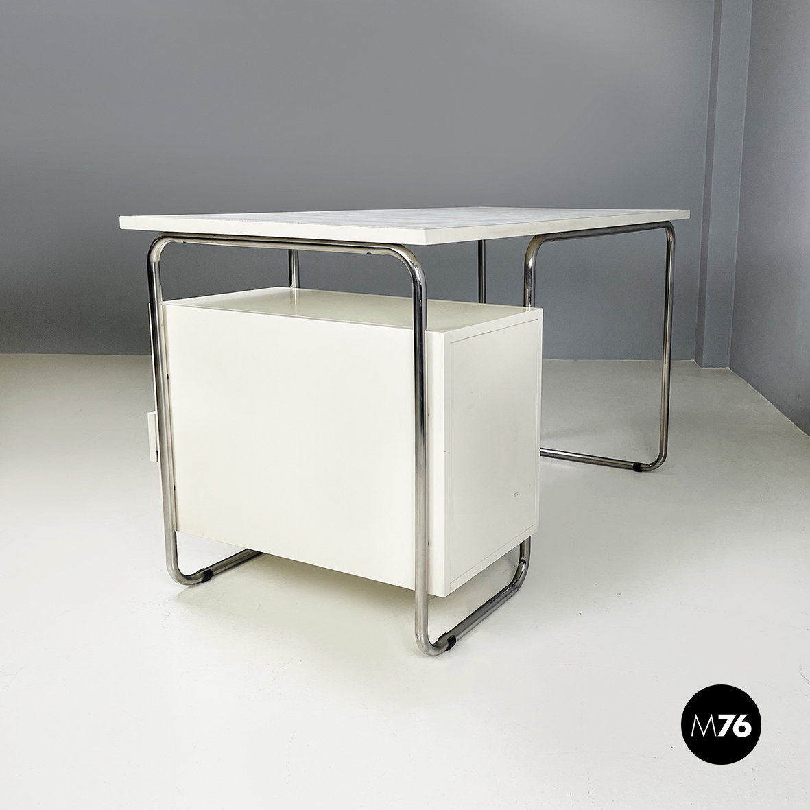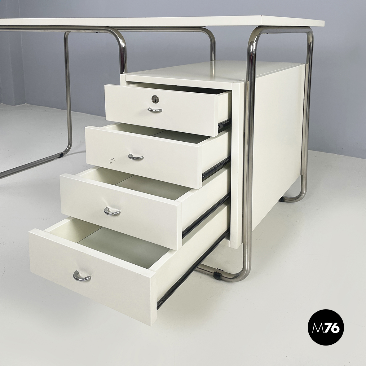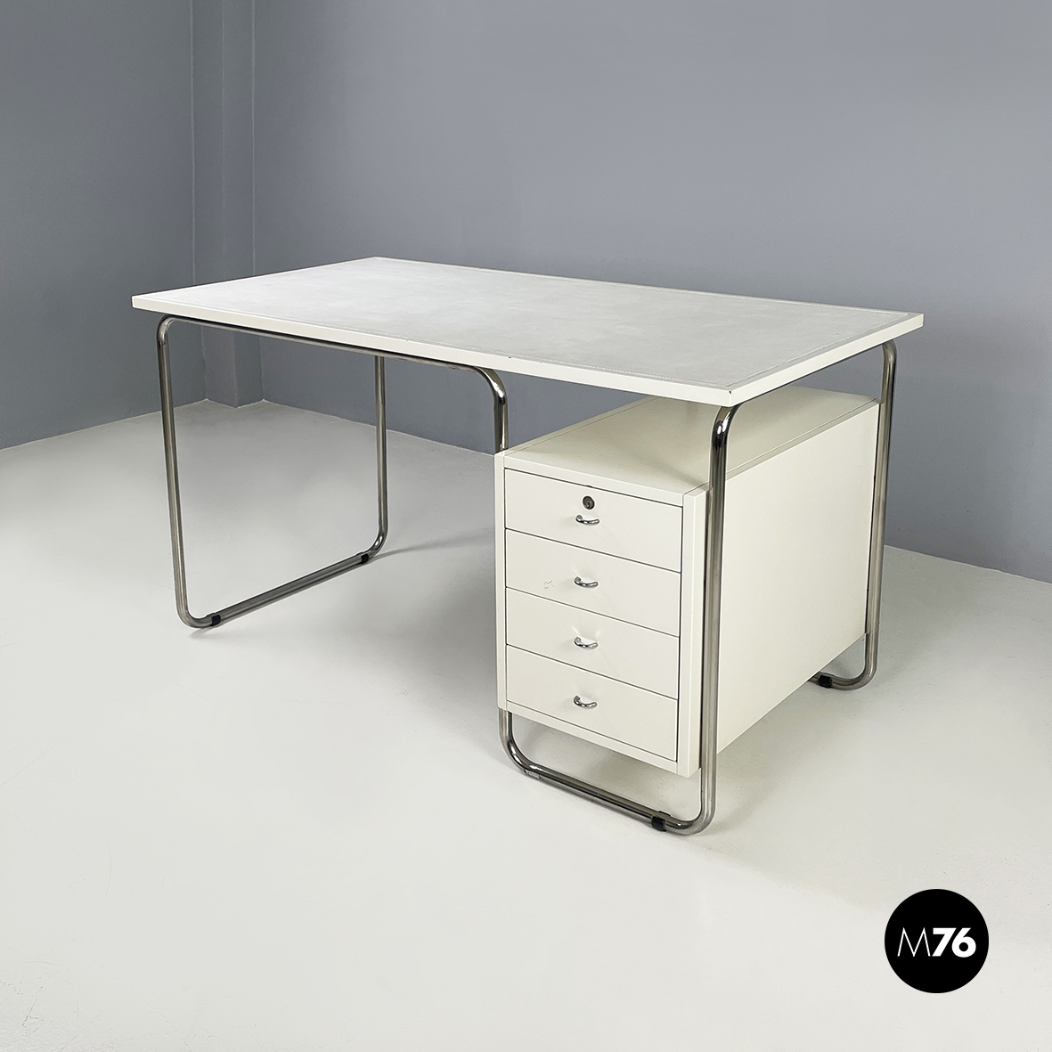 Scrivania modello Comacina con piano rettangolare in legno ed inserto rettangolare in pelle bianca. Sul lato è presente una cassettiera in legno verniciato bianco, la quale ha quattro cassetti con maniglie a semicerchio in metallo. La struttura è in tubolare di acciaio inox curvato. I cassetti possono essere posizionati sia sulla destra che sulla sinistra della seduta. Presenti in quattro piedini in gomma nera. Appartenente allo stile Bauhaus.