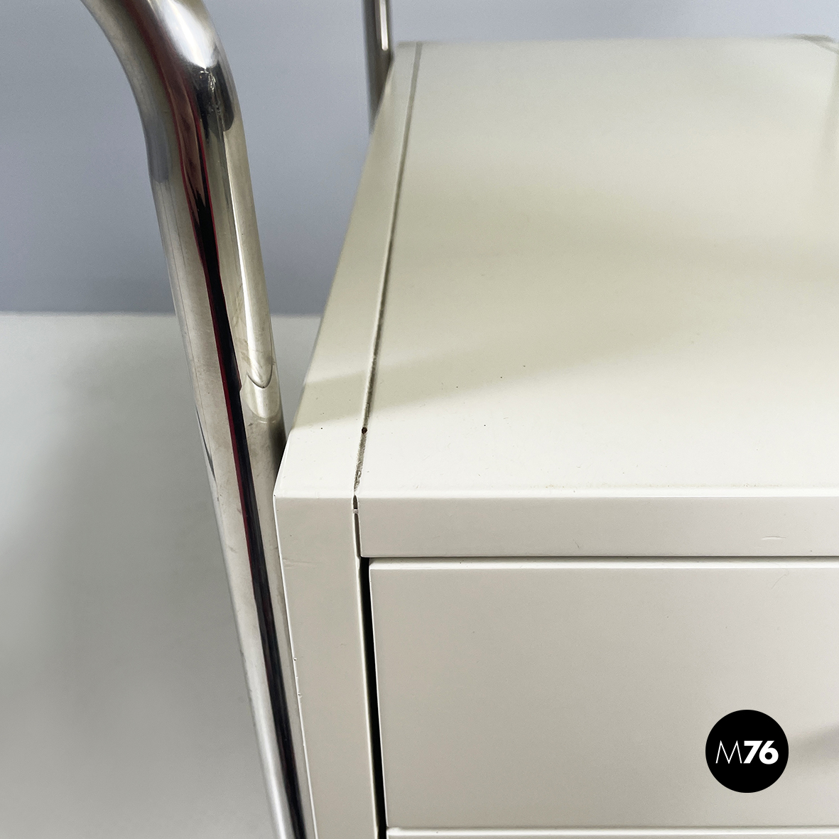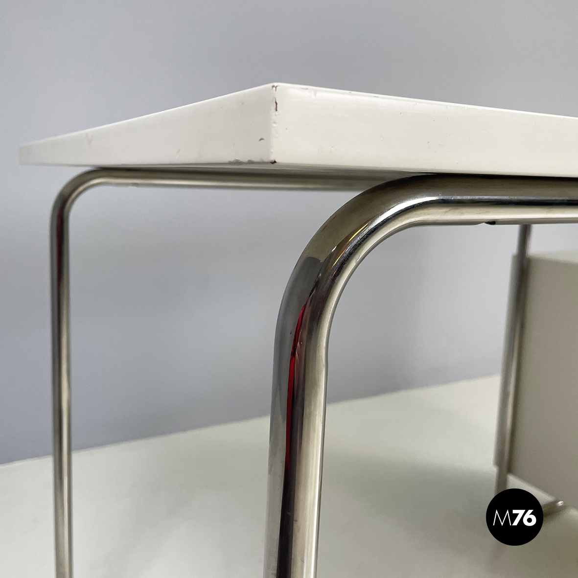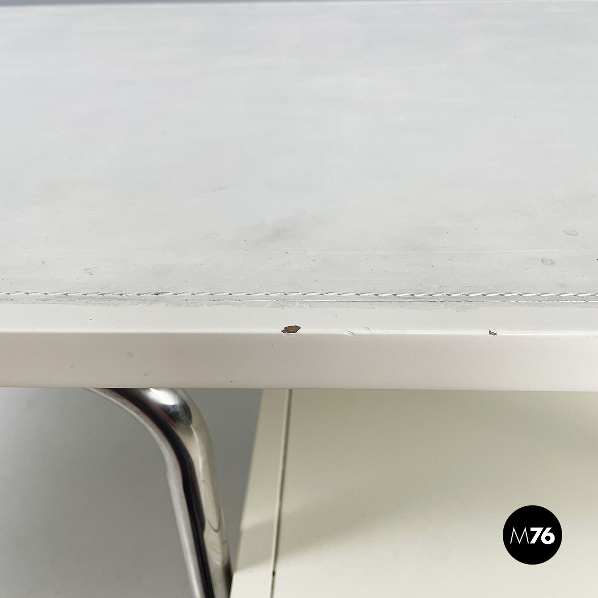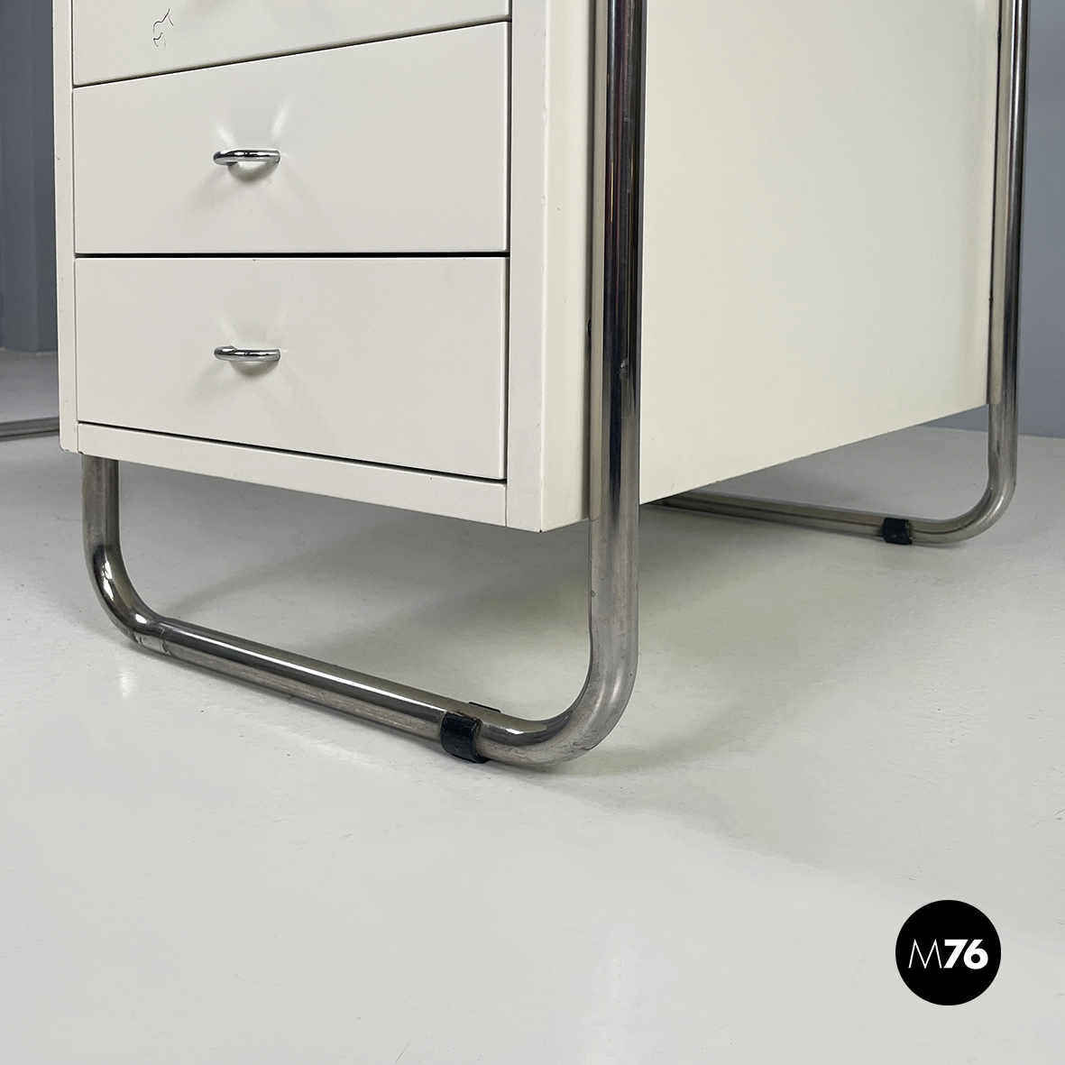 Scrivania modello Comacina con piano rettangolare in legno ed inserto rettangolare in pelle bianca. Sul lato è presente una cassettiera in legno verniciato bianco, la quale ha quattro cassetti con maniglie a semicerchio in metallo. La struttura è in tubolare di acciaio inox curvato. I cassetti possono essere posizionati sia sulla destra che sulla sinistra della seduta. Presenti in quattro piedini in gomma nera. Appartenente allo stile Bauhaus.